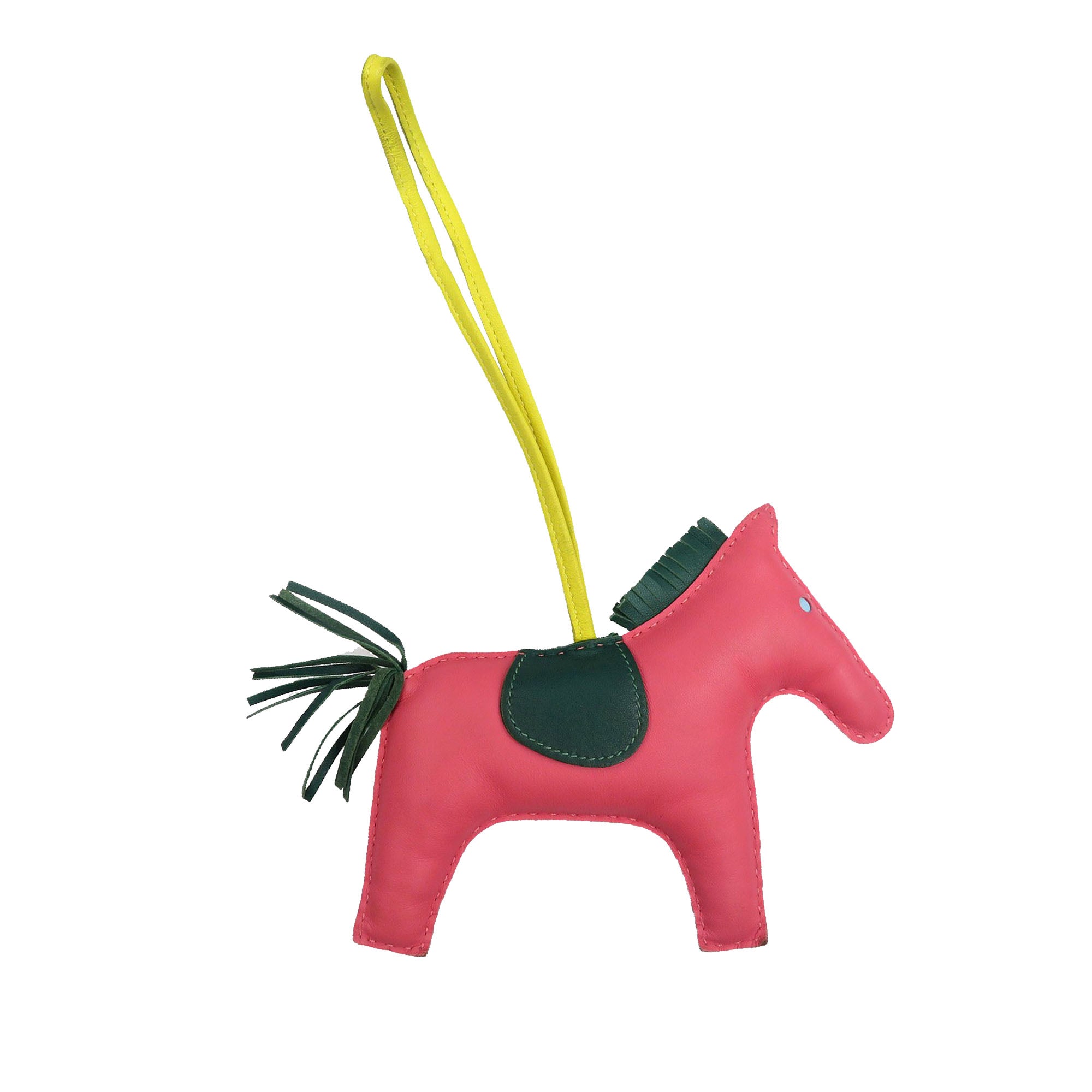 Product Details: Pink Hermès Milo Lambskin Grigri Rodeo Pegase Bag Charm GM Key Chain. The Rodeo Pegase bag charm features a Milo lambskin leather body, and a flat leather strap. 5.1" L x 6.3" W x 0" D.