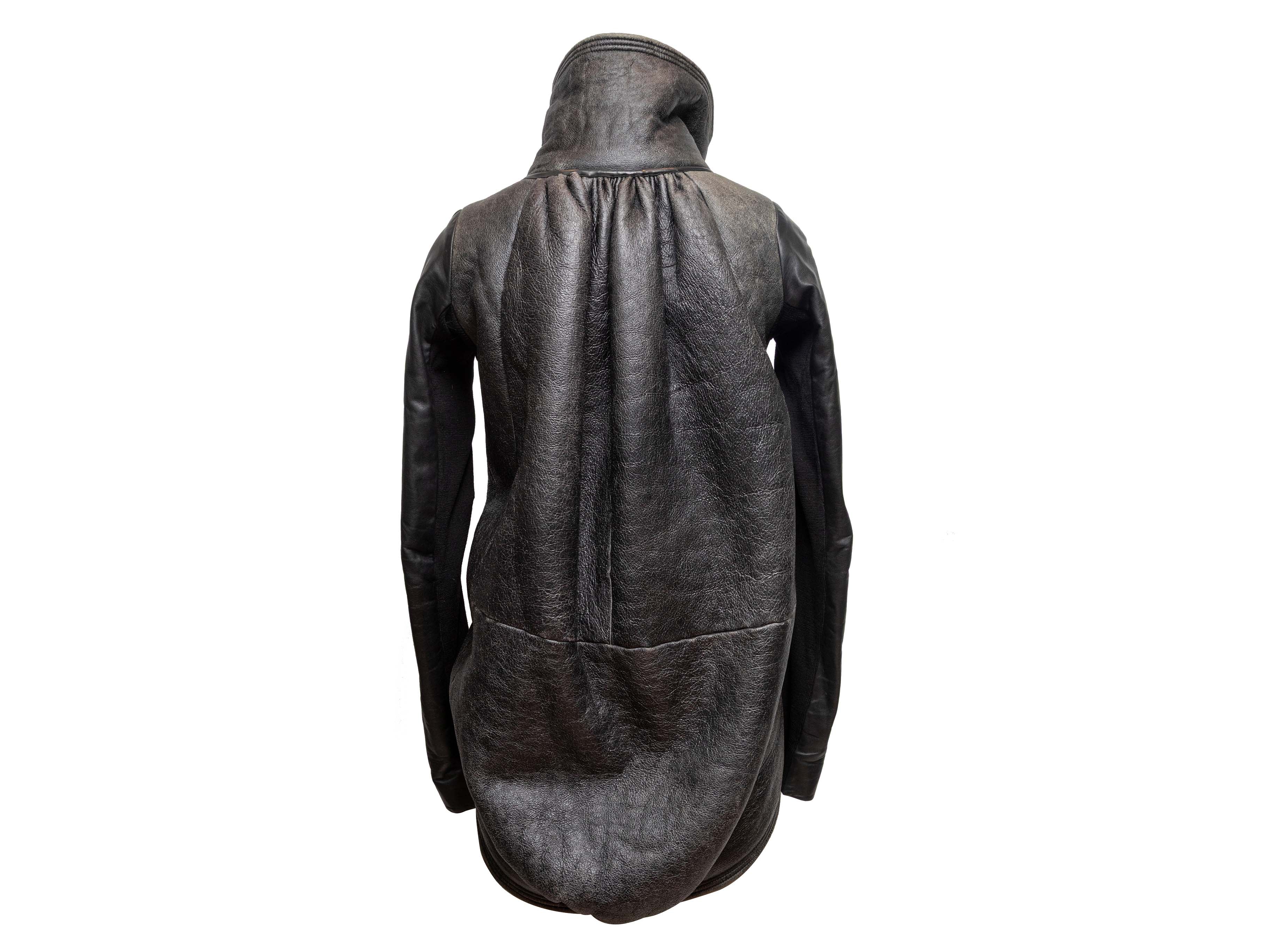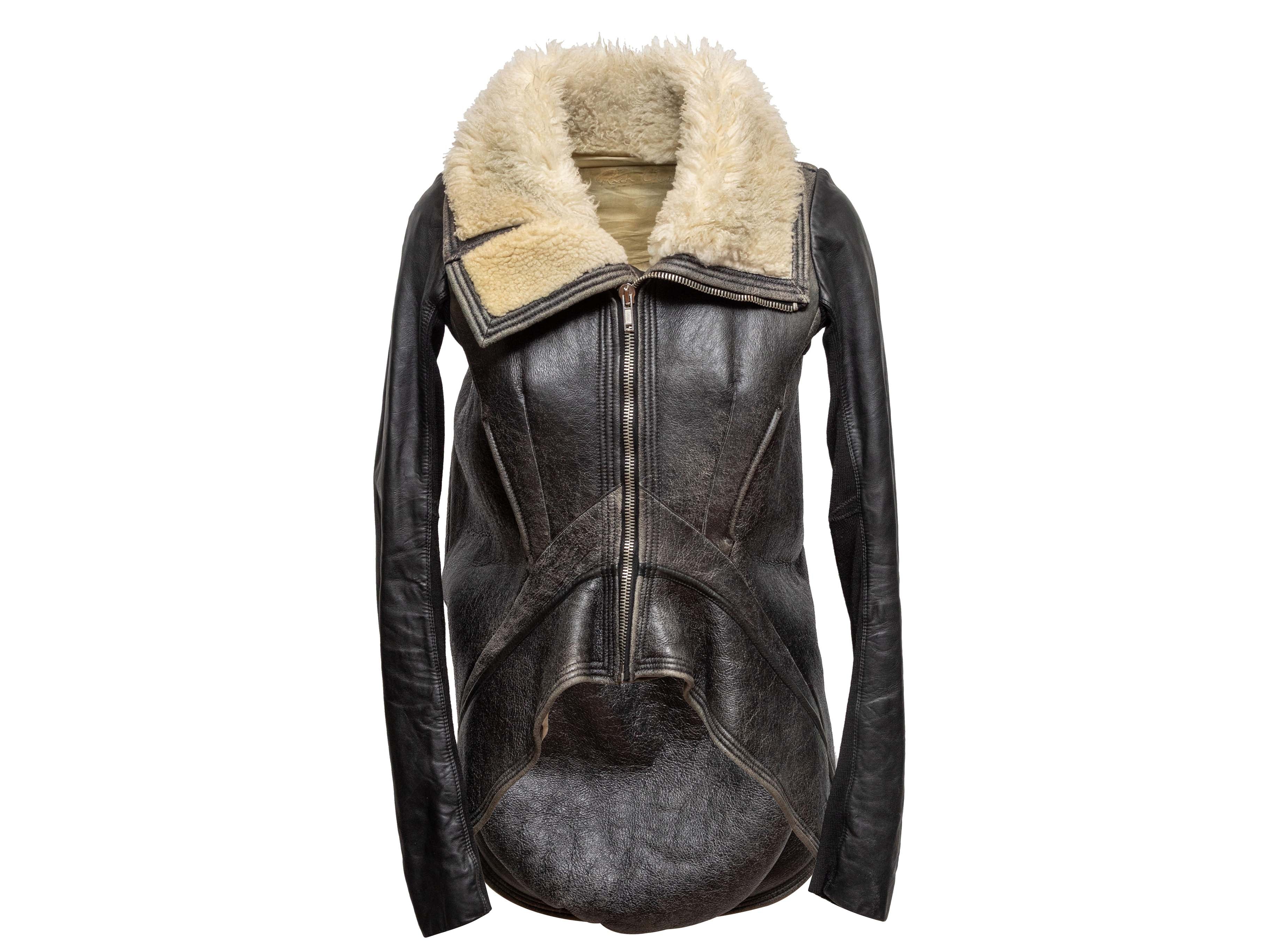Product Details: Black and beige high-low shearling jacket by Rick Owens. Foldover collar. Dual hip pockets. Front zip closure. 36" bust, 16" shoulder width, 27.5" sleeve length, 36.5" length.