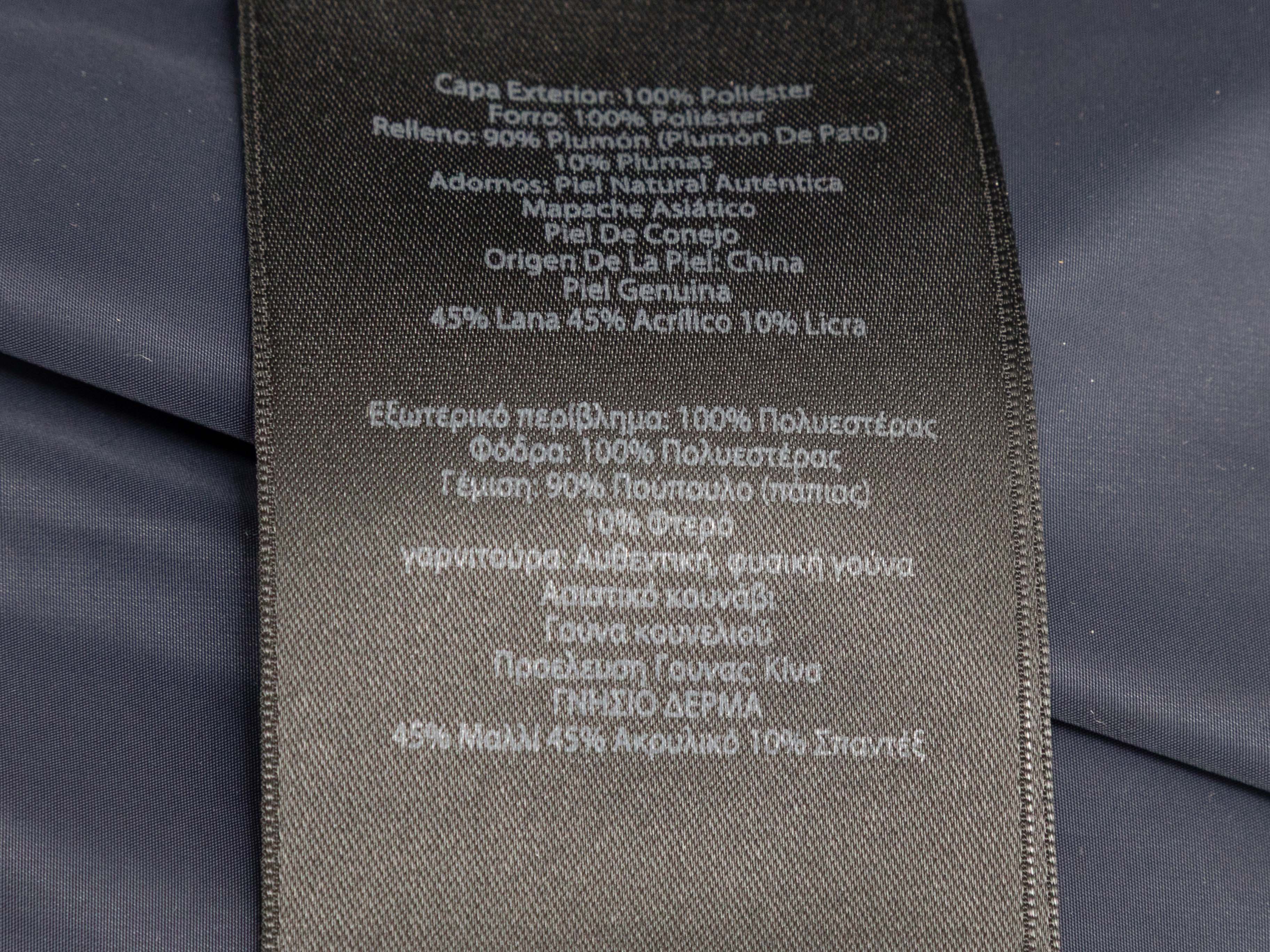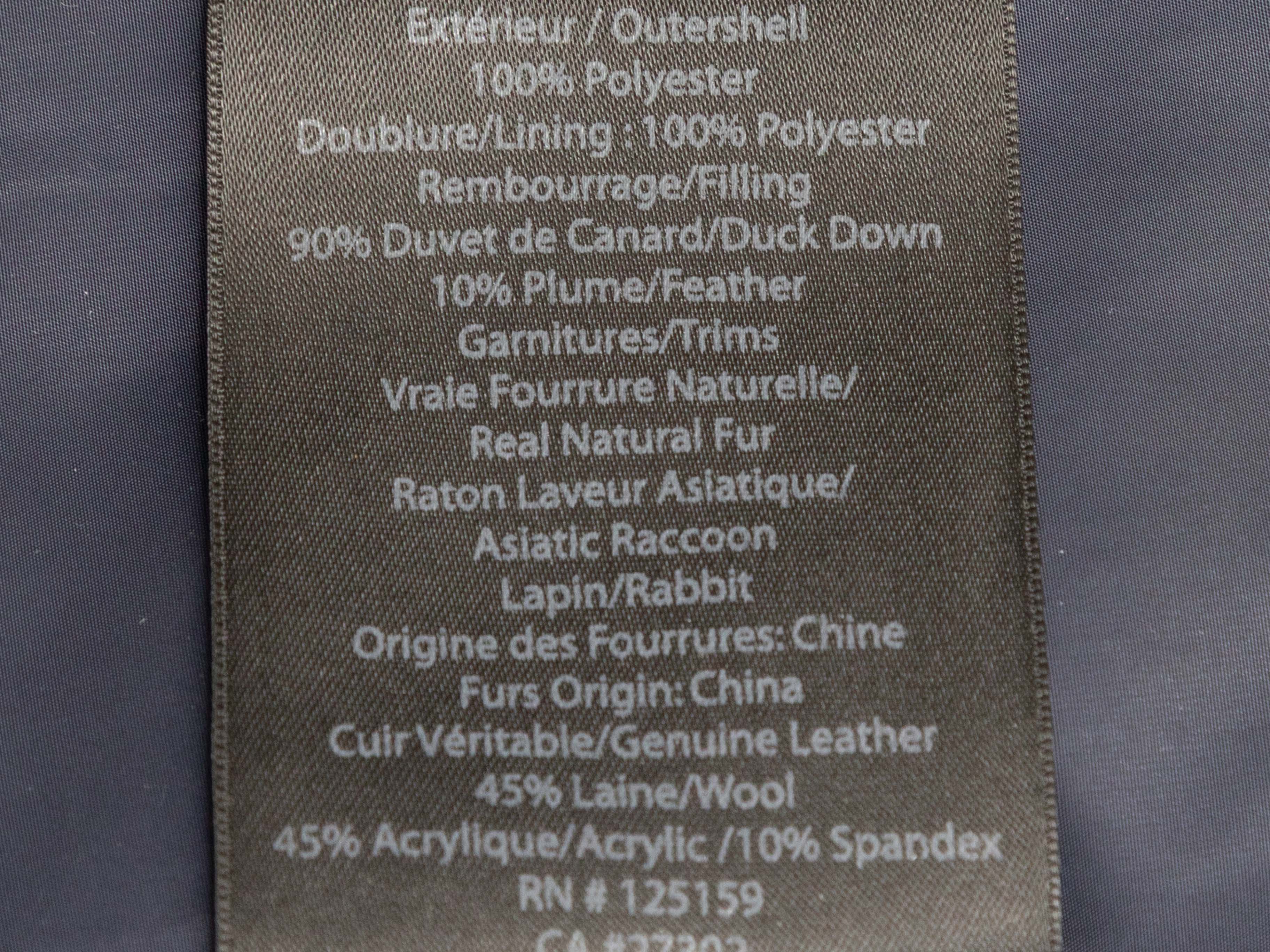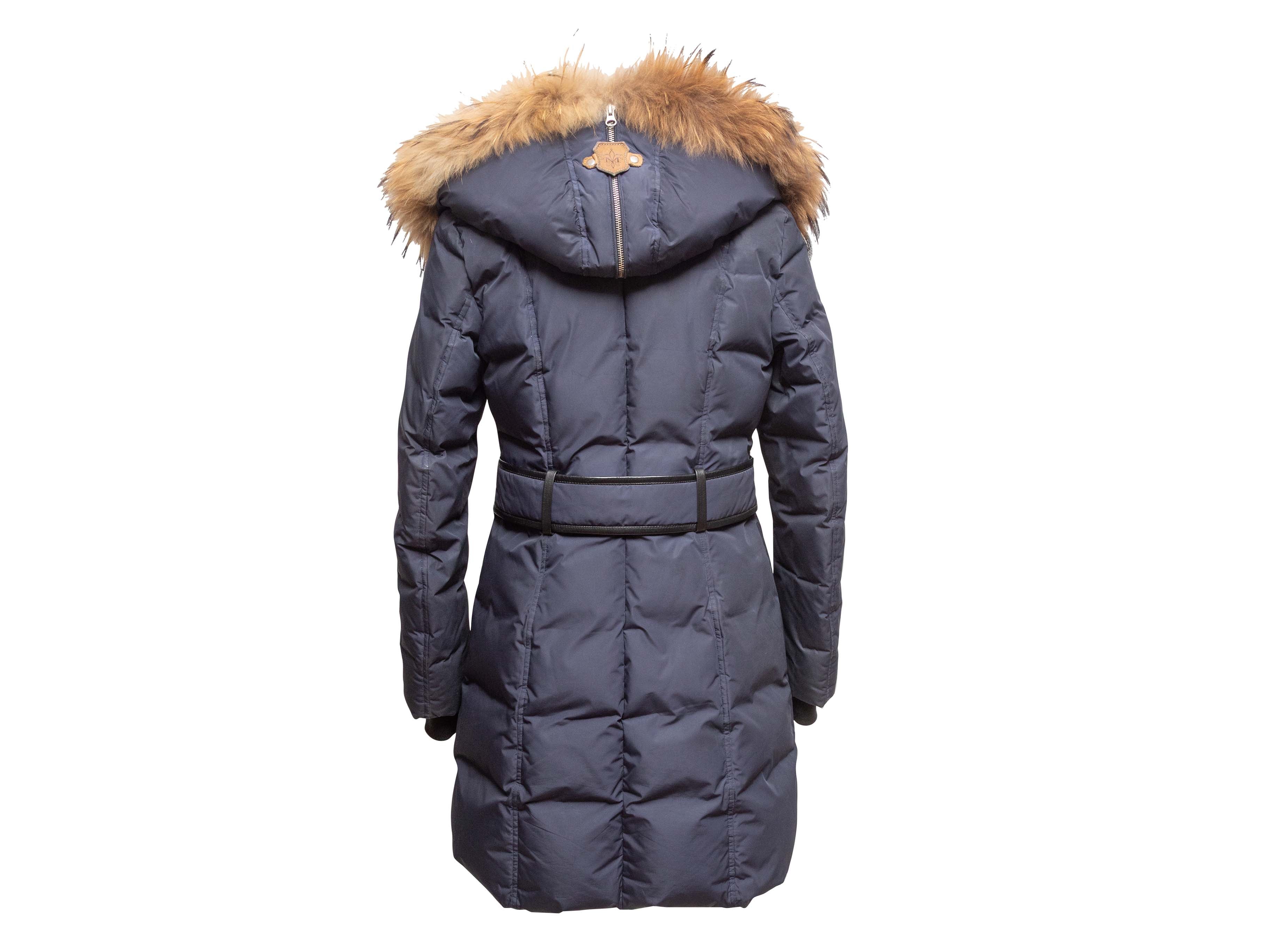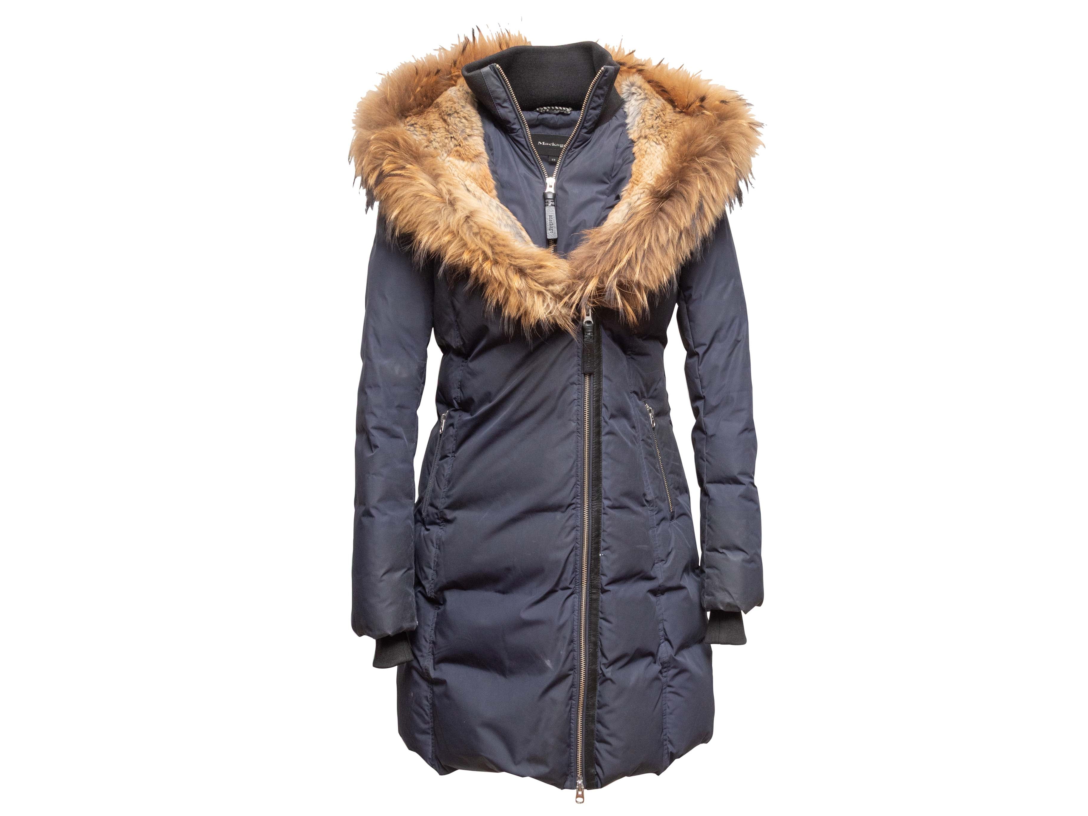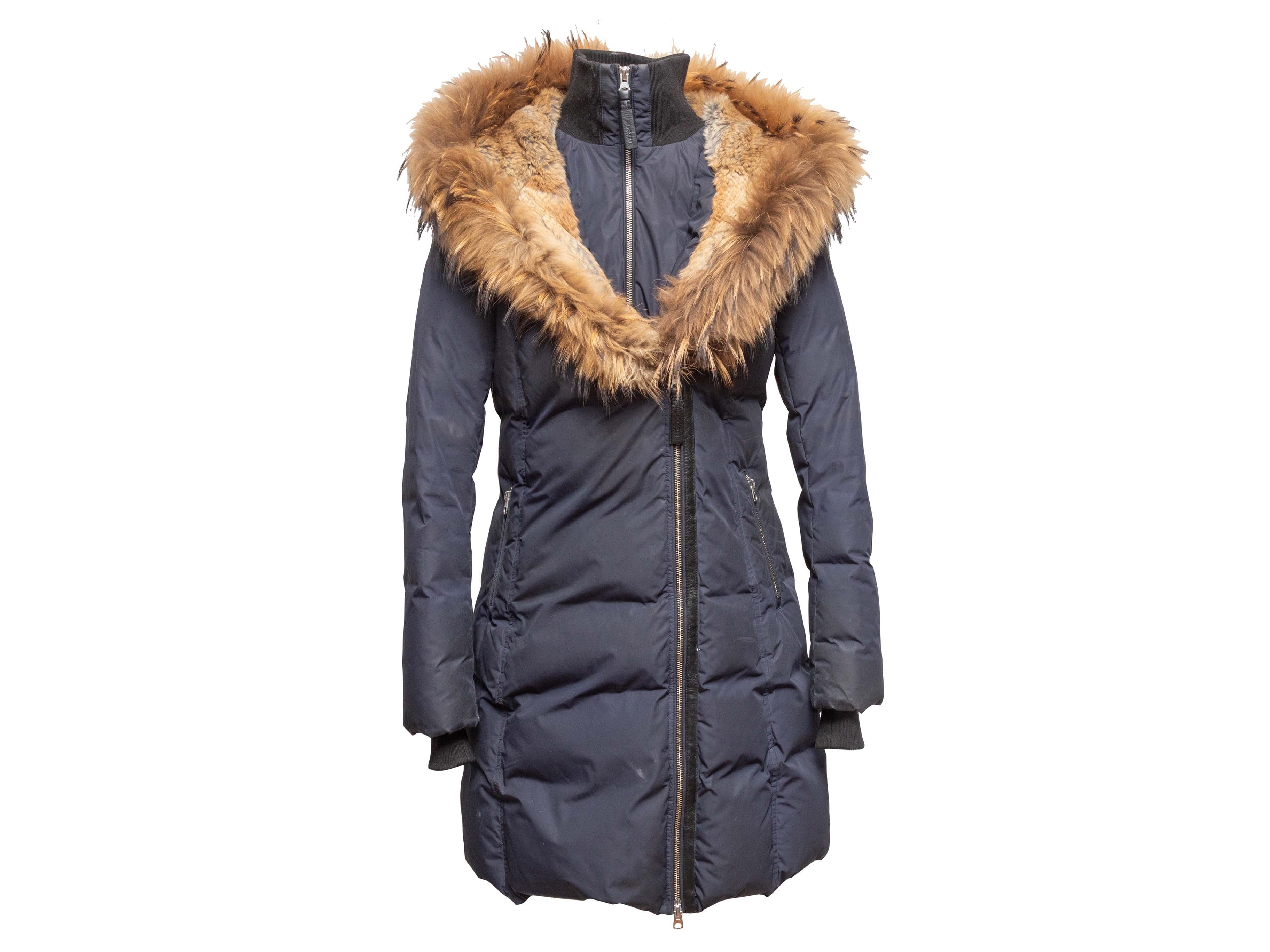 Product Details: Navy and brown fur-trimmed hooded down puffer coat by Mackage. Rib knit trim. Dual zip closure hip pockets. Zip closure at front. 37" bust, 19" shoulder width, 34.25" length.