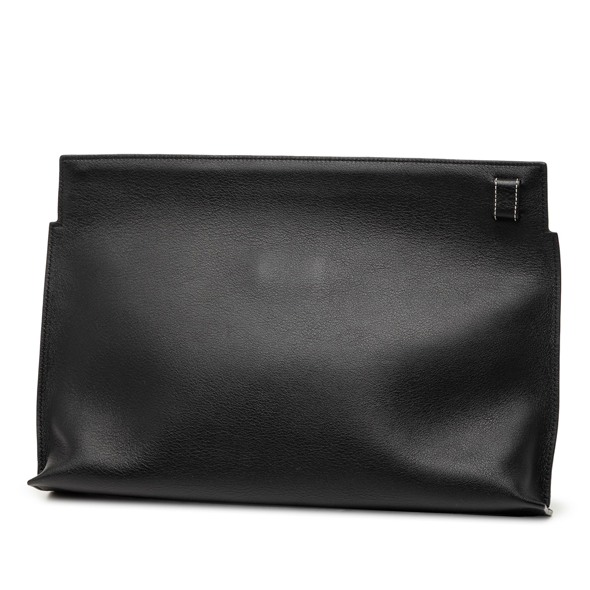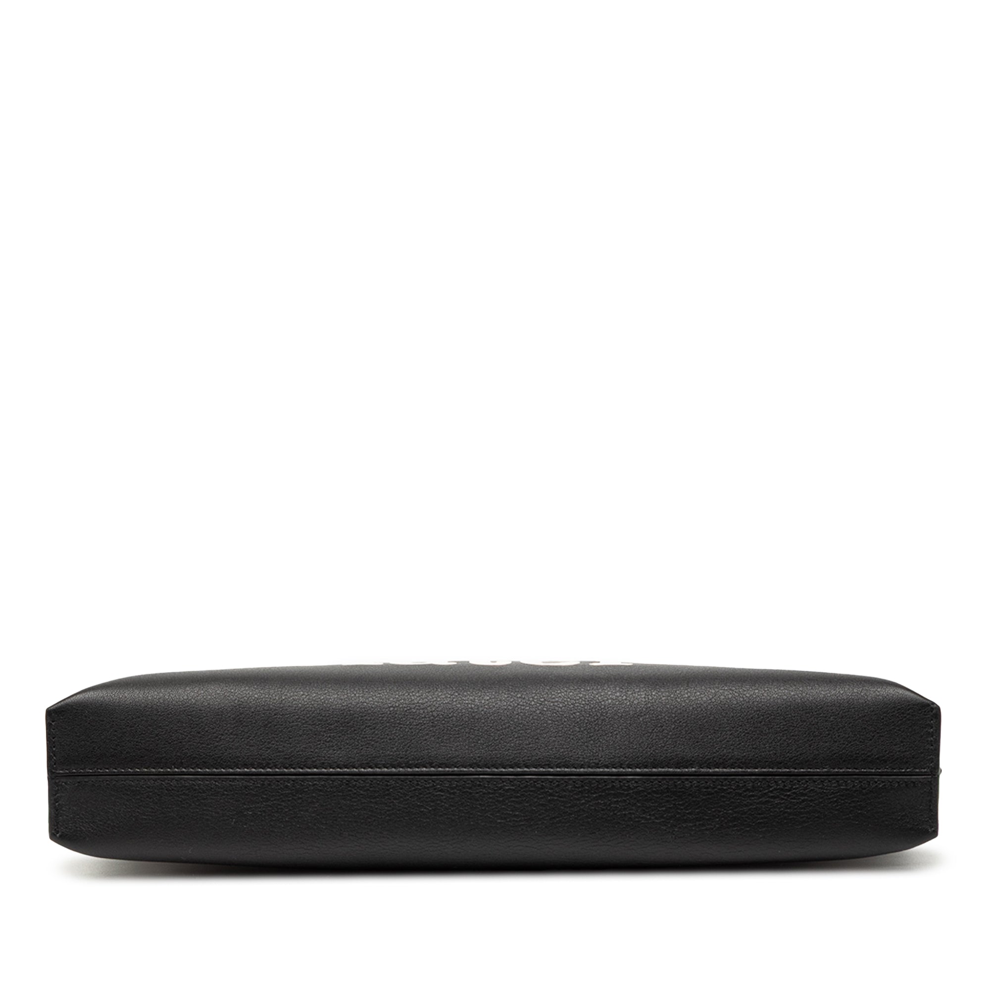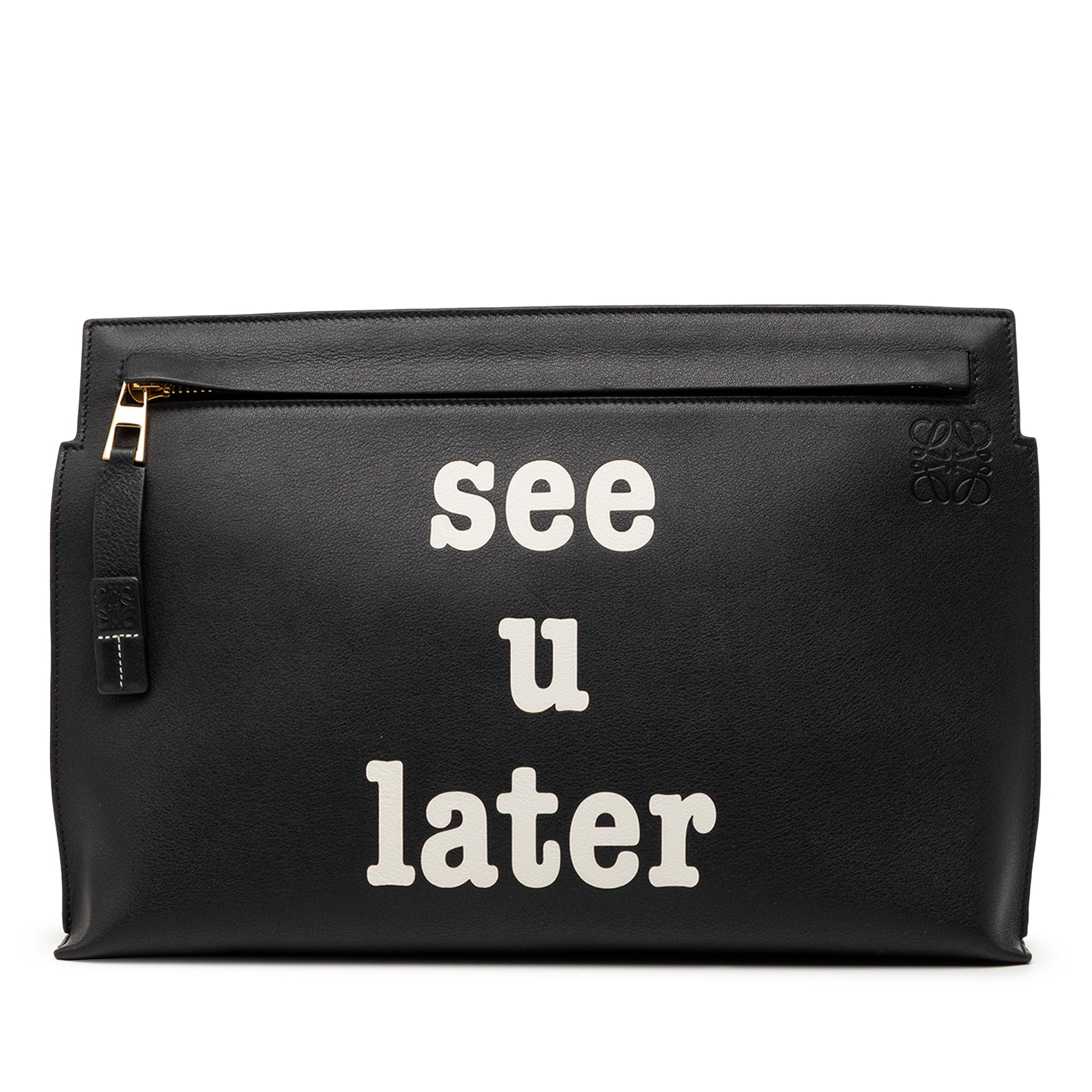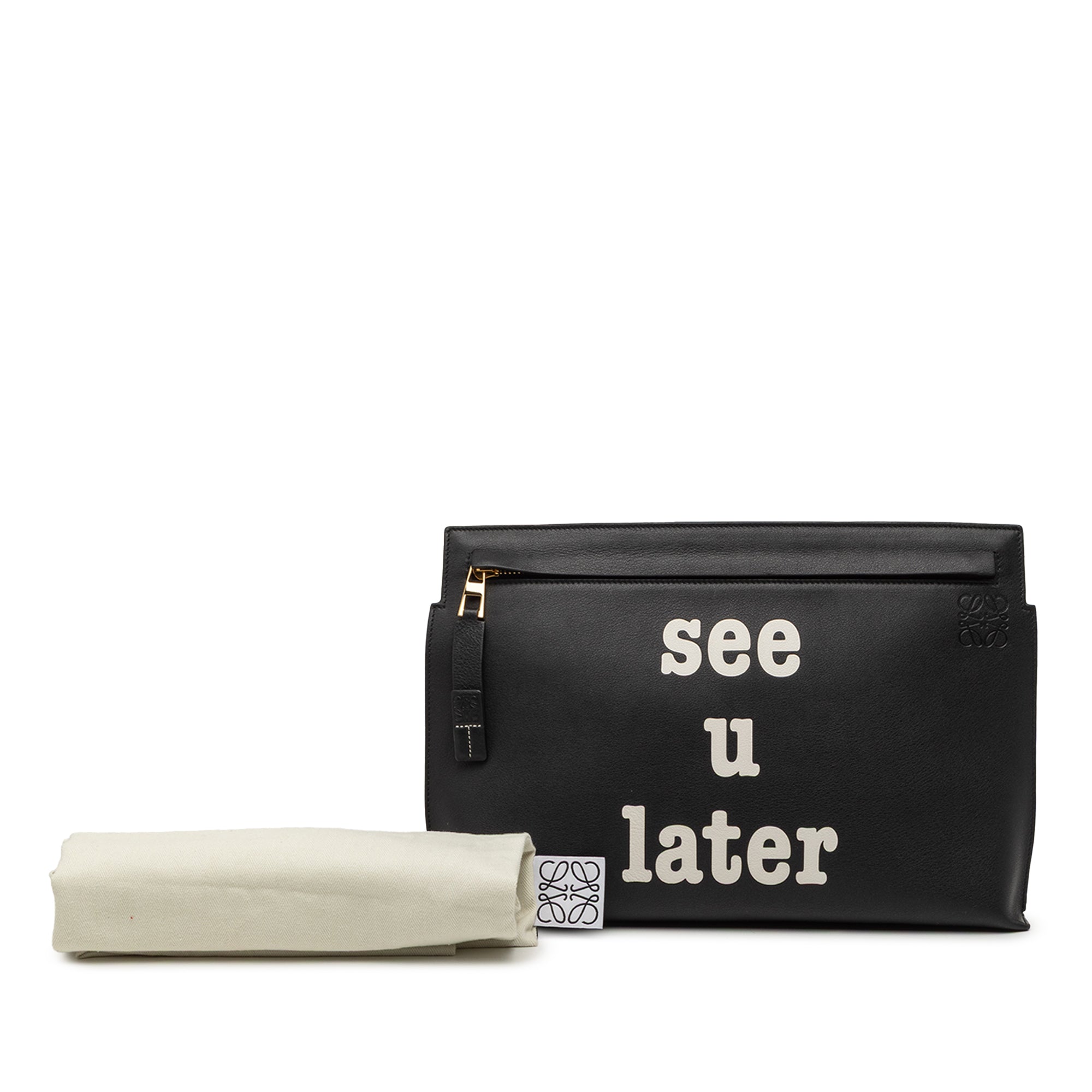 Product Details: Black LOEWE Calfskin Anagram See U Later T Pouch. This clutch bag features a calf leather body, a front zip closure, and an interior slip pocket. 7.7" L x 11.6" W x 1.8" D. Serial number 521701.