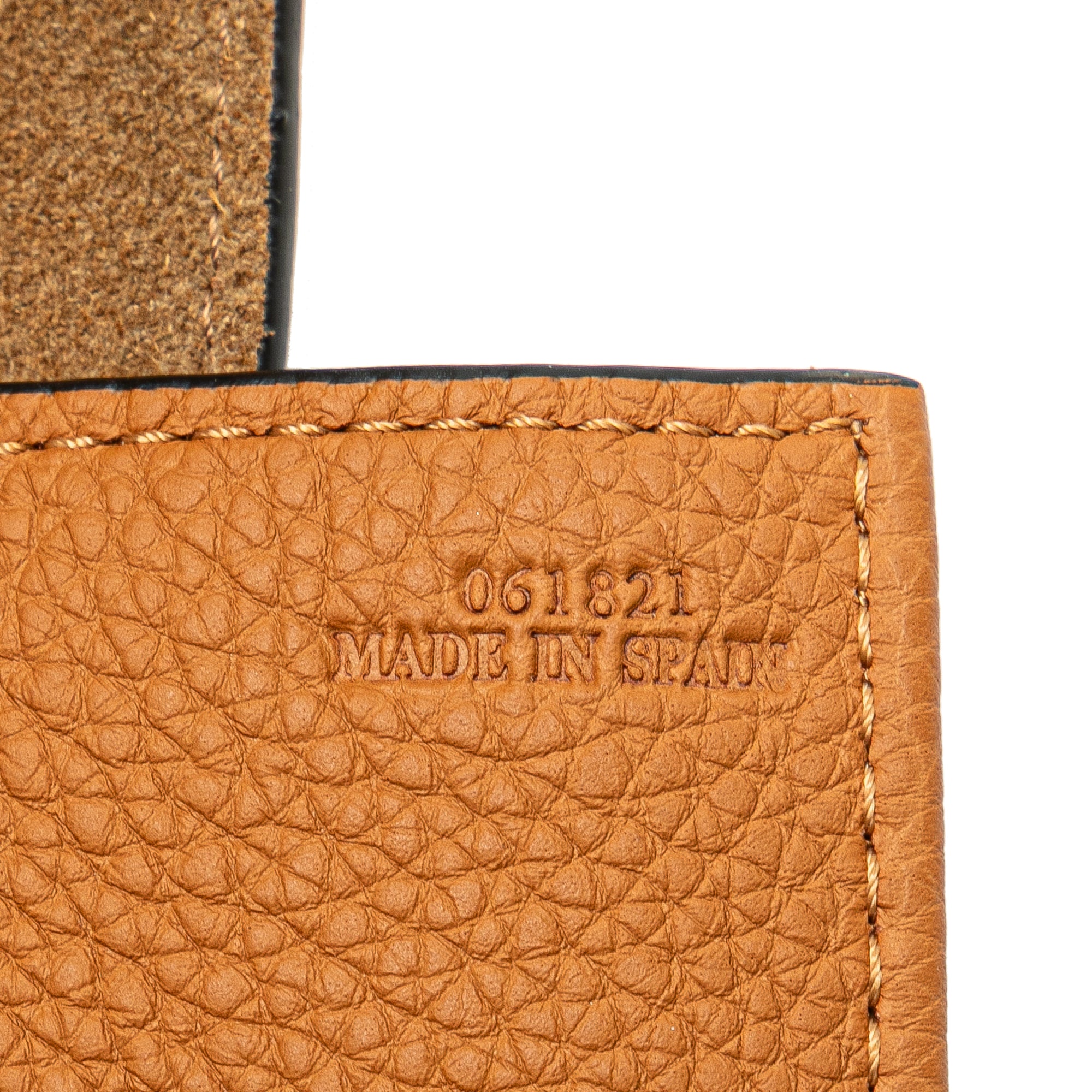 Product Details: Brown LOEWE Medium Leather Flamenco Knot Tote. The Flamenco Knot features a leather body, rolled leather straps, an open top with magnetic snap closure, and interior zip and slip pockets. 13.4" L x 11.8" W x 4.3" D. Serial number 061821.