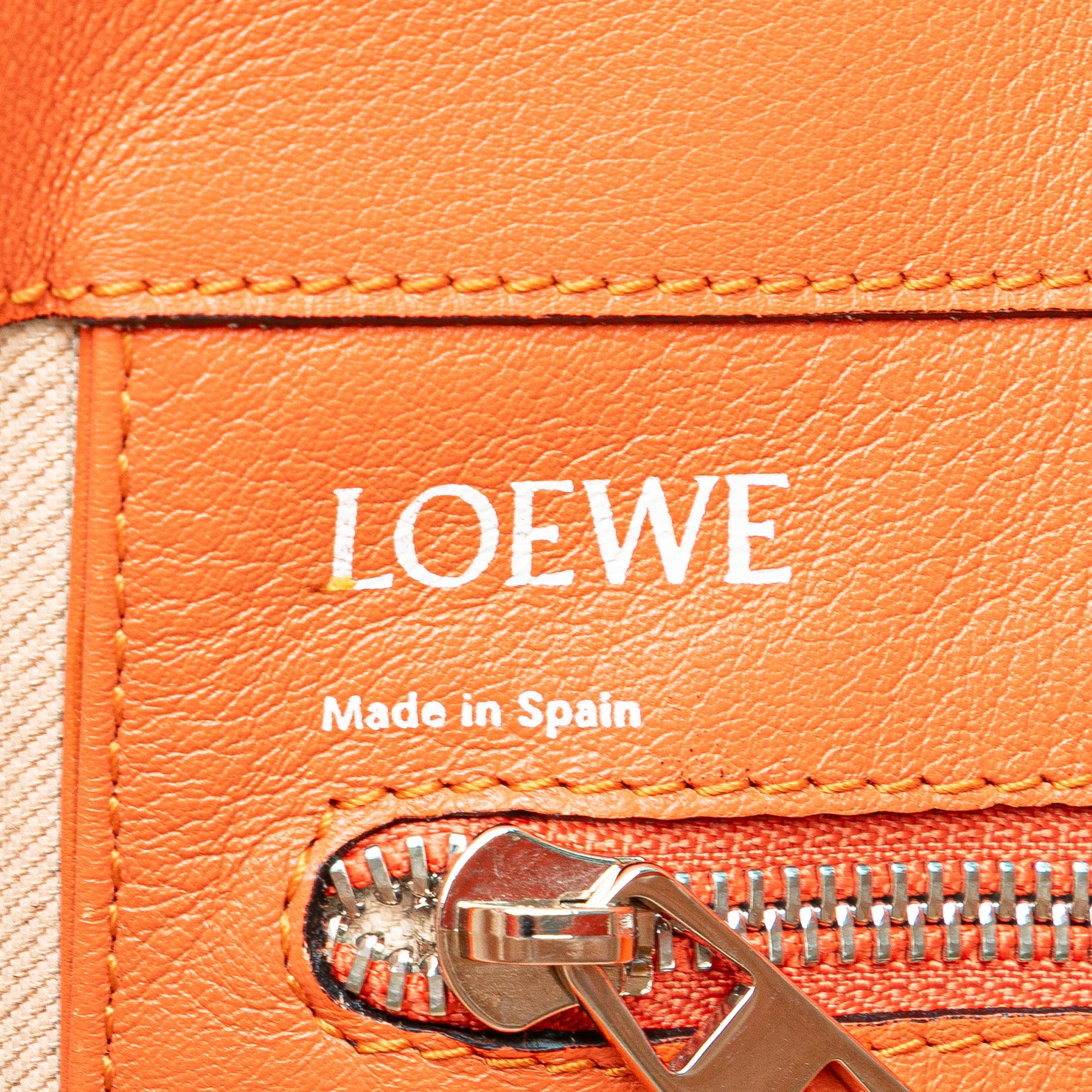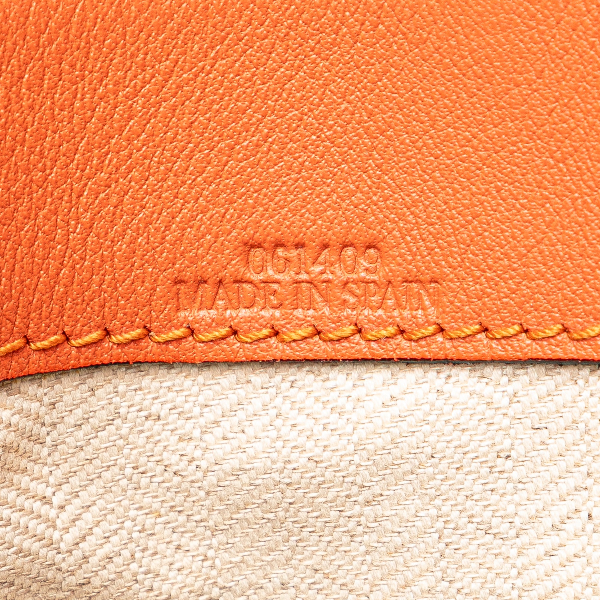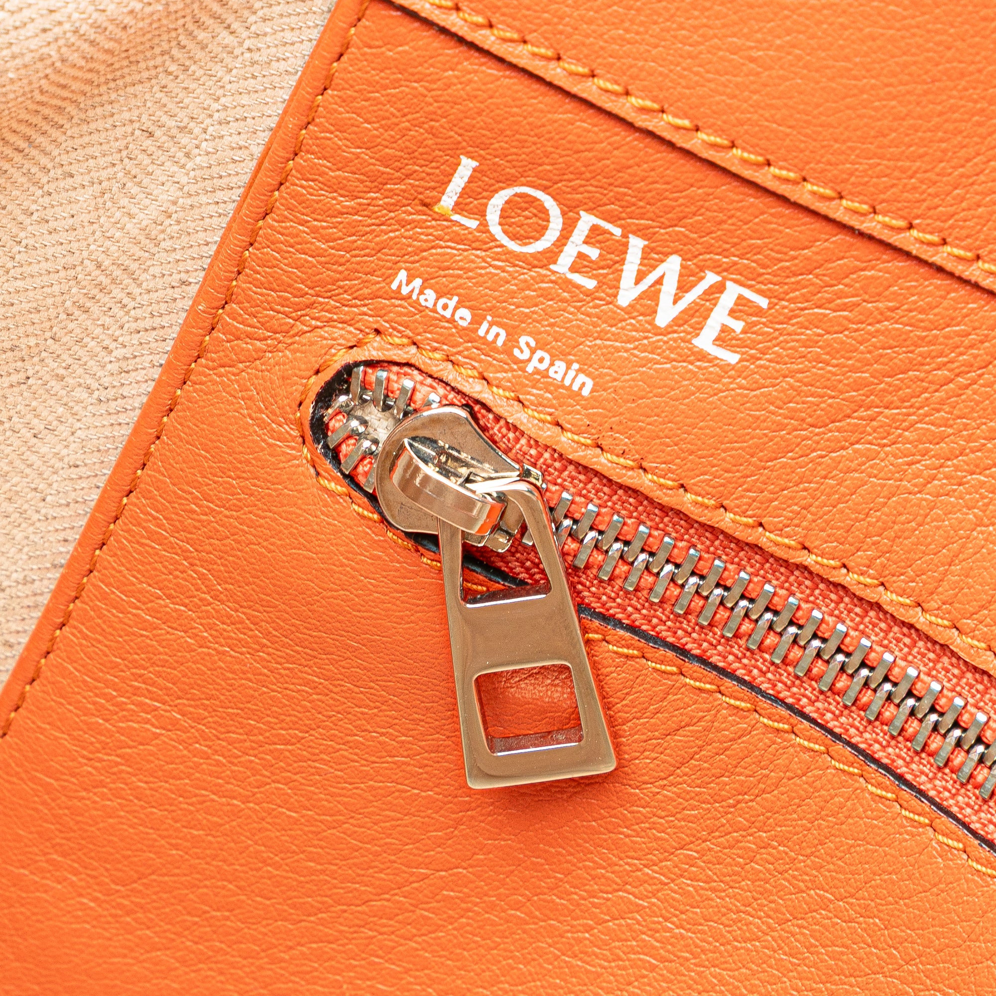 Product Details: Orange LOEWE Anagram Leather East West Tote. This tote features a leather body, flat leather straps, an open top, and an interior zip pocket. 8.7" L x 11.8" W x 4.7" D. Serial number 061409.