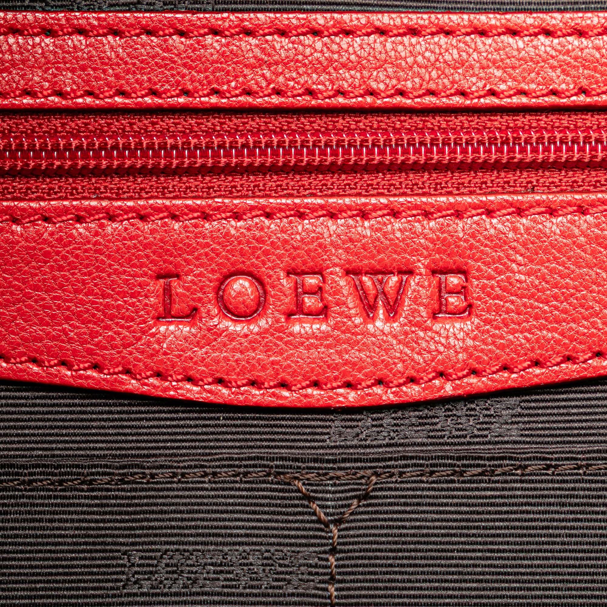 Product Details: Red LOEWE Nubuck Senda Handbag. The Senda features a nubuck leather body, rolled leather handles, a top zip with top strap and buckle closure, and interior zip and slip pockets. 7.1" L x 15" W x 3.9" D, 5.9" drop. Serial number 060406.