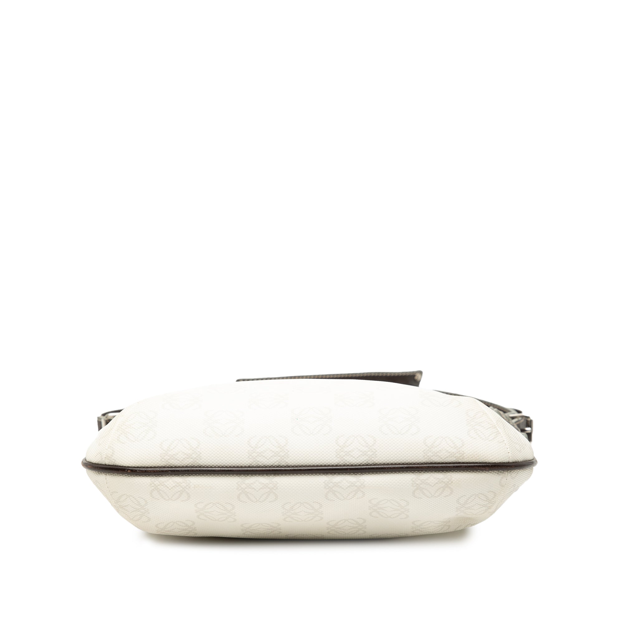 Product Details: White LOEWE Anagram Coated Canvas Crossbody. This crossbody features a coated canvas body with leather trim, a flat leather shoulder strap, a top zip closure, a detachable exterior flap pouch, and an interior zip pocket. 10.6" L x 9.1" W x 1.6" D. Serial number 330611.