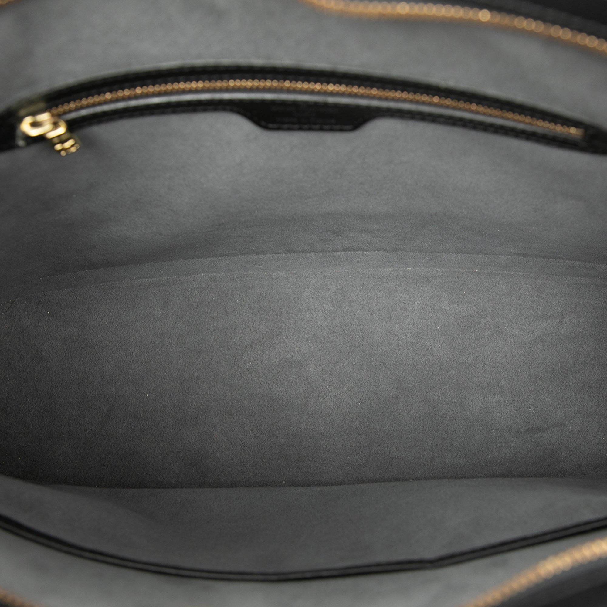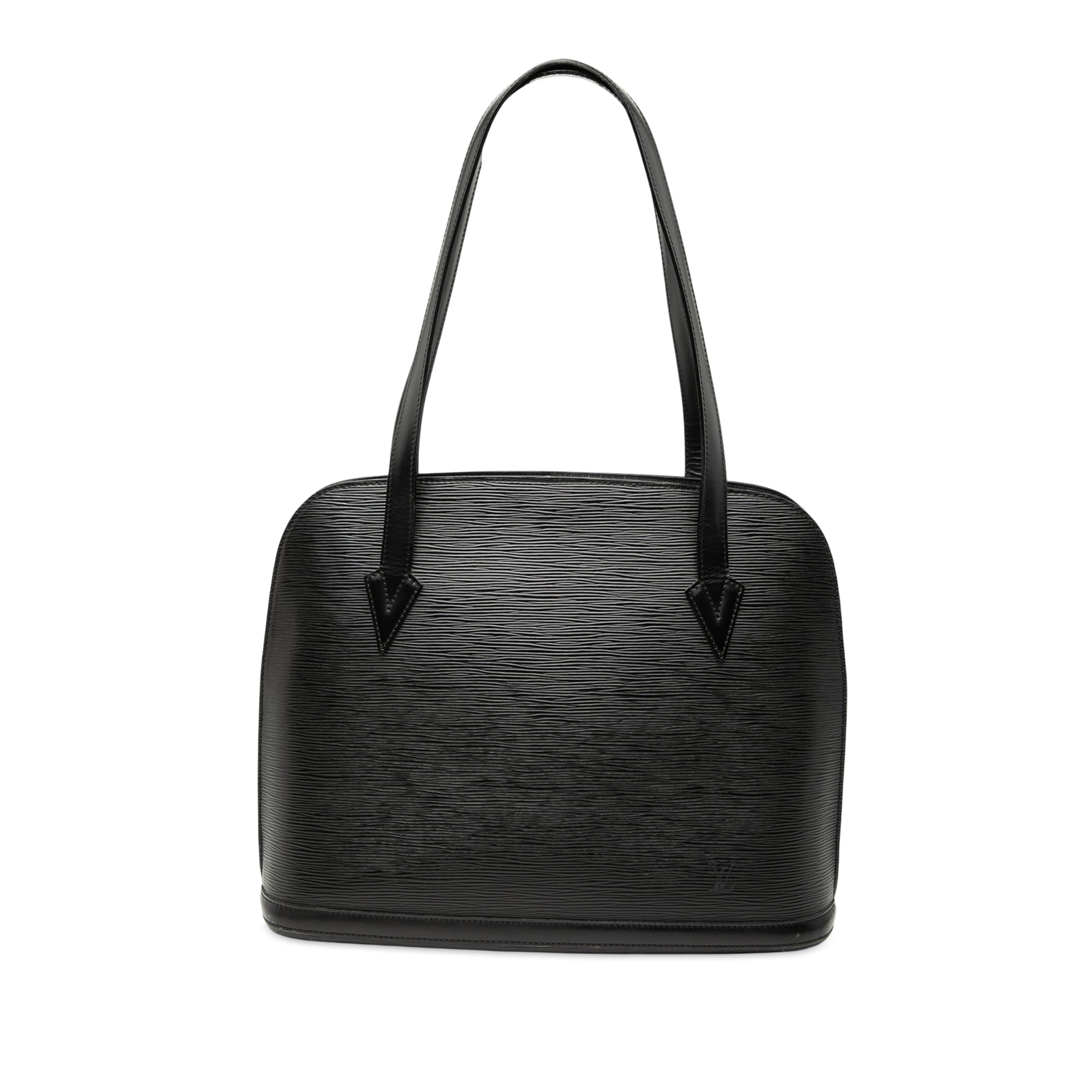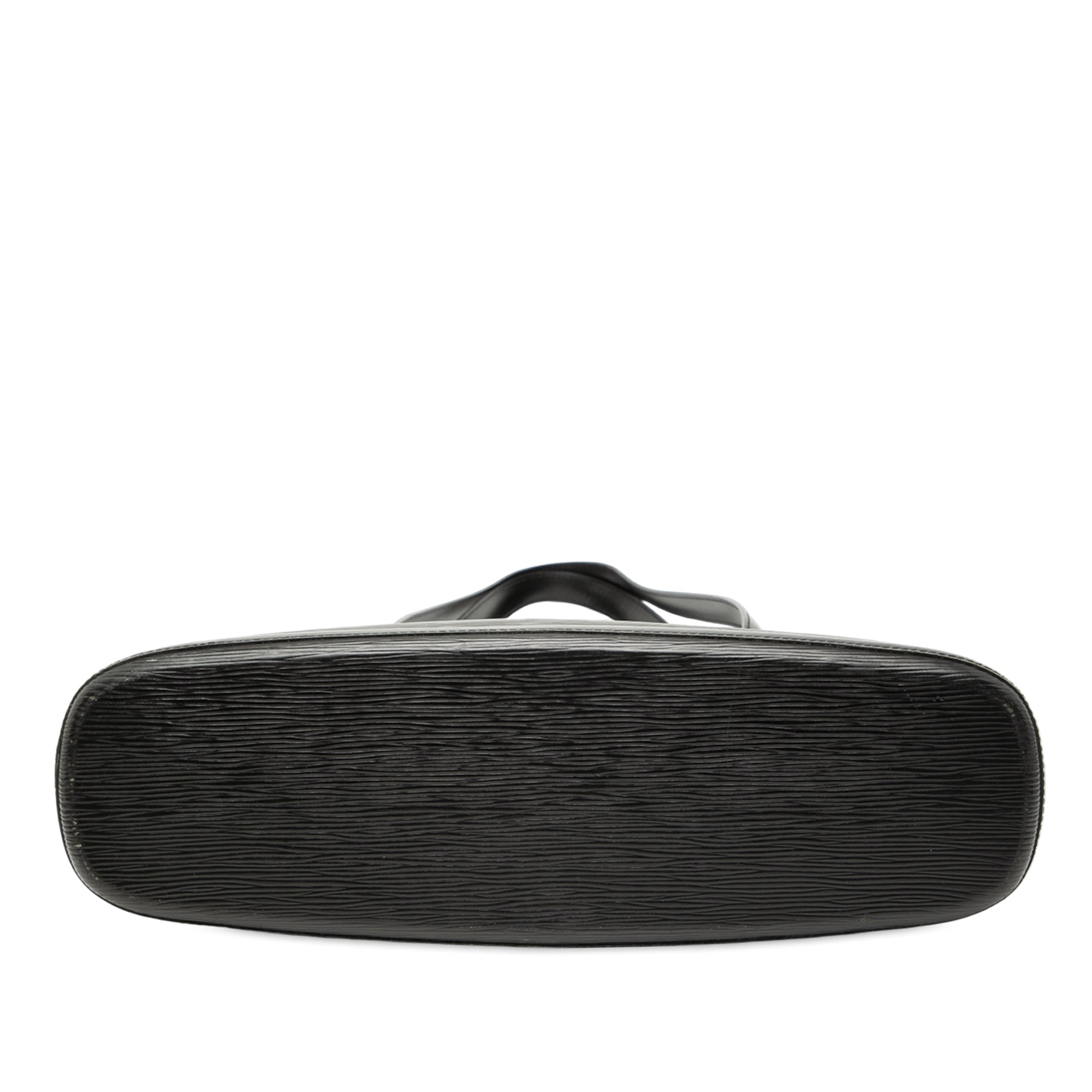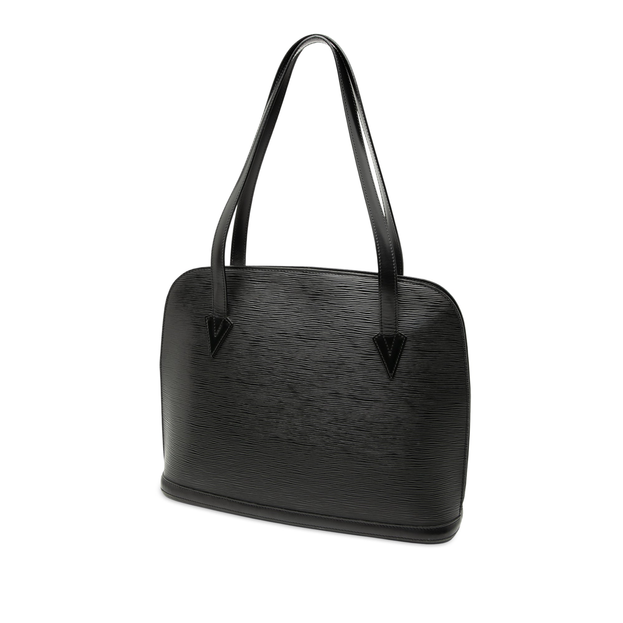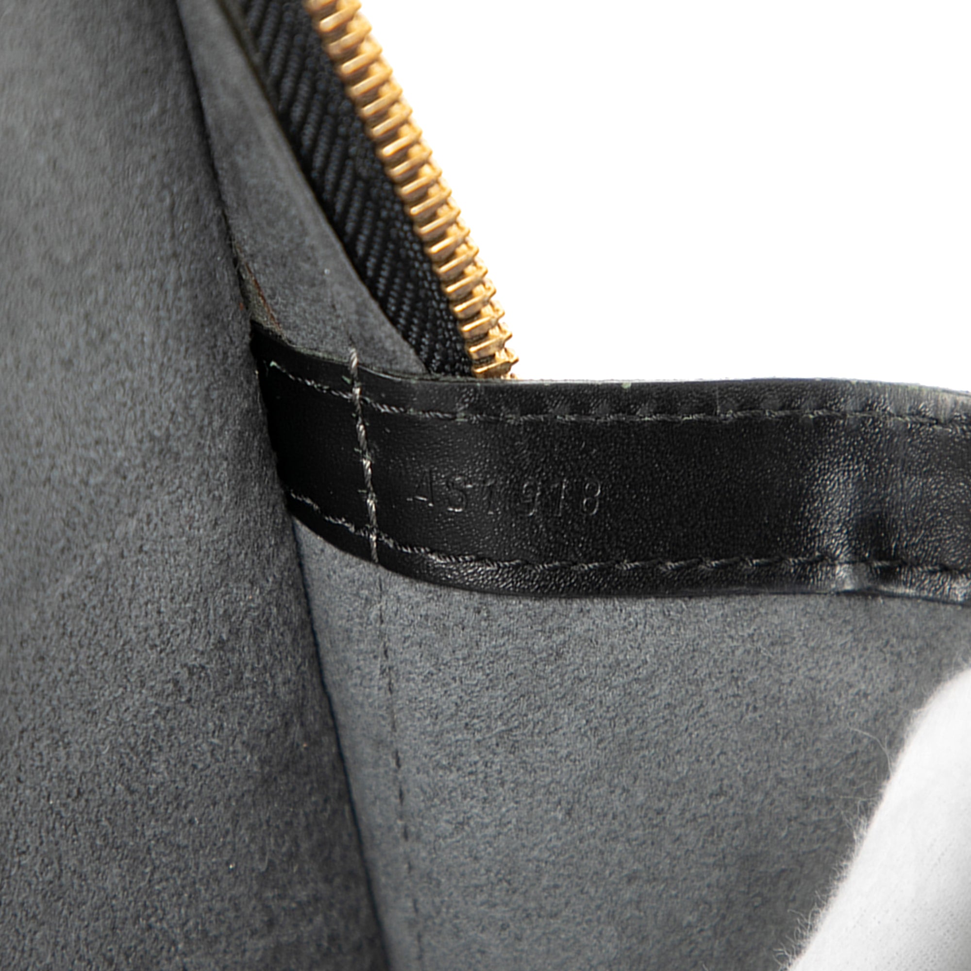 Product Details: Black Louis Vuitton Epi Lussac Shoulder Bag. The Lussac features an epi leather body, flat straps, a top zip closure, and interior zip and slip pockets. 12" L x 14.8" W x 4.7" D, 10.4" drop. Serial number AS1918.