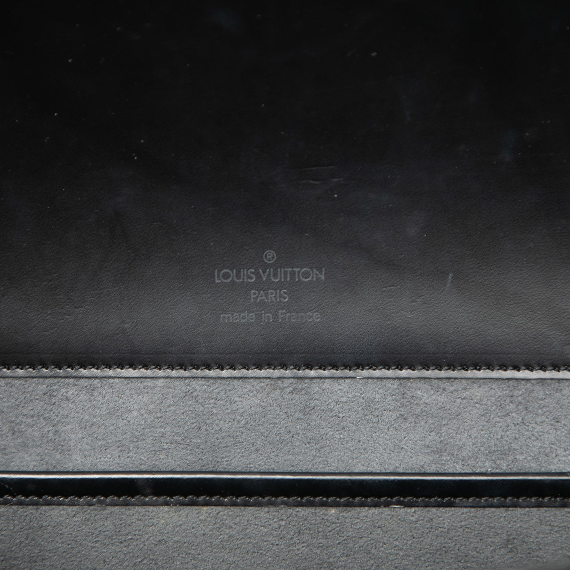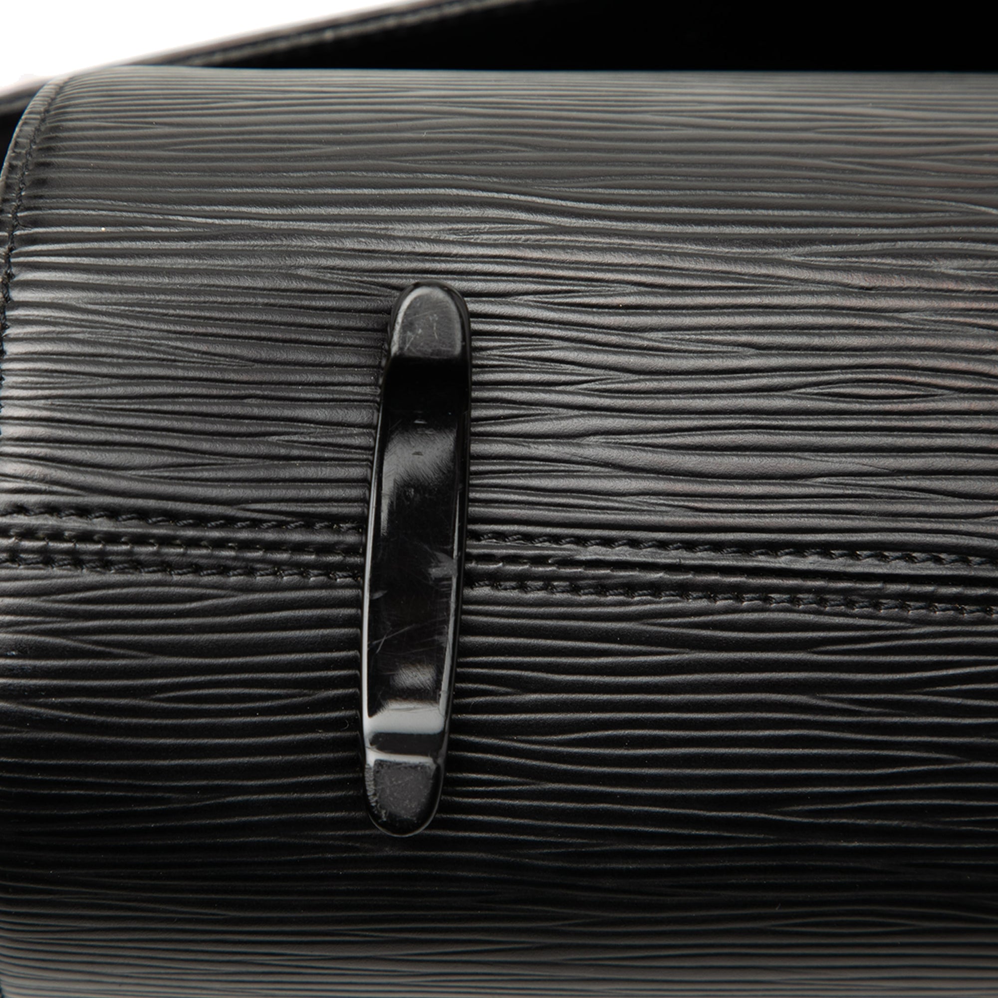 Product Details: Black Louis Vuitton Epi Nocturne GM Shoulder Bag. The Nocturne GM features an epi leather body, a flat strap, a front flap with a magnetic closure, and an interior slip pocket. 5.9" L x 12.2" W x 3.9" D. Serial number VI0979.