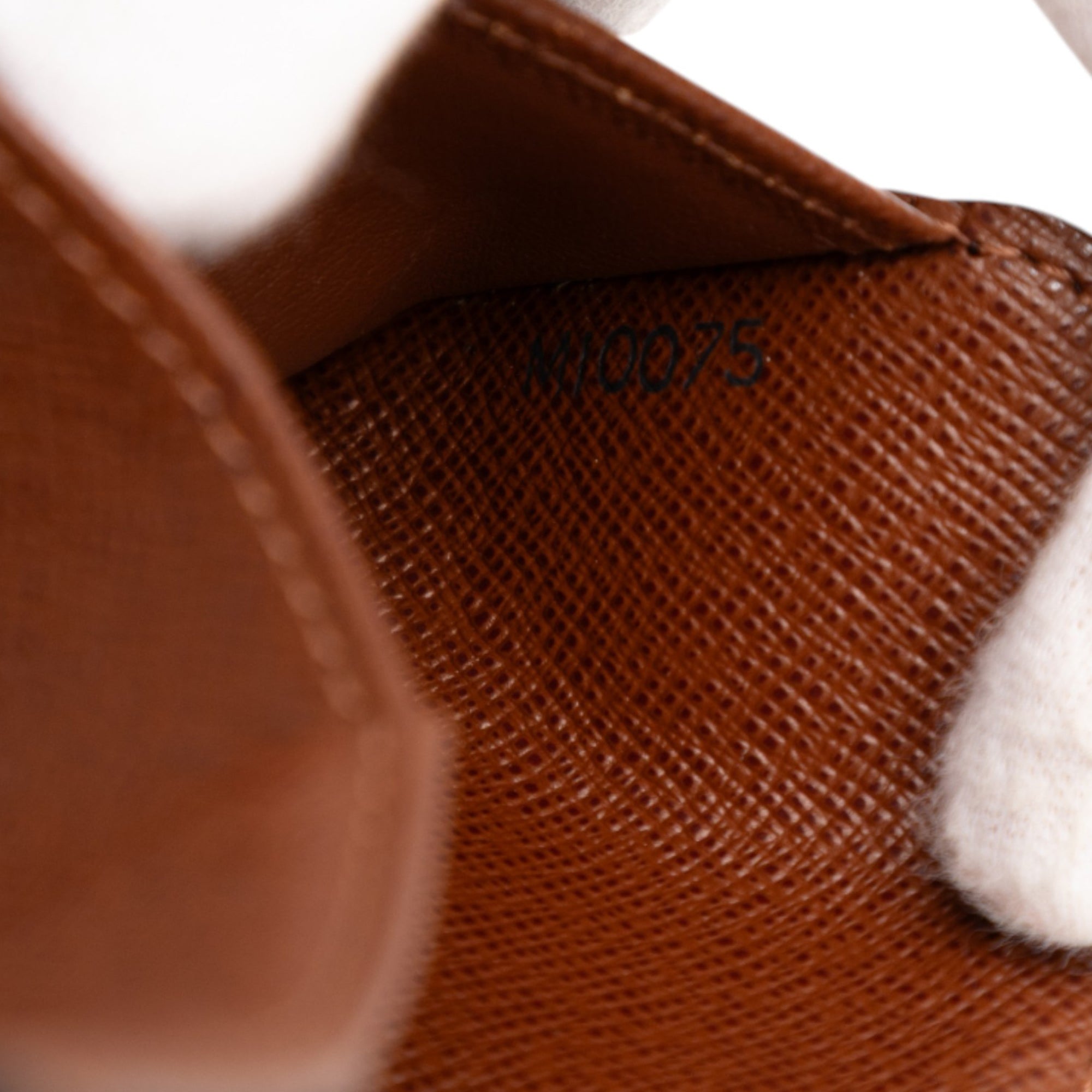 Product Details: Brown Louis Vuitton Monogram Bifold Compact Wallet. This wallet features a monogram canvas body, a strap and snap button closure, a zip-around compartment, and interior slip pockets. 4.3" L x 3.9" W x 1" D. Serial number MI0075.