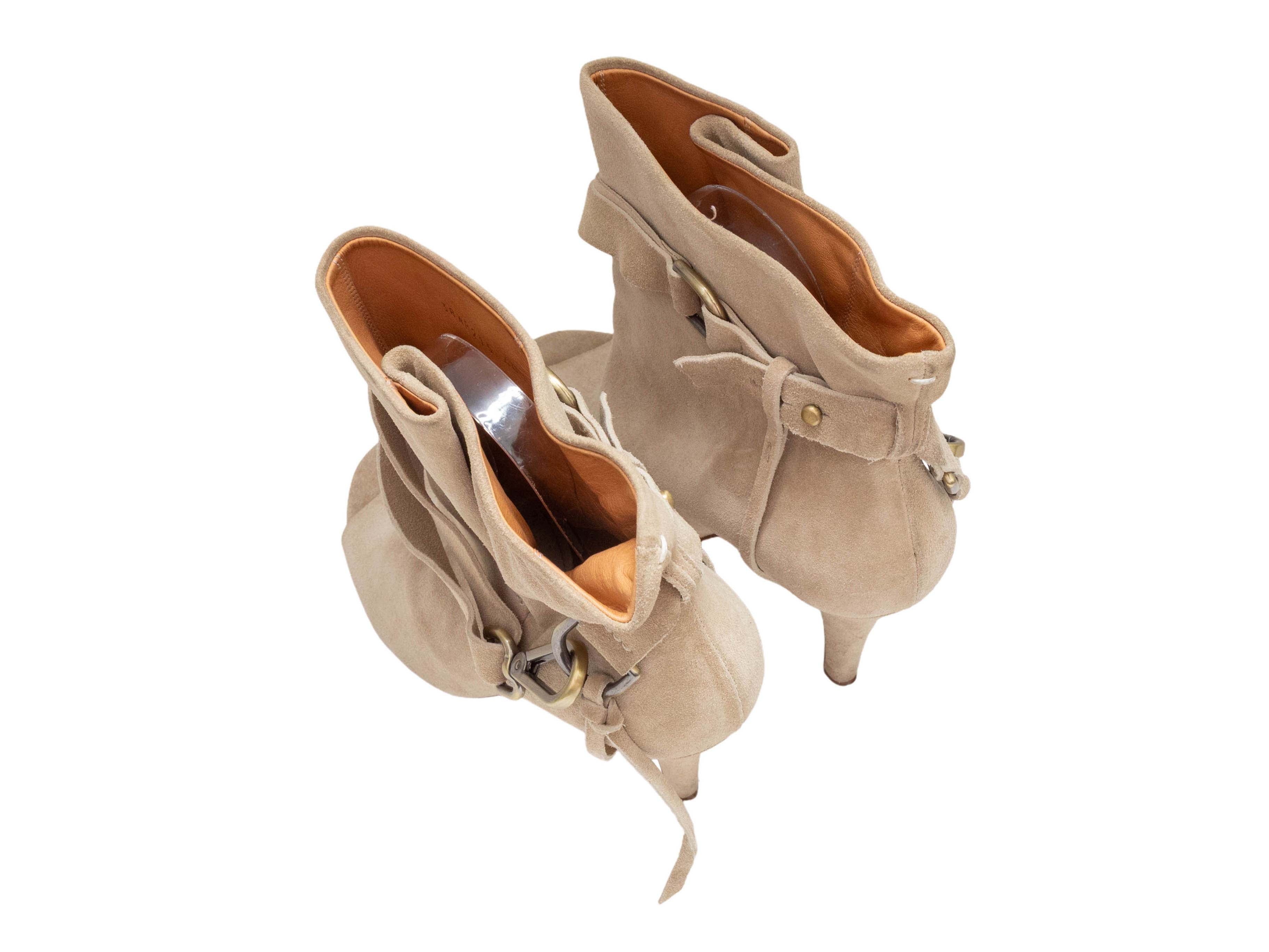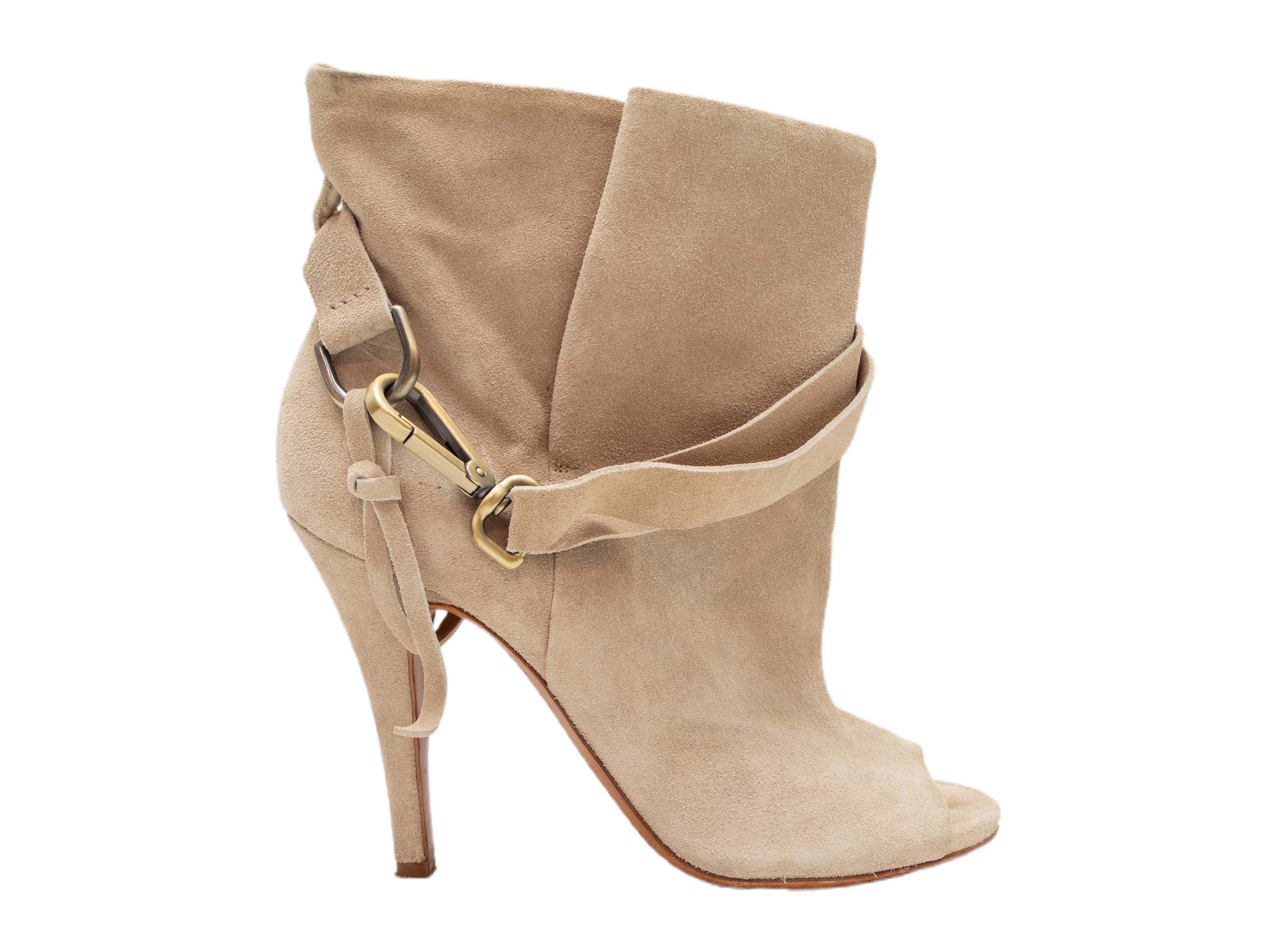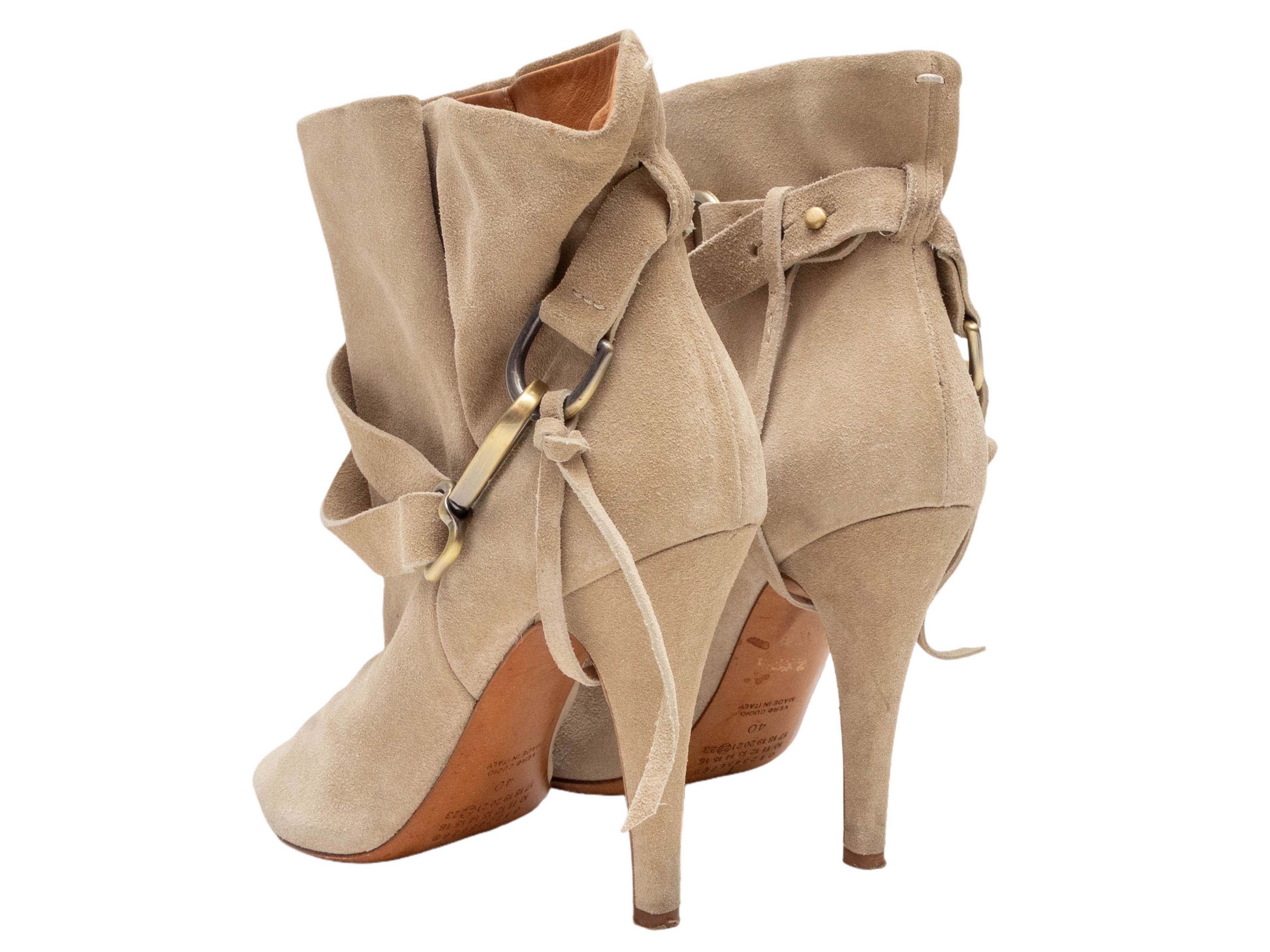 Product Details: Beige suede open-toe heeled ankle boots by Maison Margiela. Gold-tone buckle closures at outer sides. 5" shaft height, 4.5" heel height.