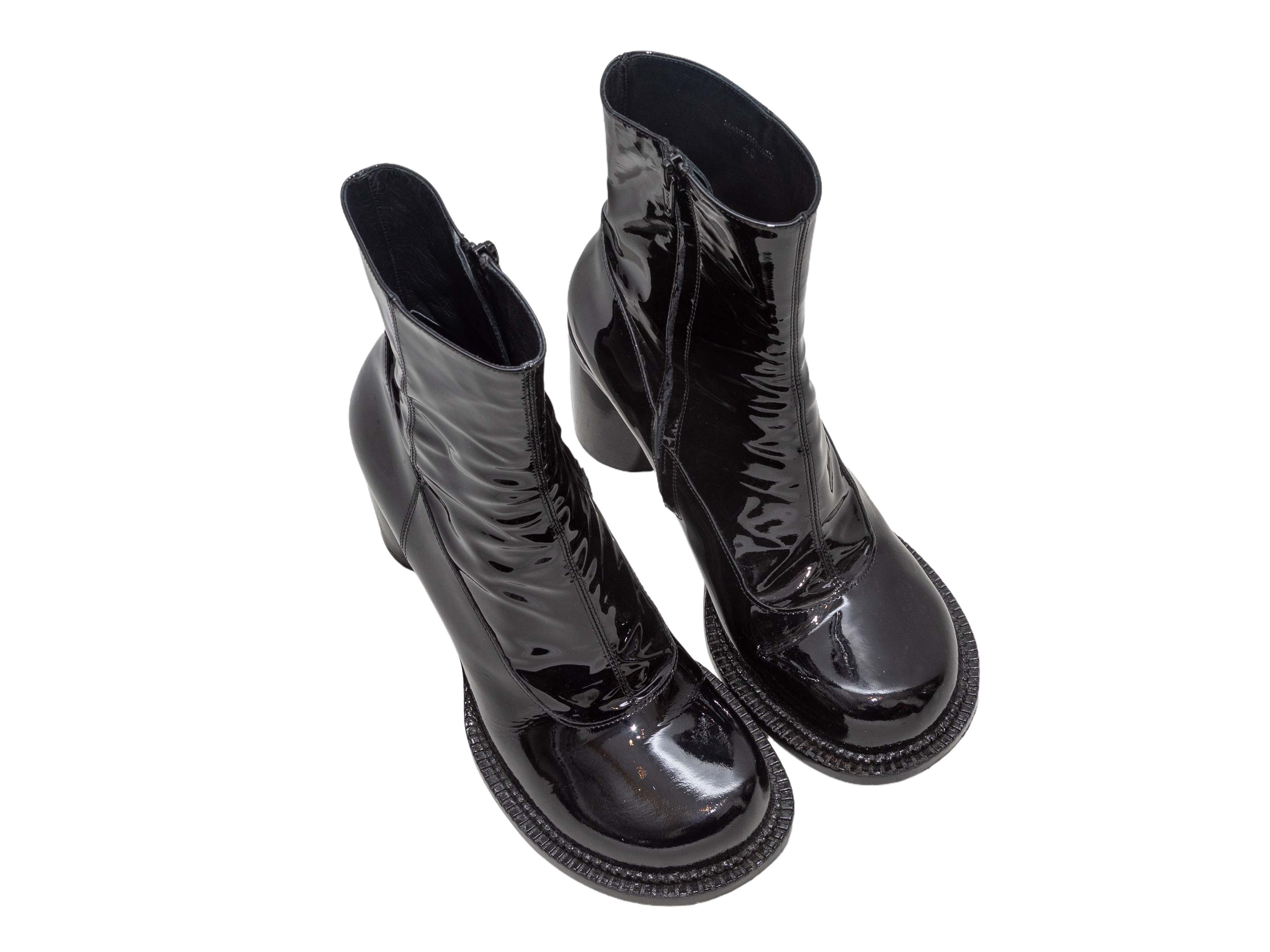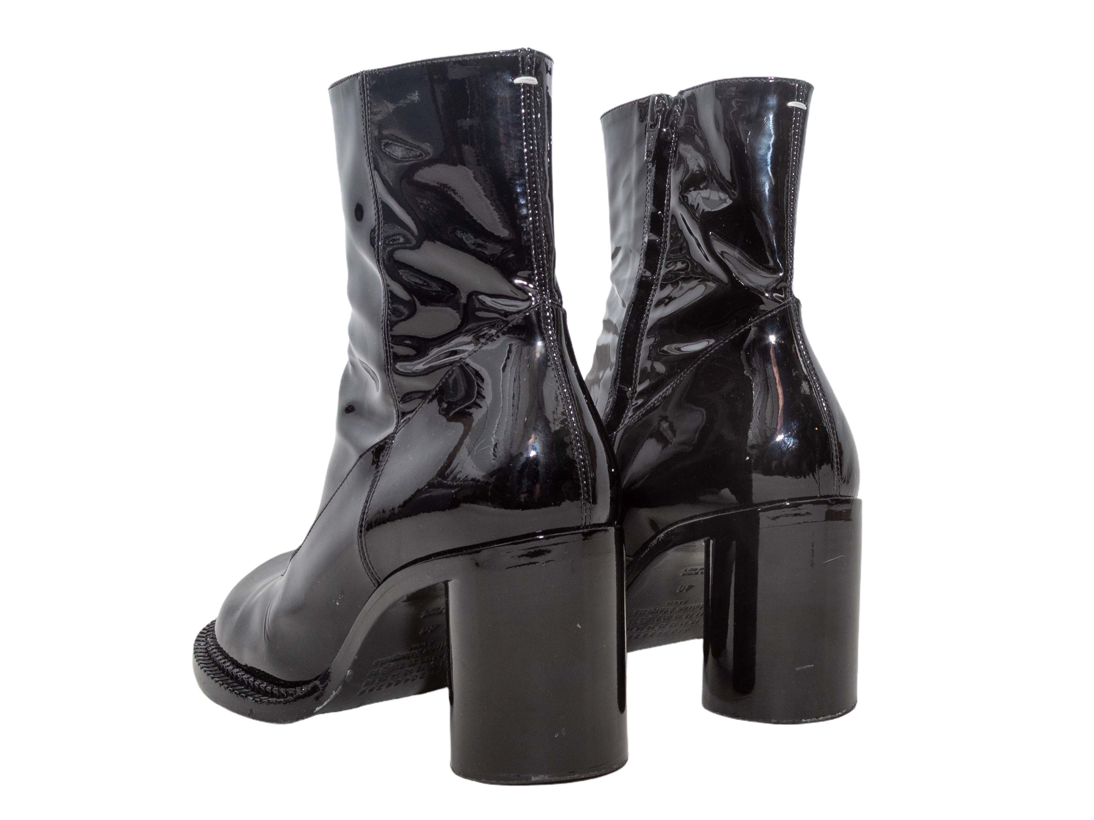 Product Details: Black patent leather heeled ankle boots by Maison Margiela. Block heels. Zip closures at inner sides. 6" shaft height, 3" heel height.
