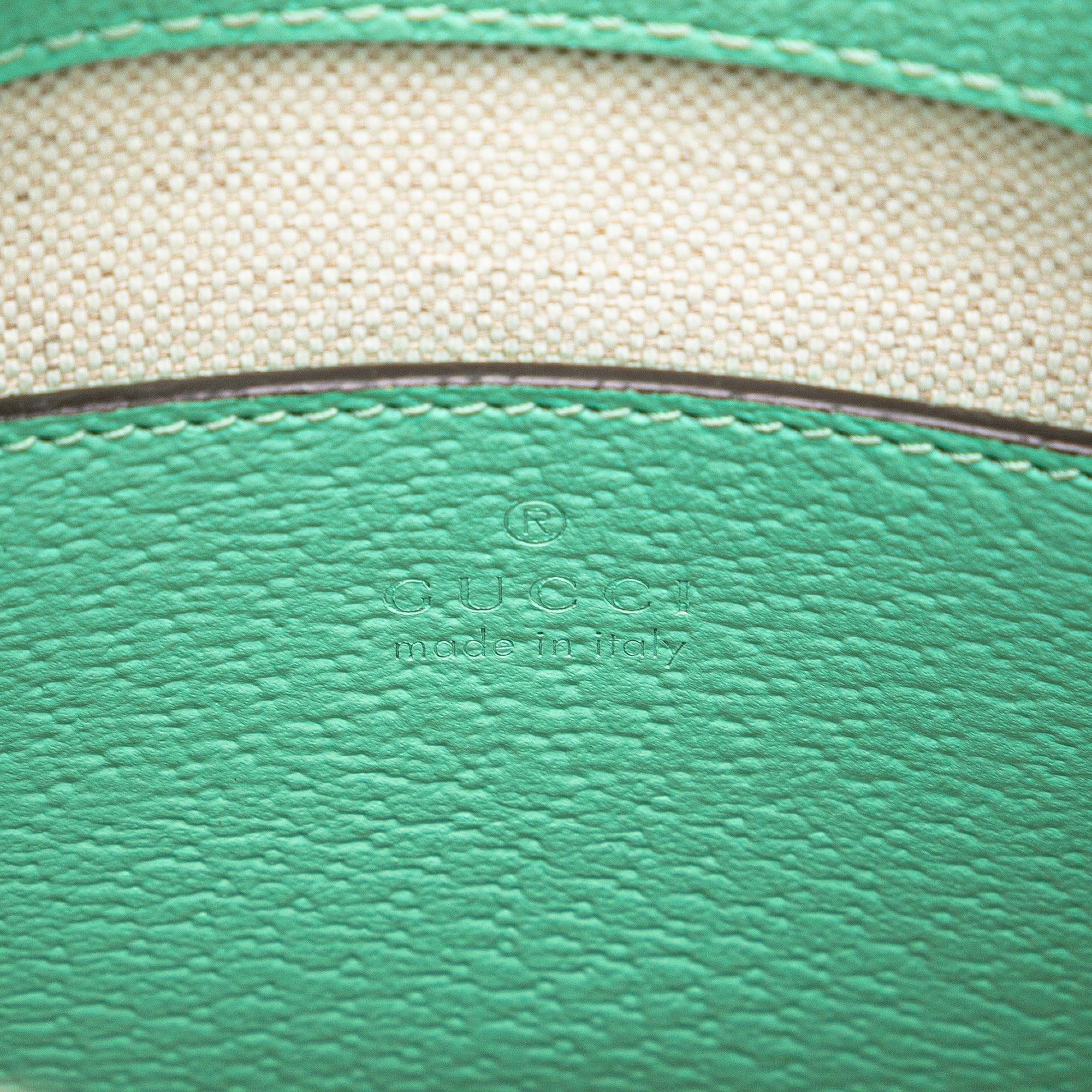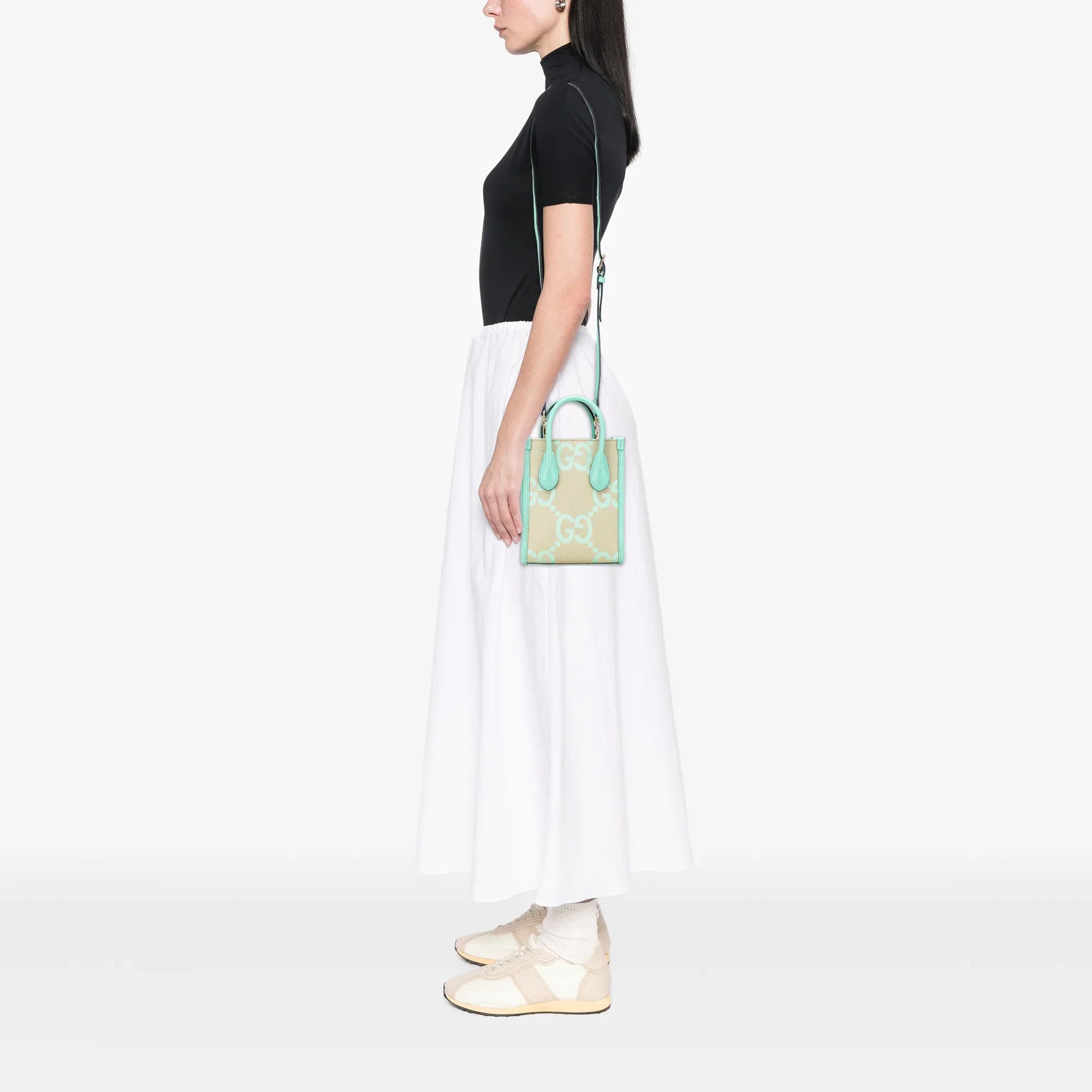 Product Details: Brown Gucci Mini Jumbo GG Canvas Interlocking G Satchel. This satchel features a canvas body with leather trim, rolled leather handles, a detachable flat leather strap, an open top, and an interior slip pocket. 7.5" L x 6.3" W x 2.8" D, 2.4" drop. Serial number 671623 525040.