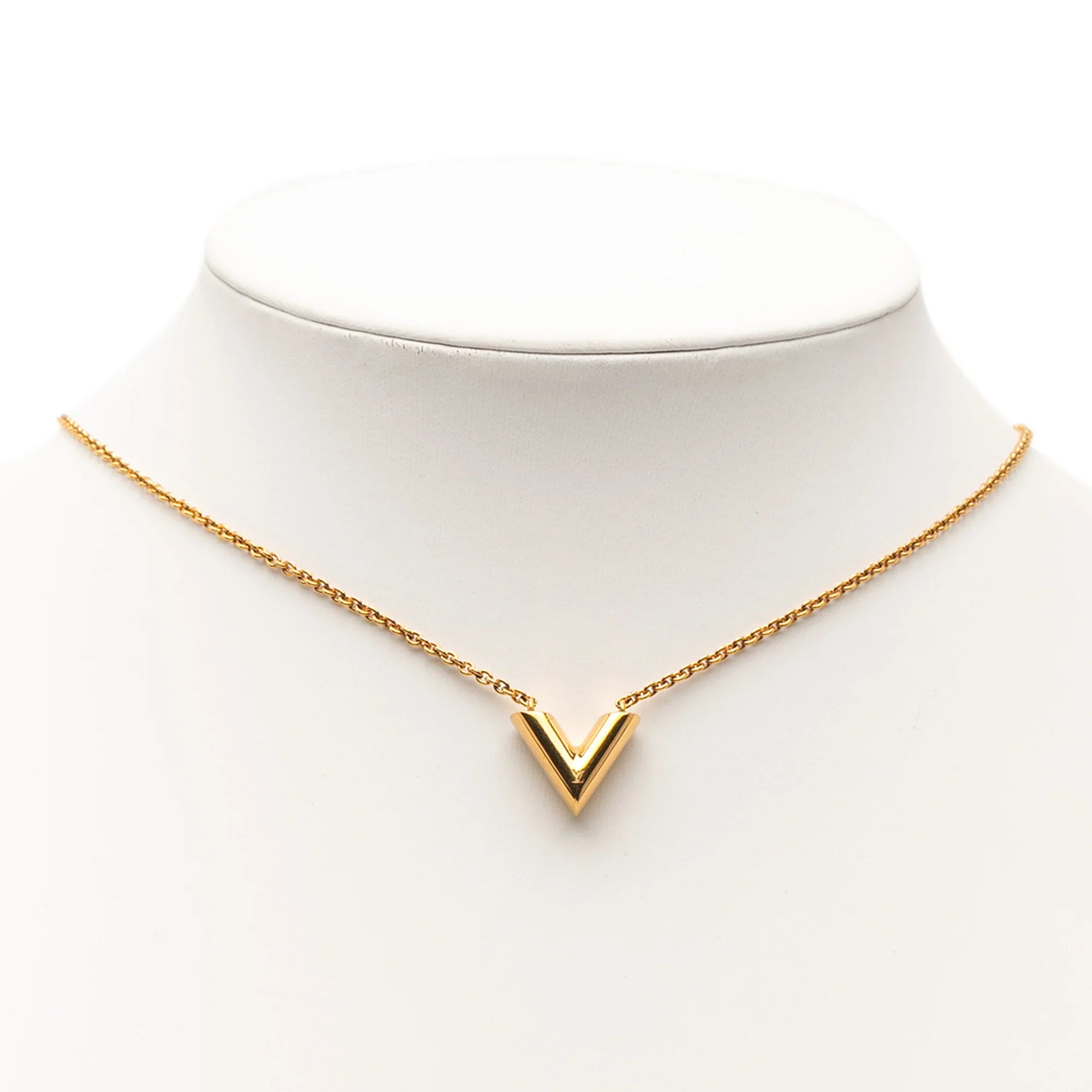 Please note this is a pre-owned item that may display signs of wear consistent with the condition listed above and shown in photos. Designer Revival guarantees this is an authentic Gold Louis Vuitton Gold Plated Essential V Necklace or 100% of your money back. Learn more about our authentication process.