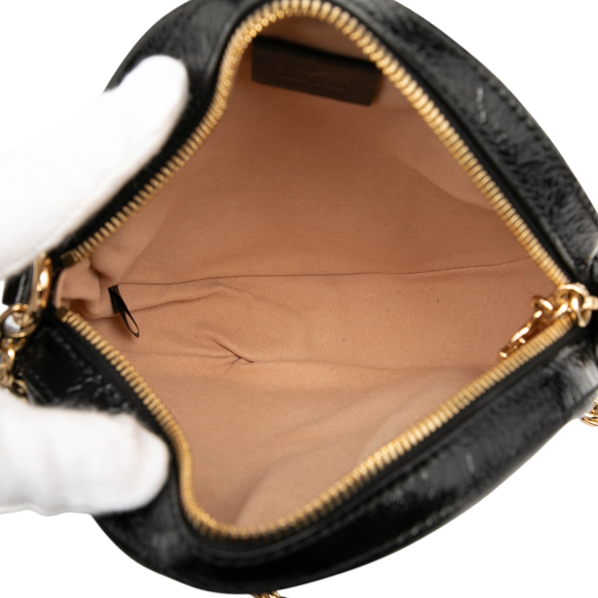 Product Details: Black Gucci Mini Suede Ophidia Round Crossbody. The Mini Ophidia crossbody bag features a suede body with patent leather trim, a chain link and leather shoulder strap, and a top zip closure. 7.1" L x 7.1" W x 1.8" D. Serial number 550618 520981.
