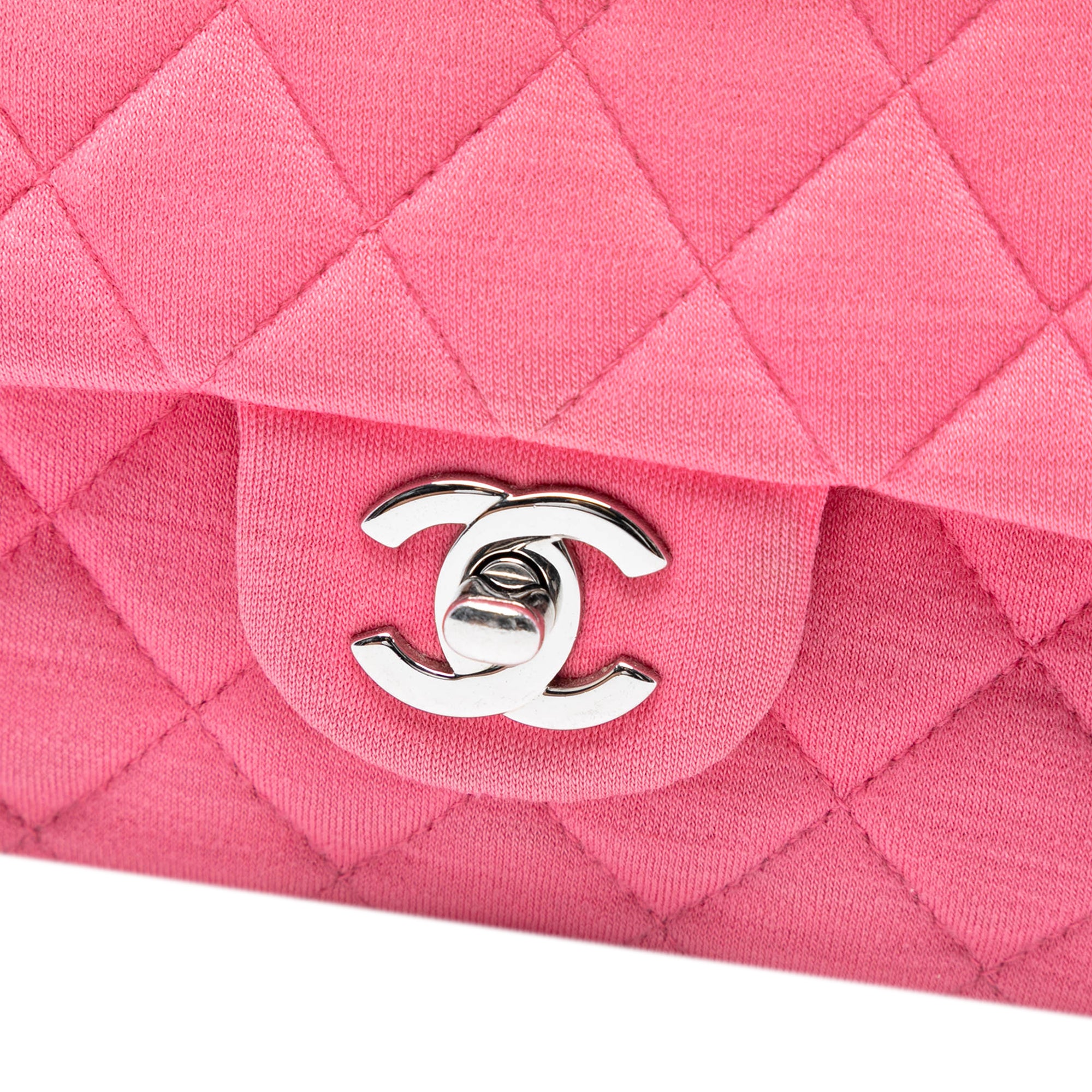 Product Details: Pink Chanel Medium Classic Jersey Double Flap Shoulder Bag. This shoulder bag features a quilted jersey body, cotton-woven chain shoulder straps, double front flaps with CC turn-lock closure, an exterior back slip pocket, and interior zip and slip pockets. 6.1" L x 10" W x 2.6" D. Serial number 19380068.