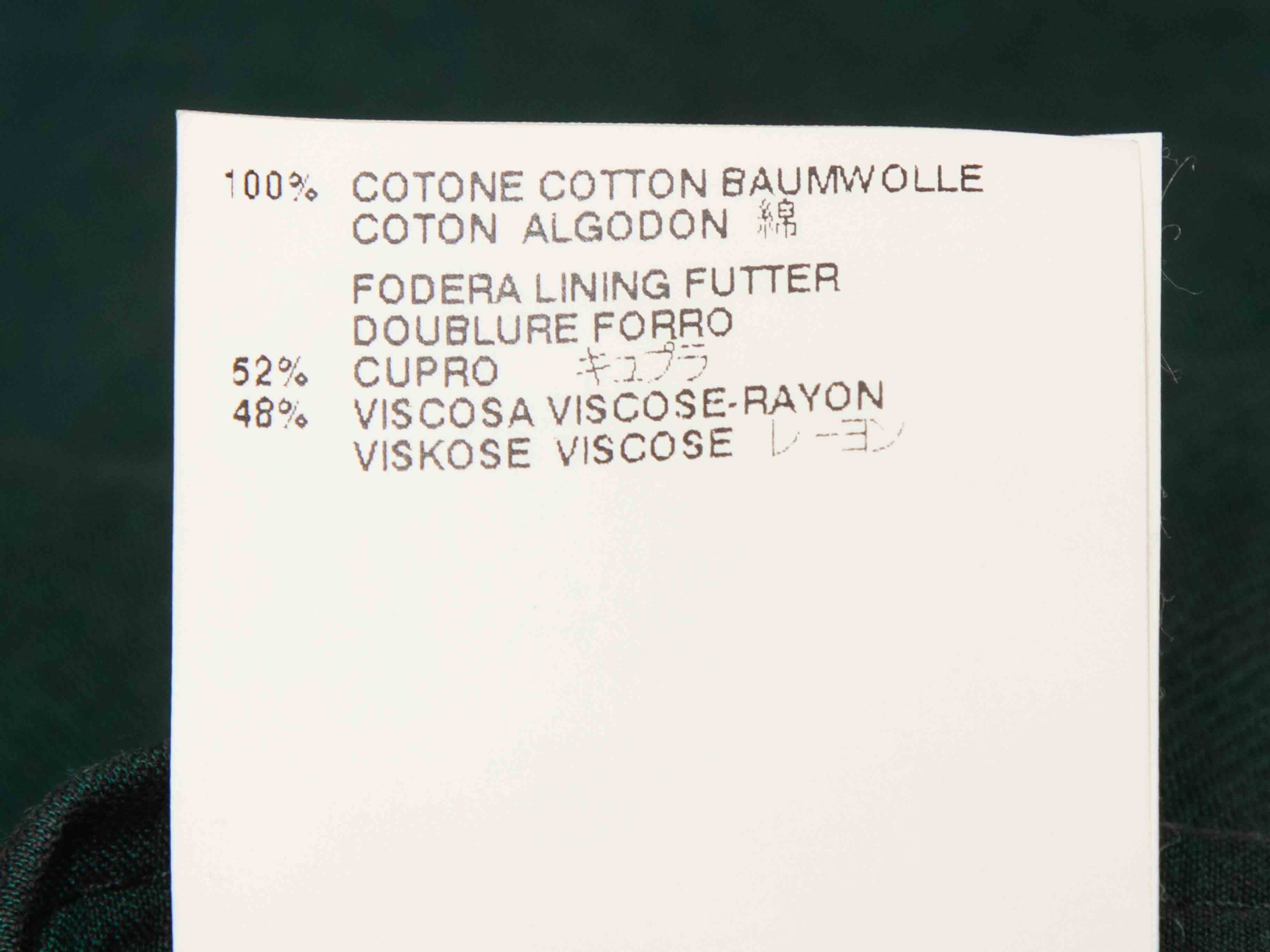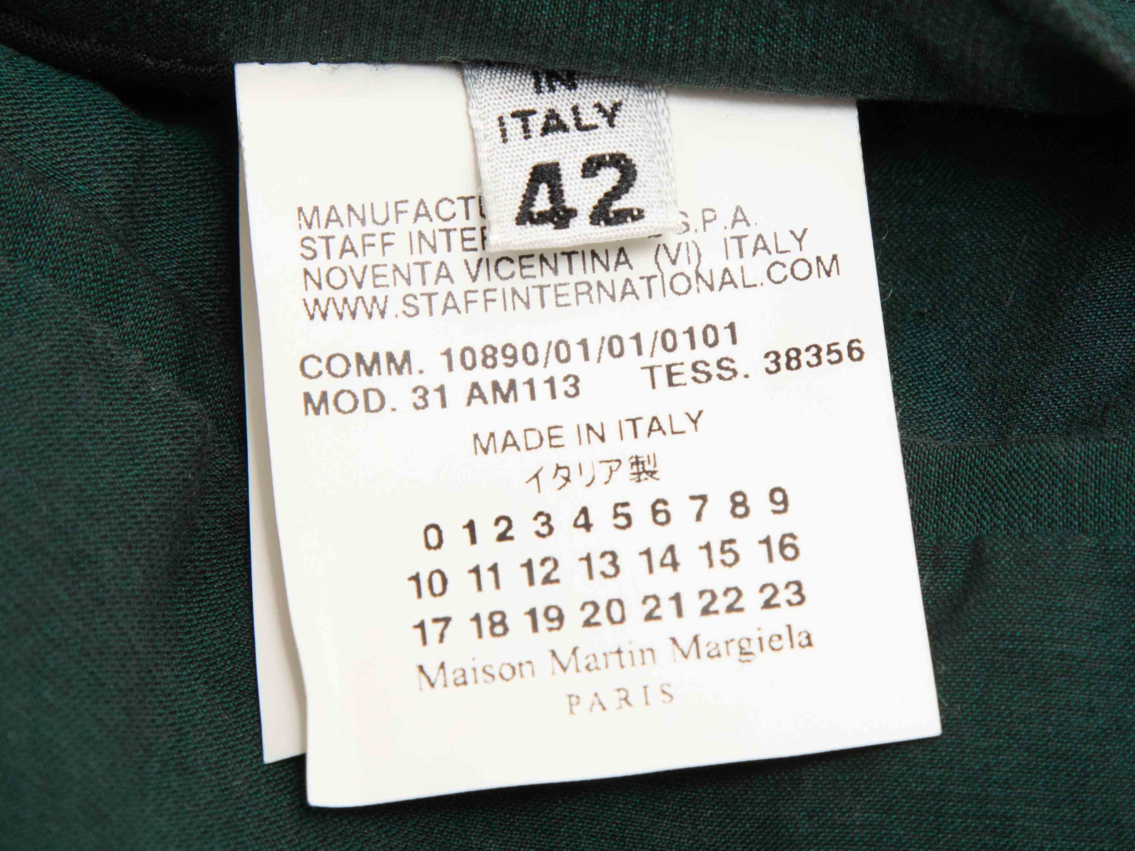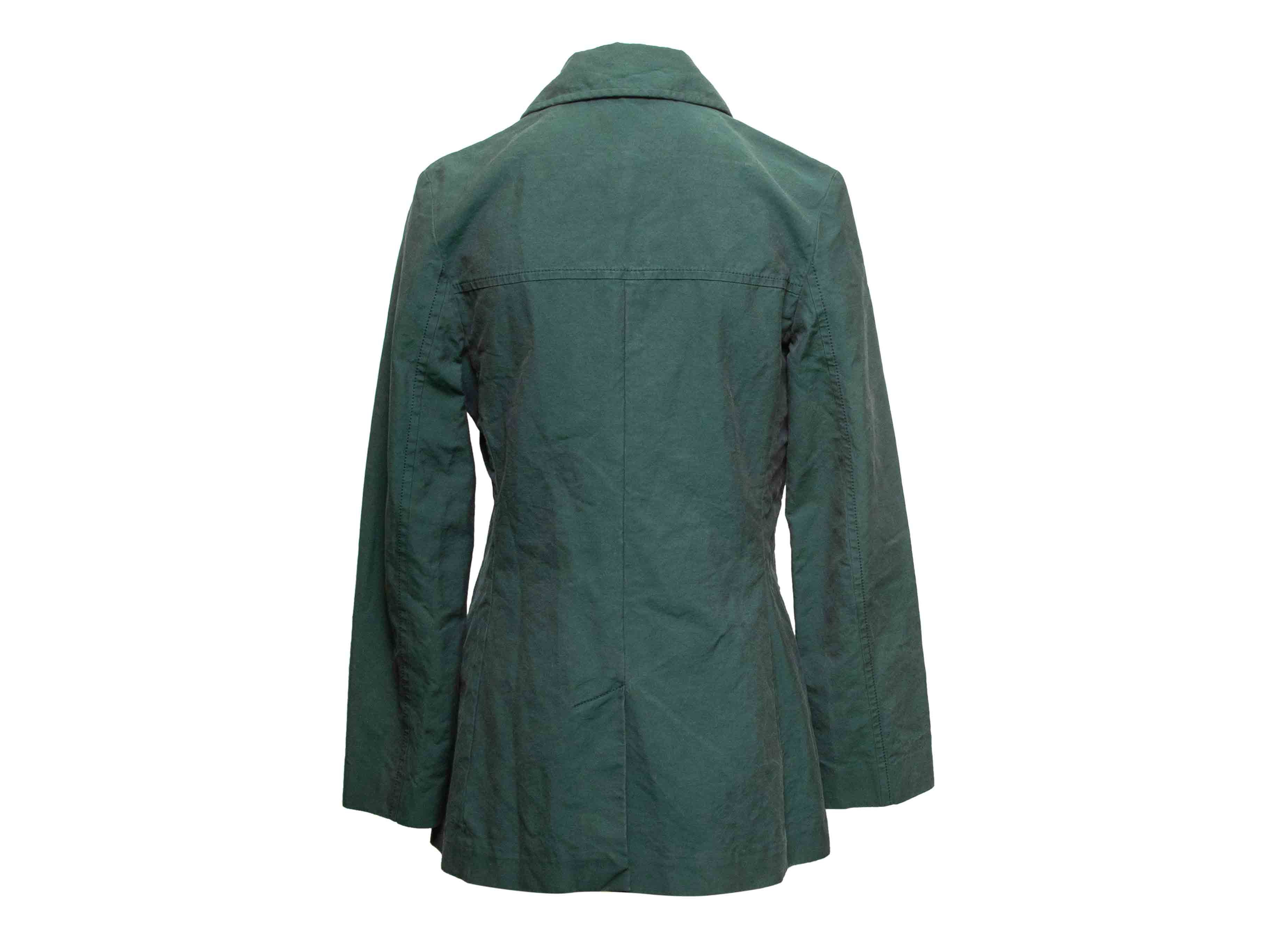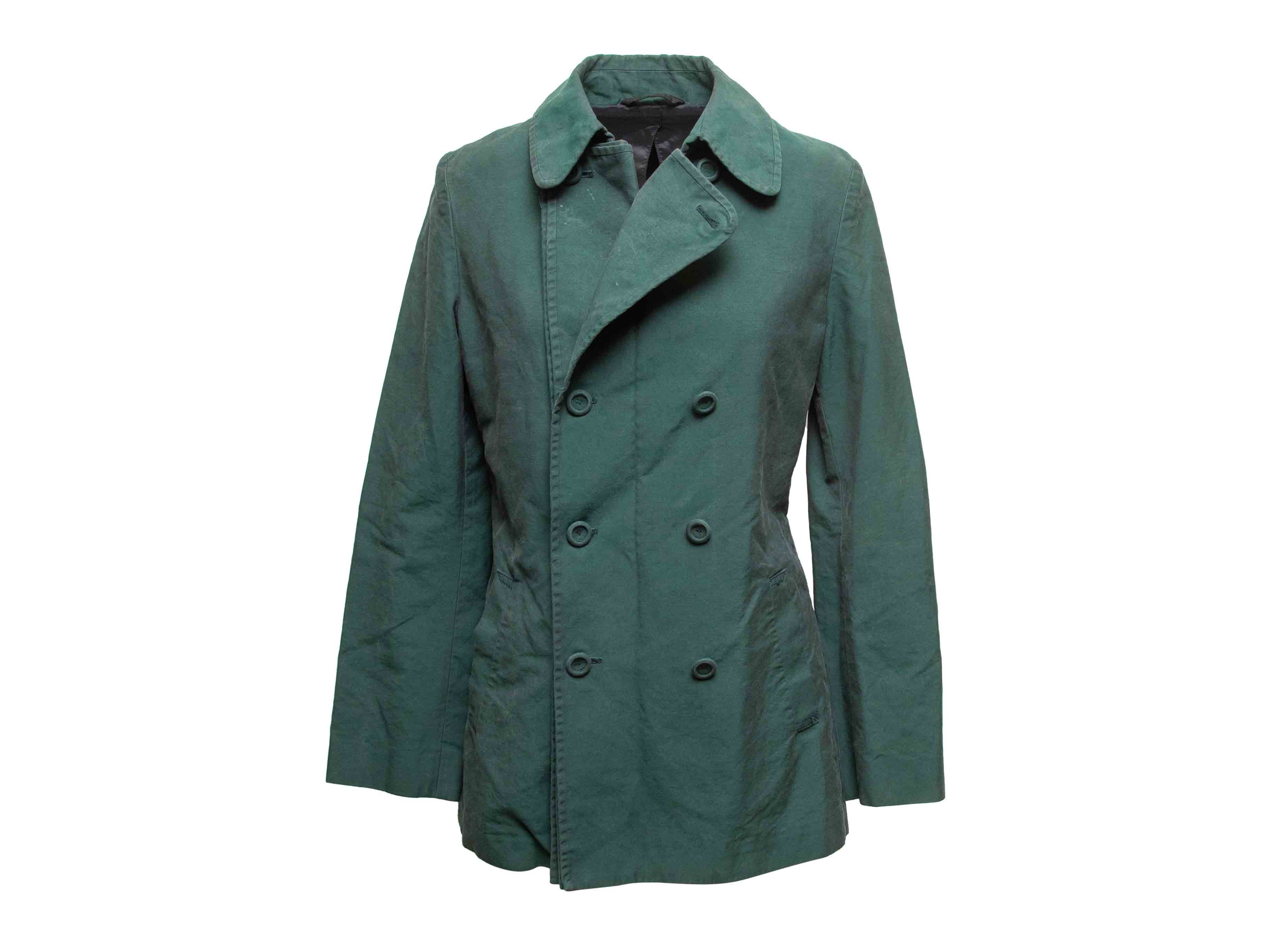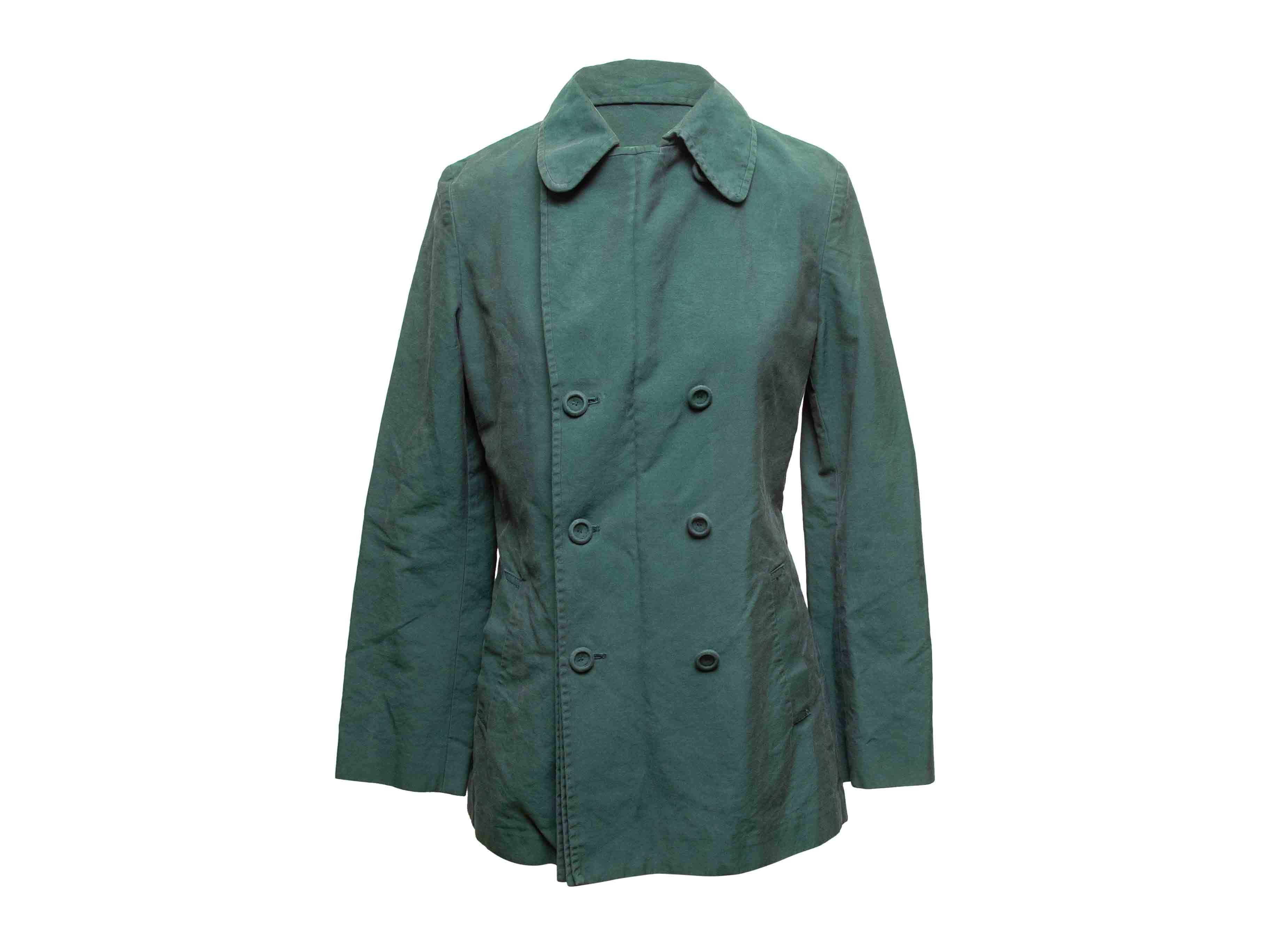 Product Details: Dark green cotton double-breasted coat by Maison Margiela. Rounded collar. Dual hip pockets. Button closures at front. 37" bust, 16" shoulder width, 25" sleeve length, 32.5" length.