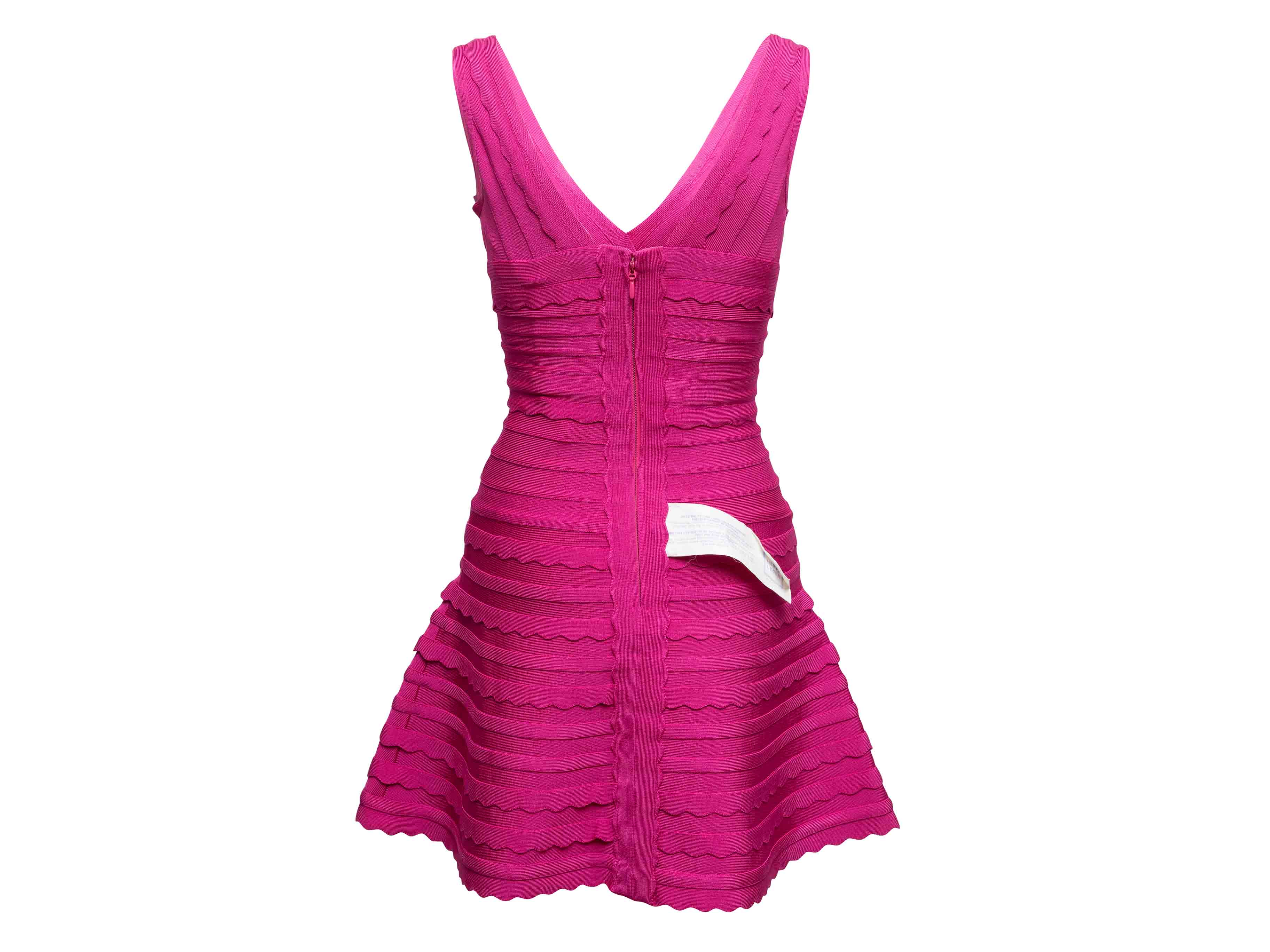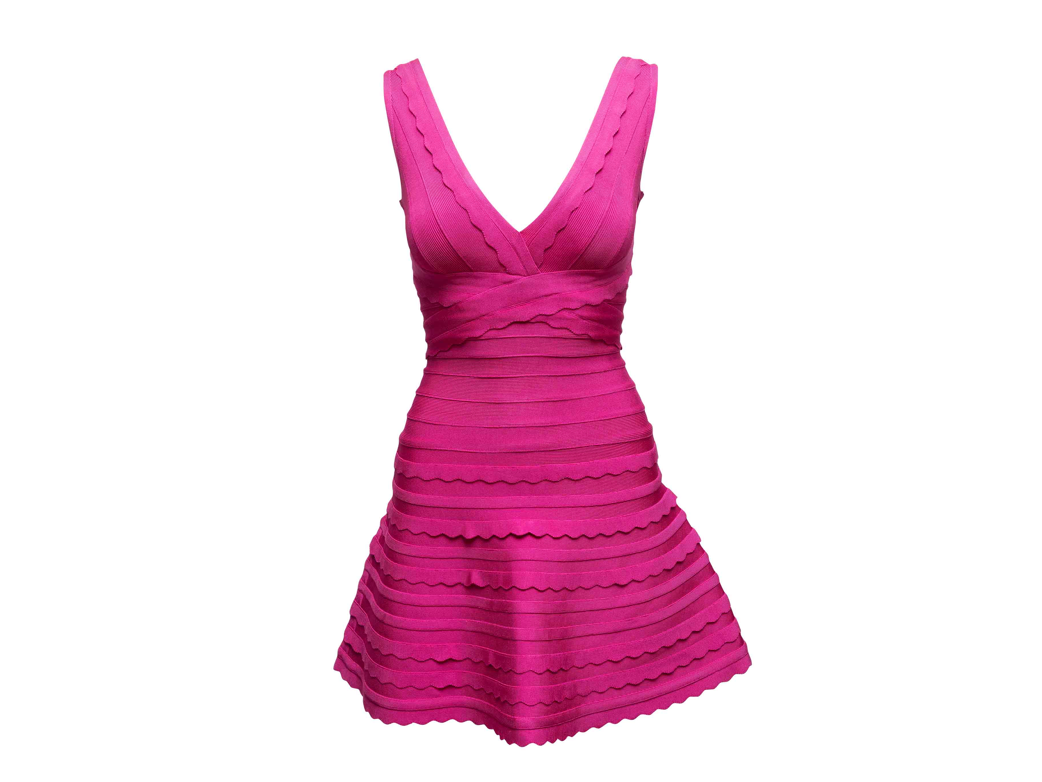 Product Details: Hot pink A-line sleeveless mini dress by Herve Leger. V-neck. Zip closure at back. 26" bust, 20" waist, 32.5" length, 11.5" shoulder width.