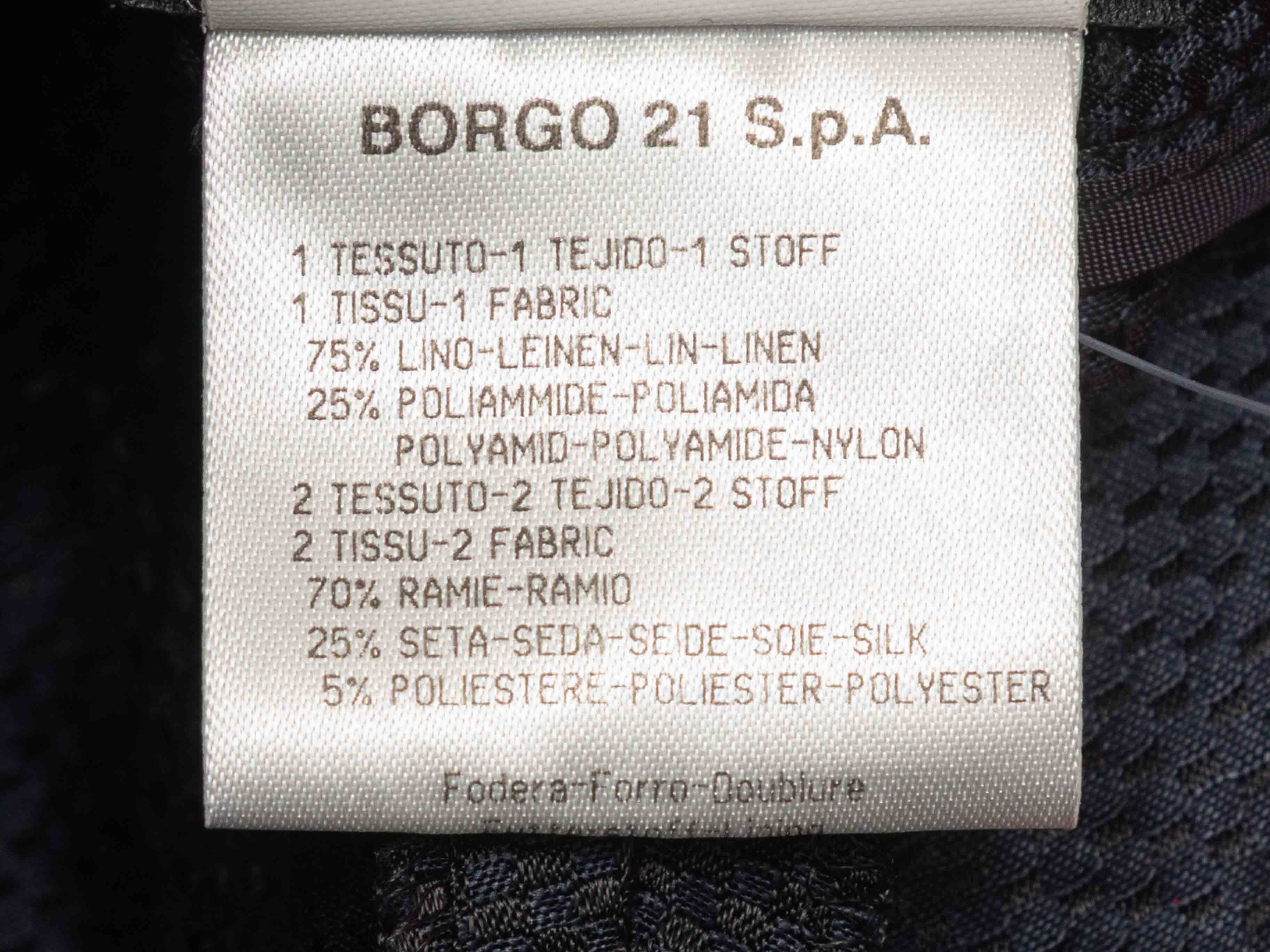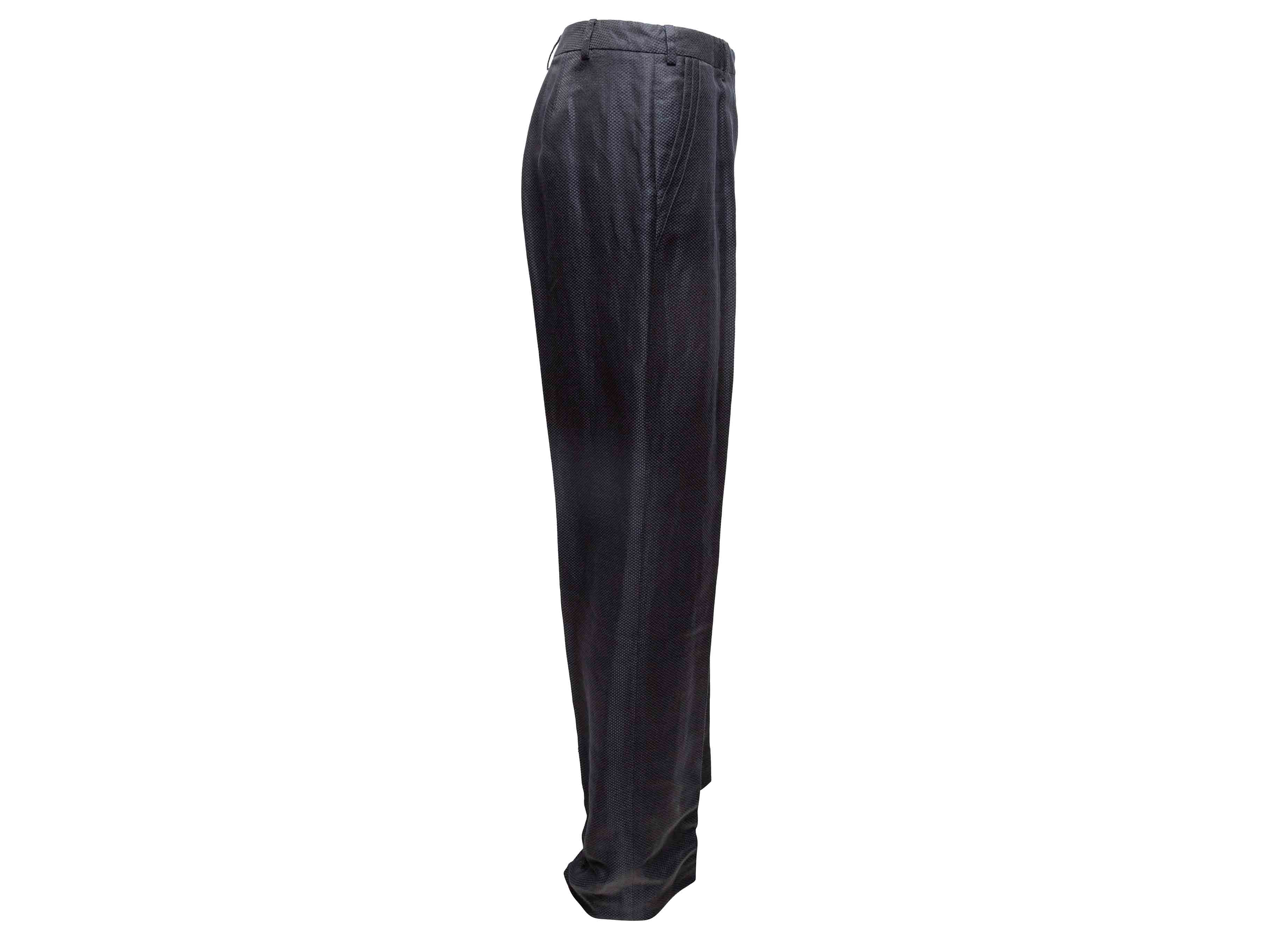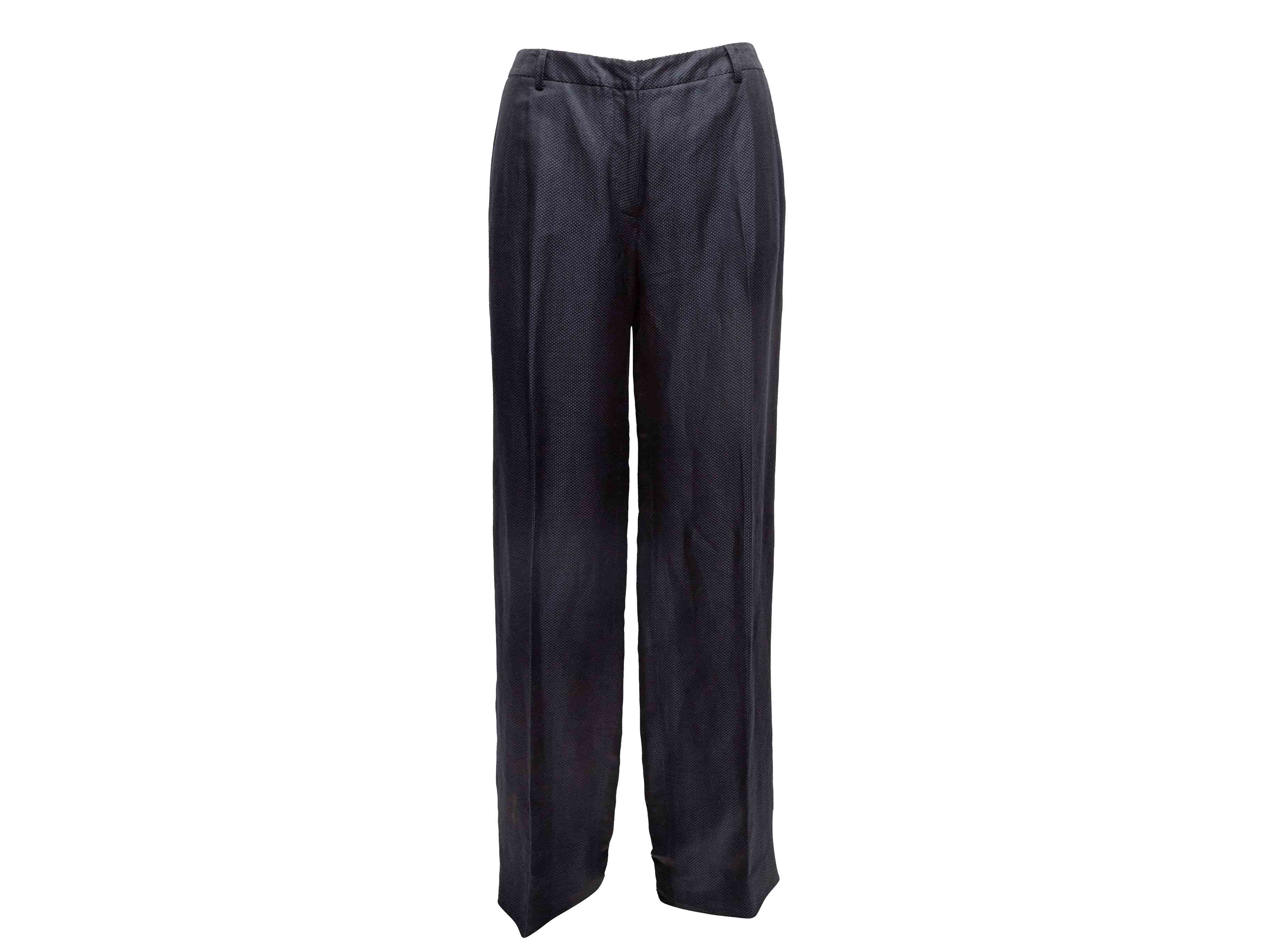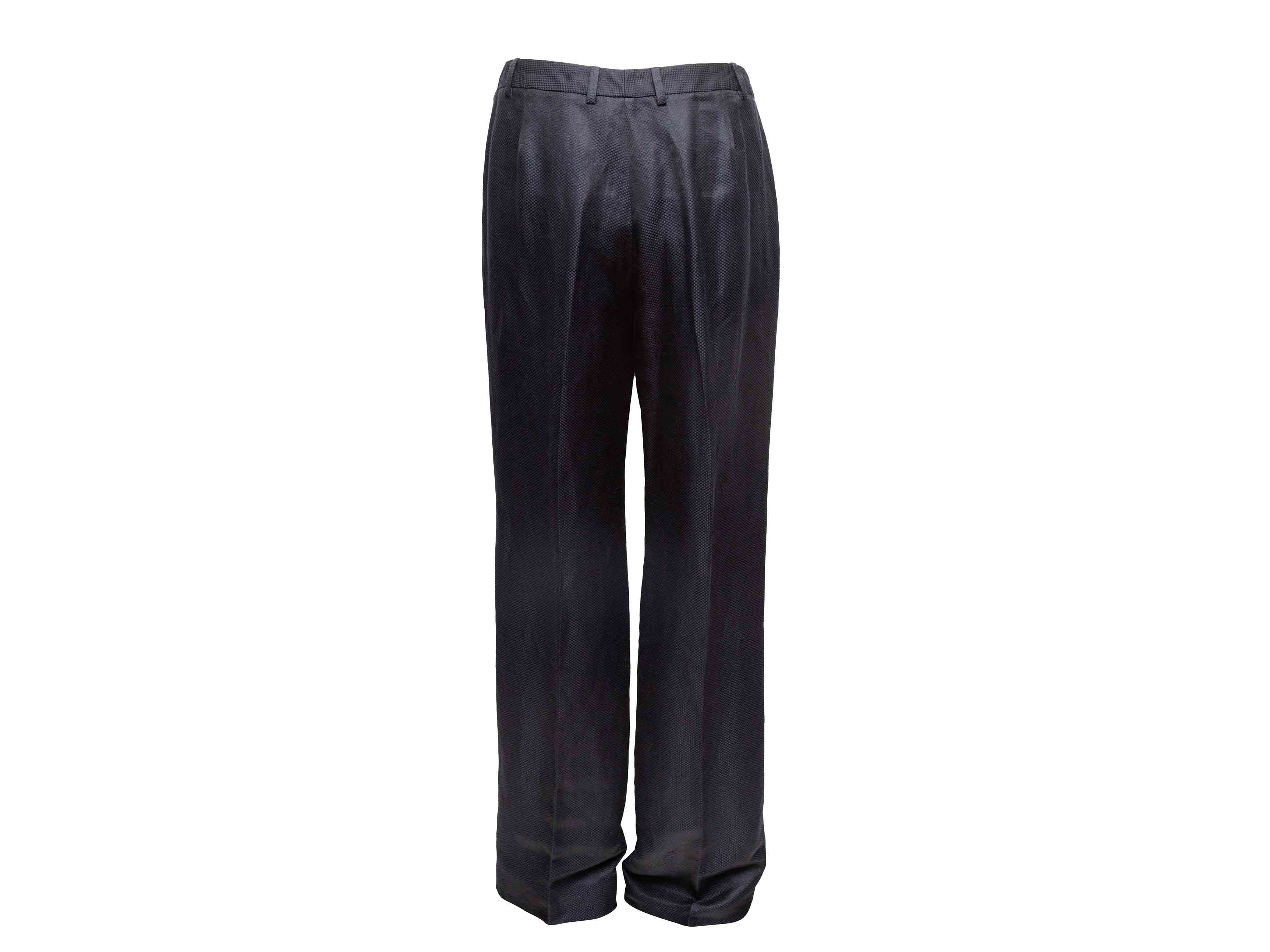Product Details: Navy linen-blend textured straight-leg trousers by Giorgio Armani. Dual hip pockets. Front closure. 34" waist, 42" hips, 32.5" inseam, 10.5" rise, 42" length.