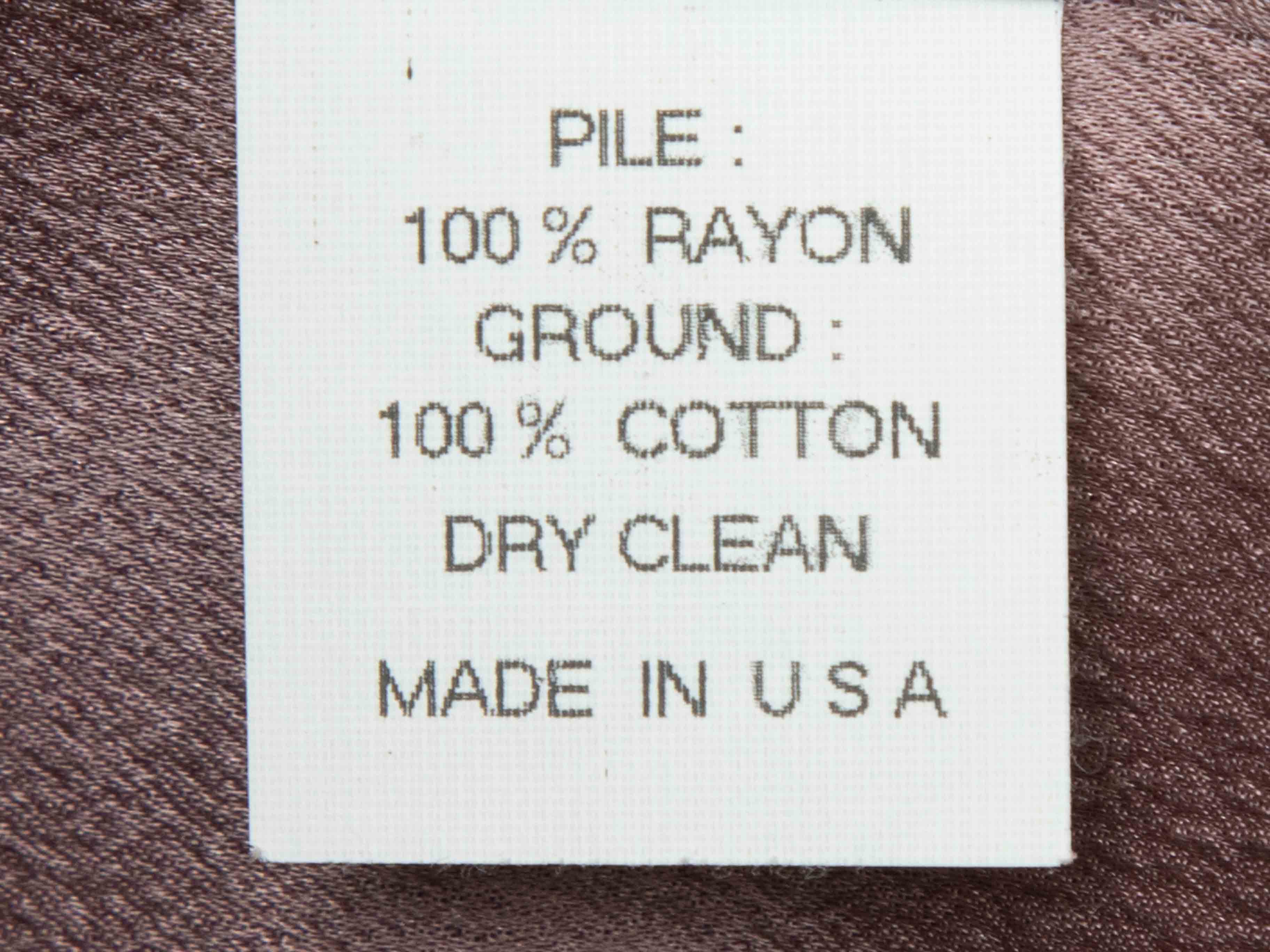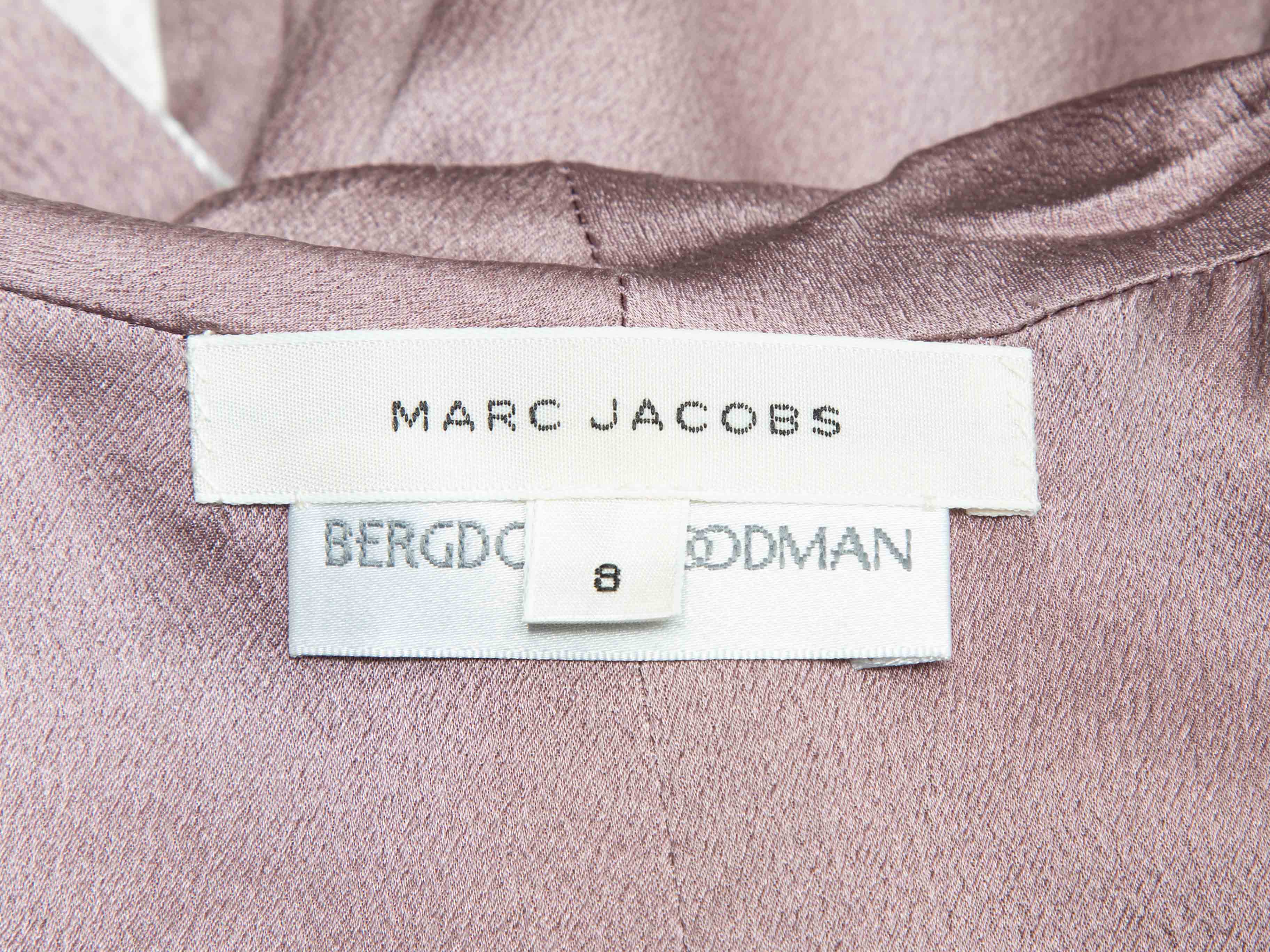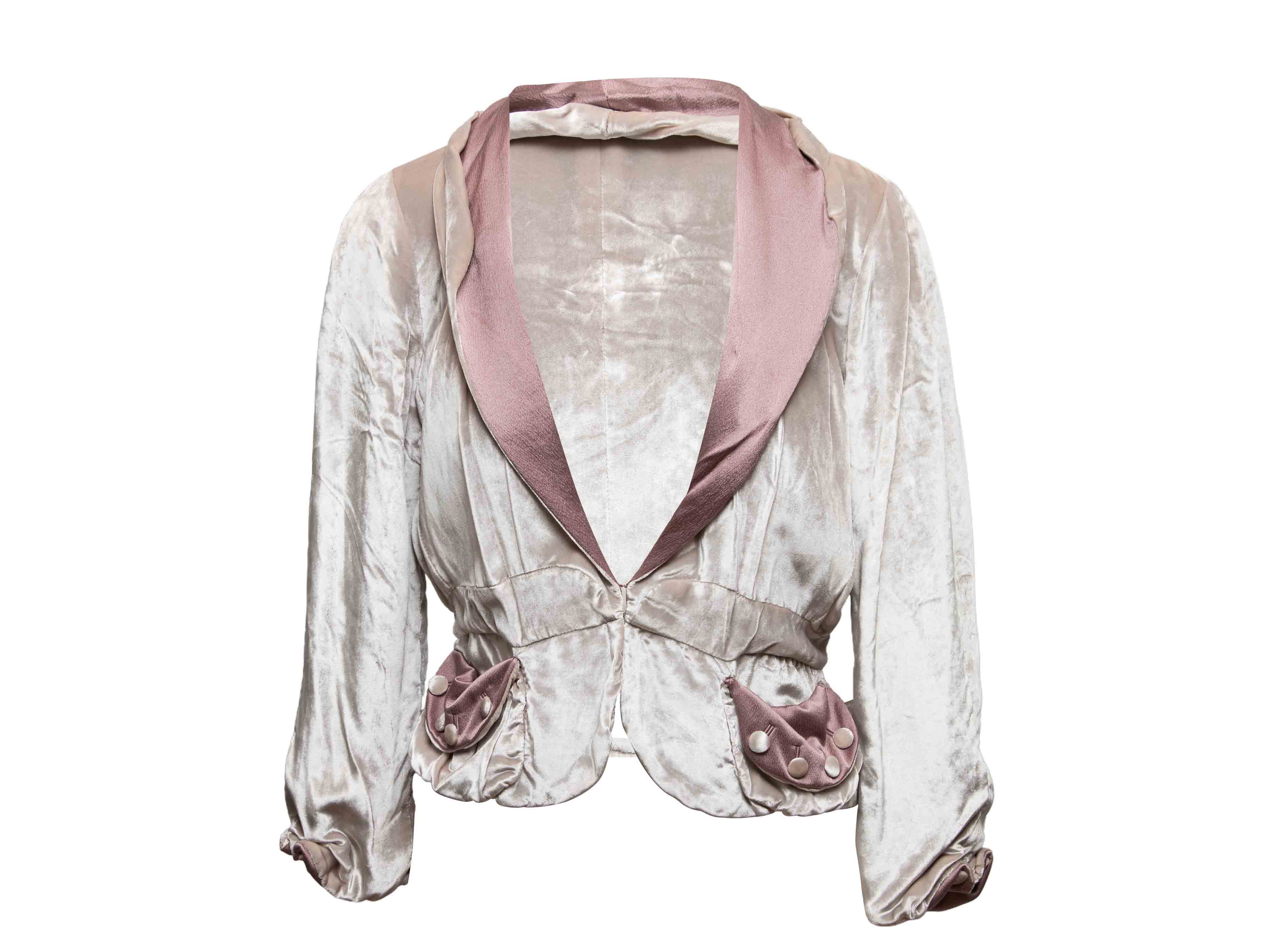 Product Details: Silver velvet and mauve satin blazer by Marc Jacobs. Shawl lapel. Dual hip pockets. Front hook-and-eye closure. 36" bust, 15.5" shoulder width, 20.5" sleeve length, 22" length.