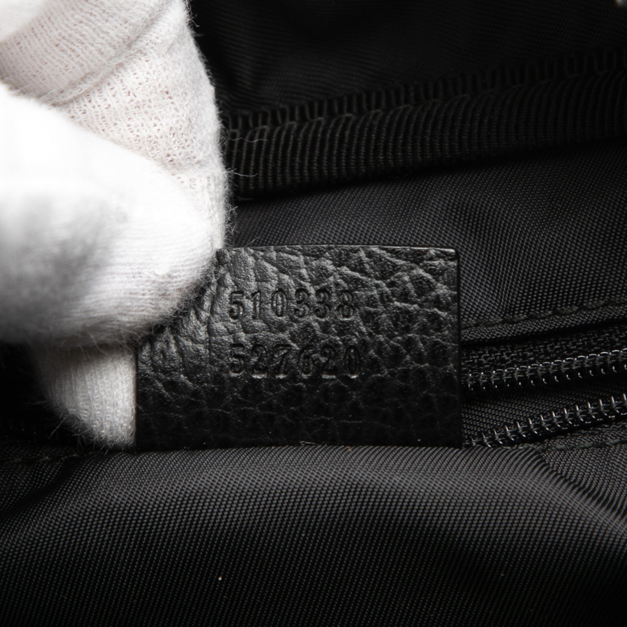 Product Details: Black Gucci GG Nylon Toiletry Pouch. This pouch features a nylon body with leather trim, a flat leather side handle, a top zip closure, and an interior zip pocket. 5.9" L x 8.3" W x 3.5" D. Serial number 510338 527620.