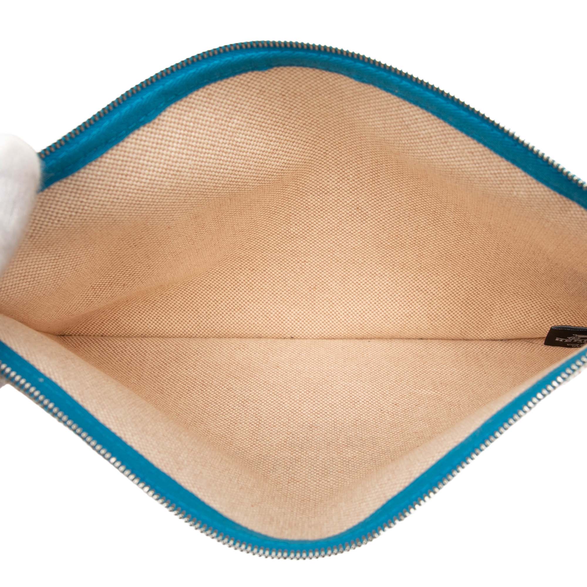 Product Details: Brown Hermès Canvas Bain Flat Yachting GM Pouch. This pouch features a canvas body and a top zip closure. 7.7" L x 11" W x 0.2" D.