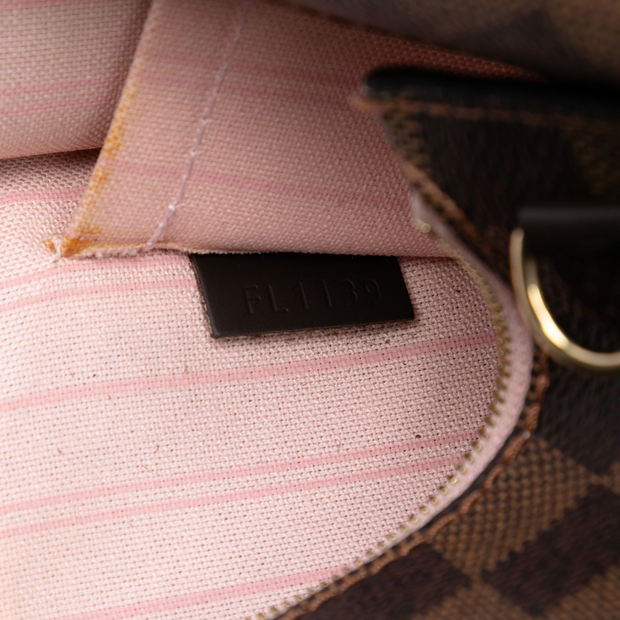 Product Details: Brown Louis Vuitton Damier Ebene Neverfull Pouch MM. This pouch features a damier canvas body, a flat leather wrist strap, a top zip closure, and an interior slip pocket. 5.9" L x 9.6" W x 0.2" D, 5.3" drop. Serial number FL1139.