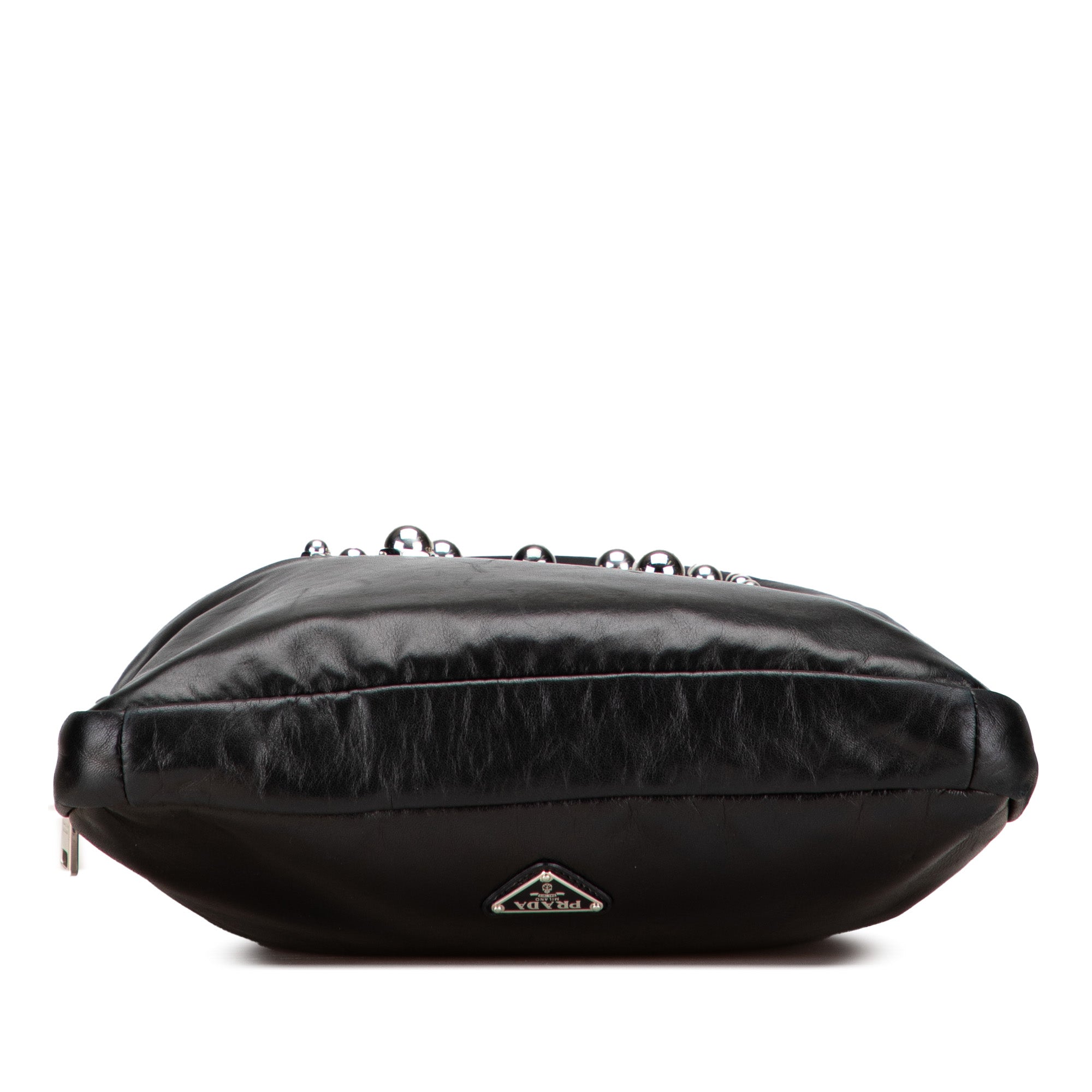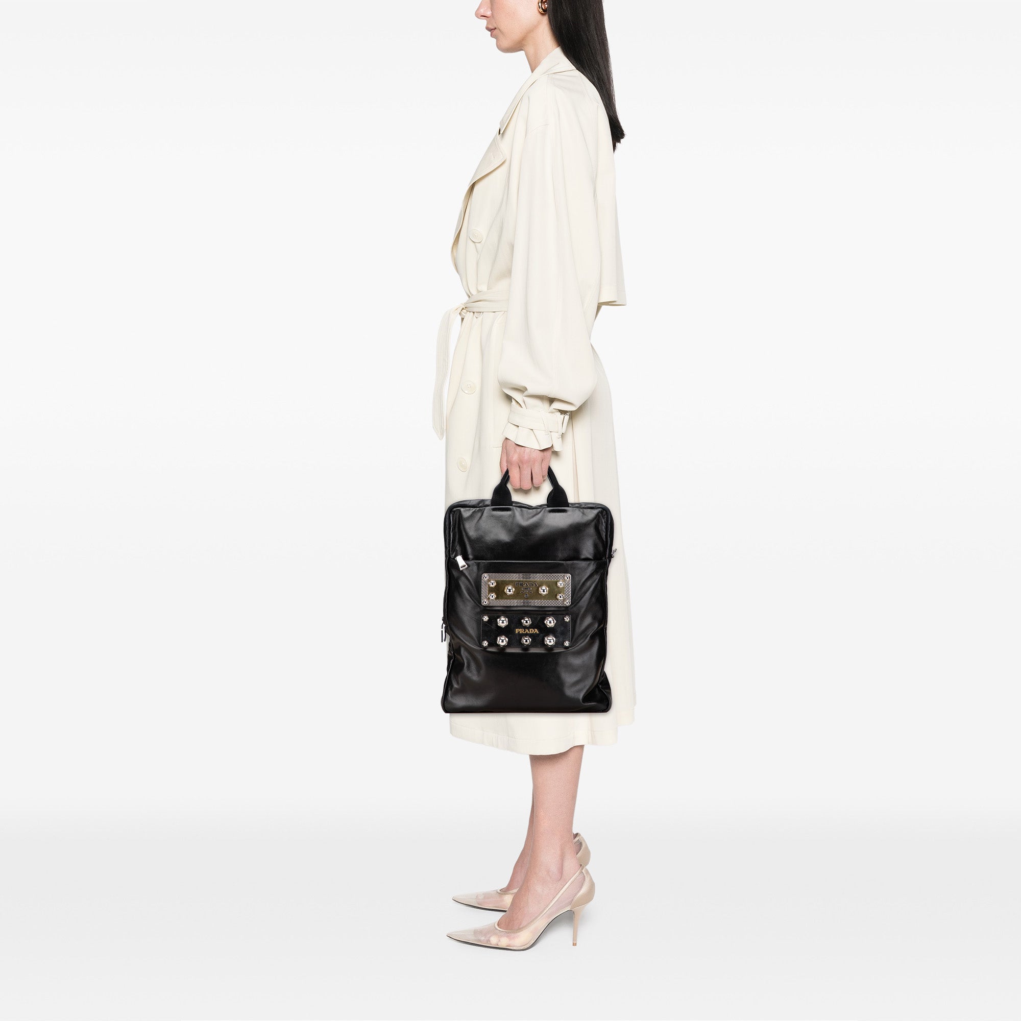 Product Details: Black Prada Leather Logo Metal Plate Vertical Tote. This tote features a leather body, rolled leather handles, a top zip closure, an exterior zip pocket, and an interior slip pocket. 16.1" L x 12.6" W x 1.6" D, 3.3" drop.