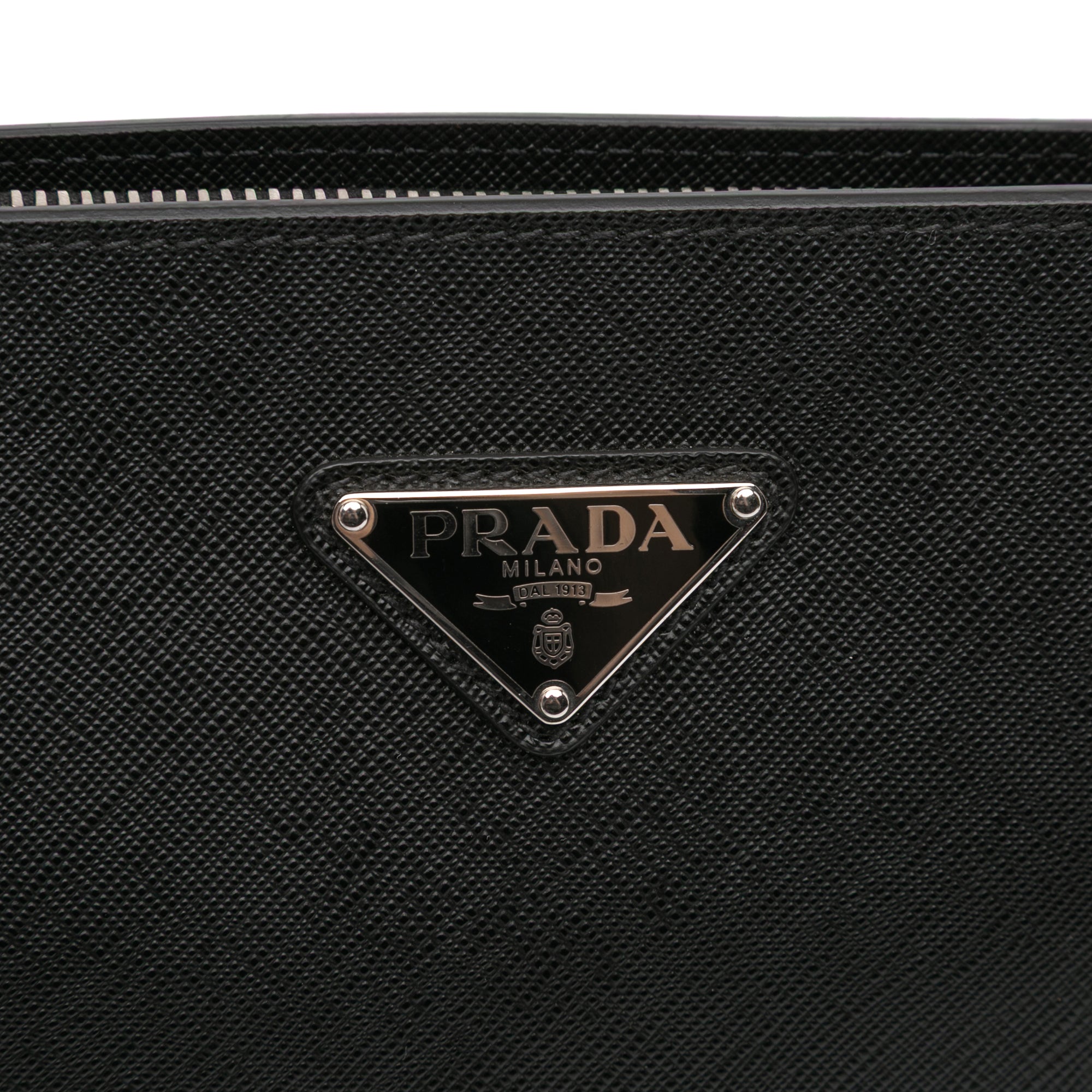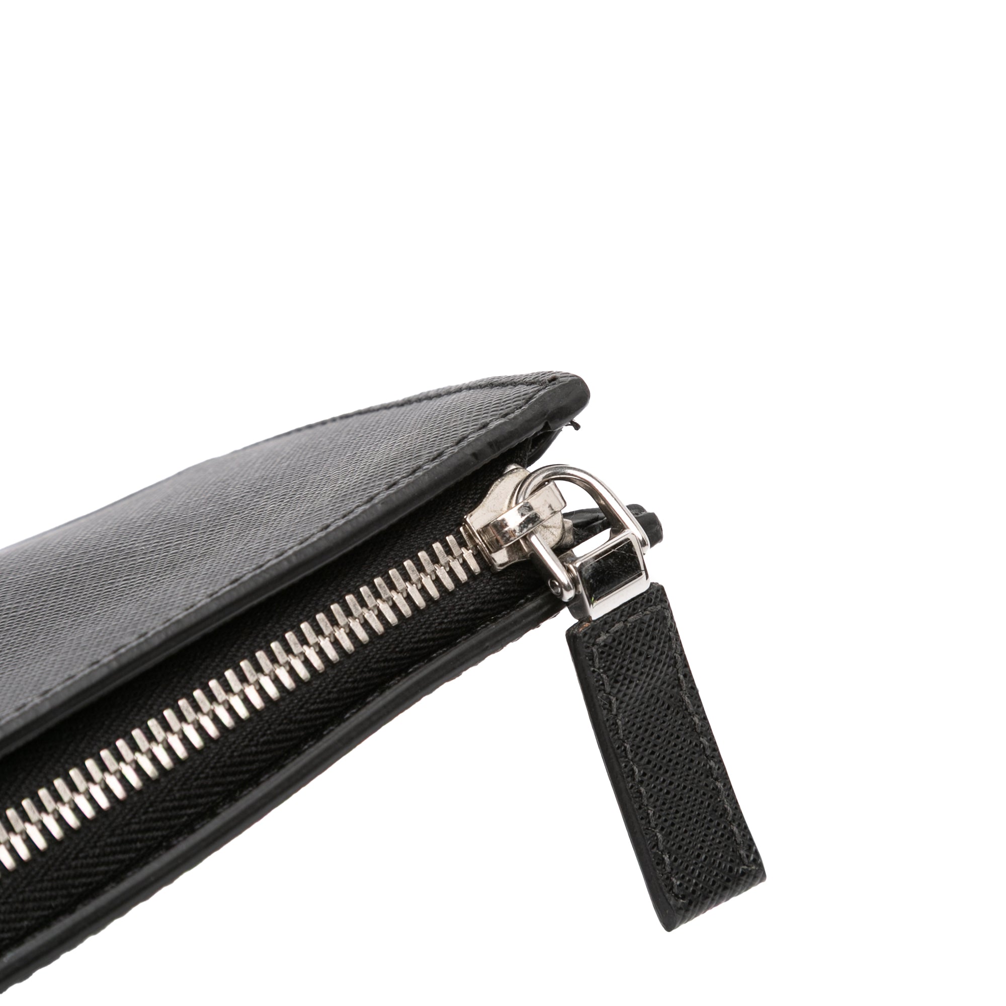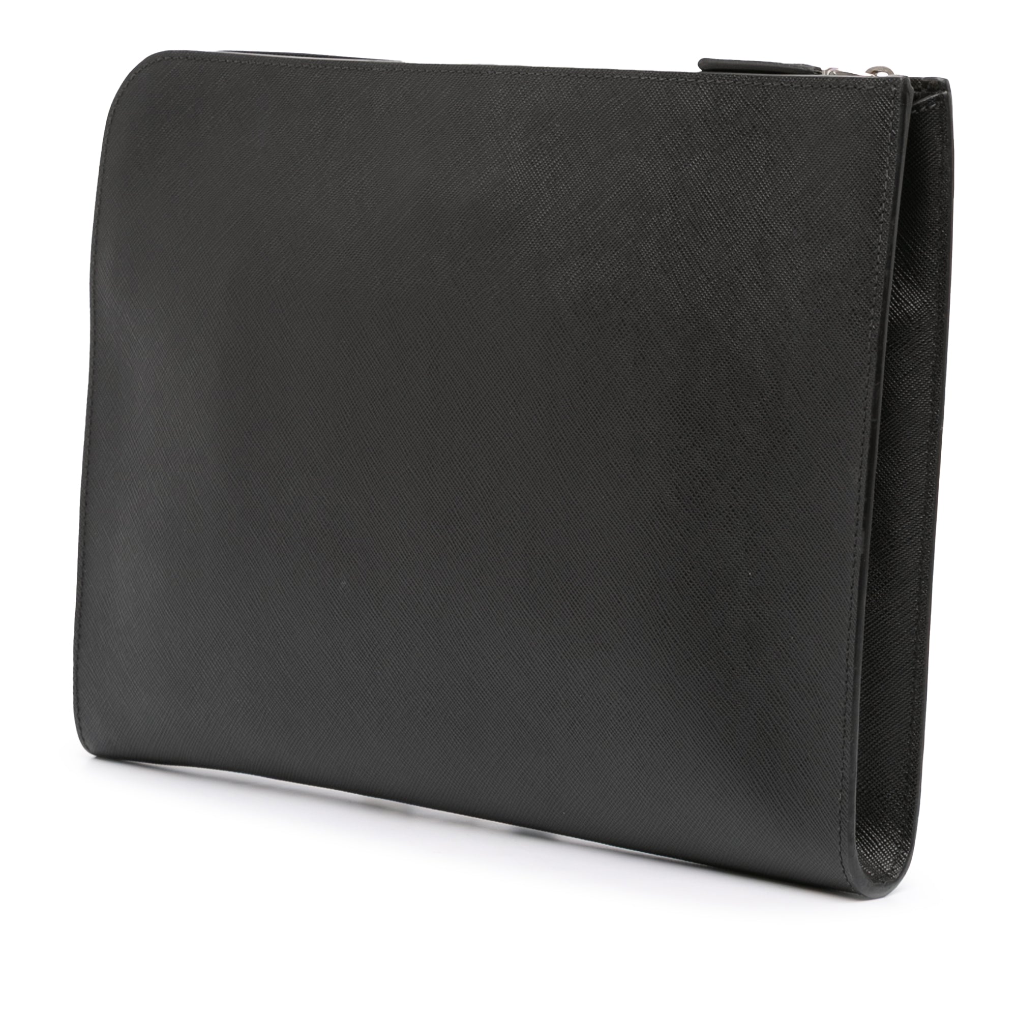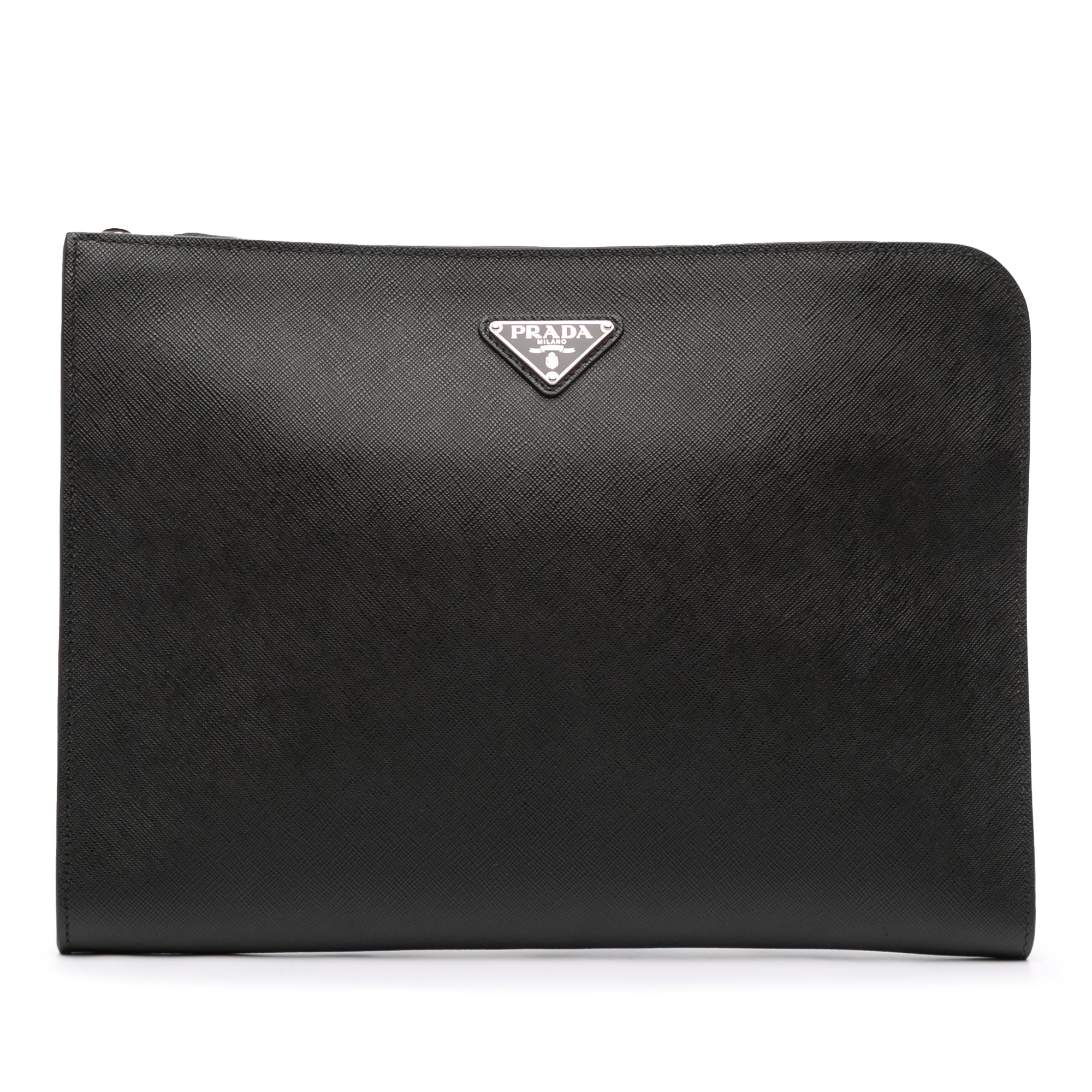 Product Details: Black Prada Saffiano Clutch. This clutch bag features a leather body, a top zip around closure, and interior slip pockets and card slots. 9.8" L x 13" W x 1.2" D.