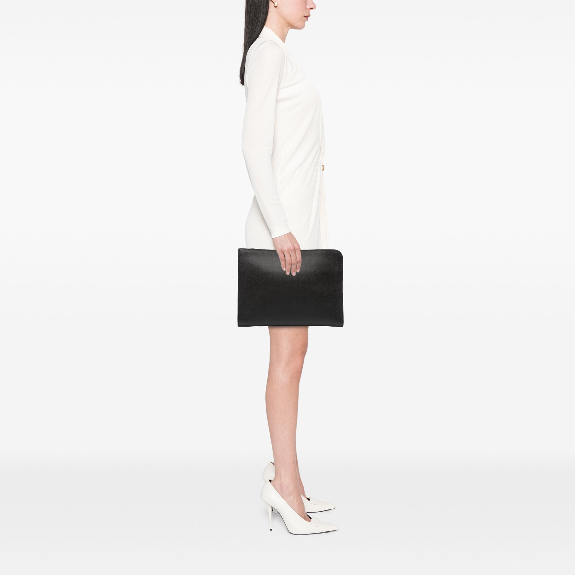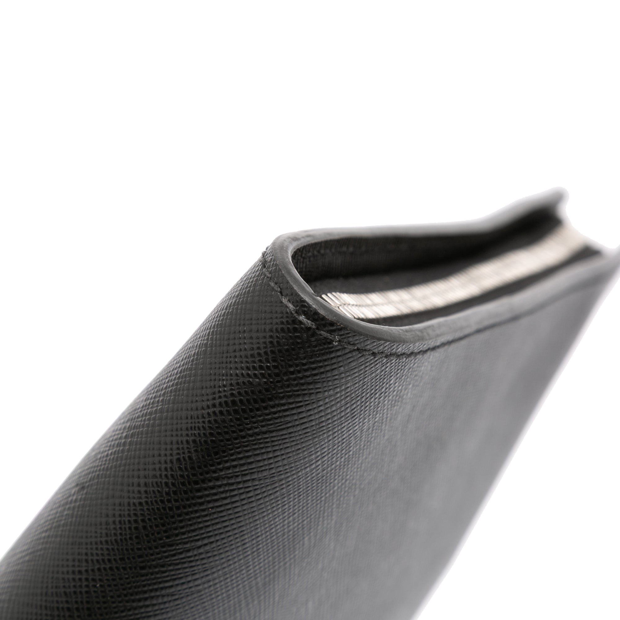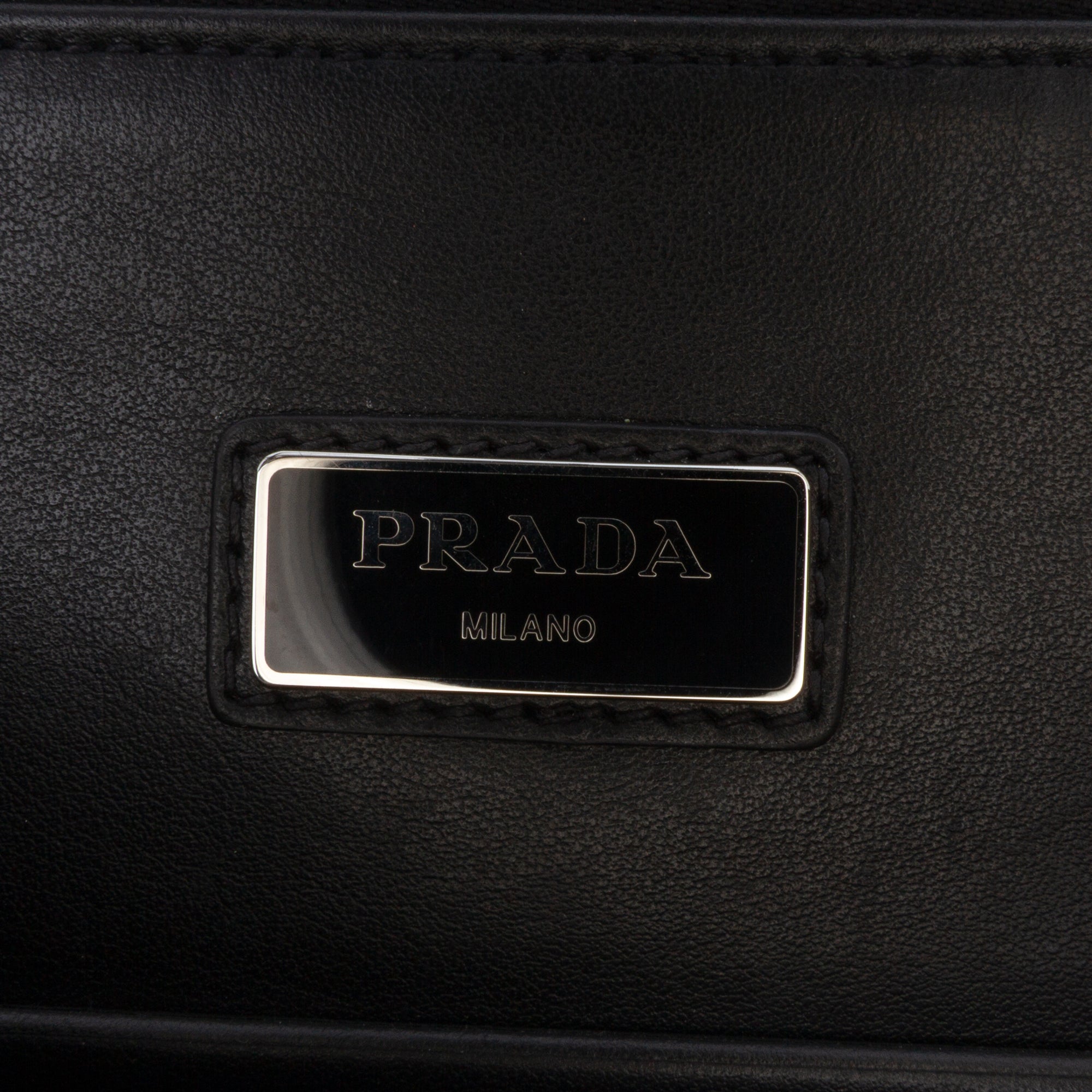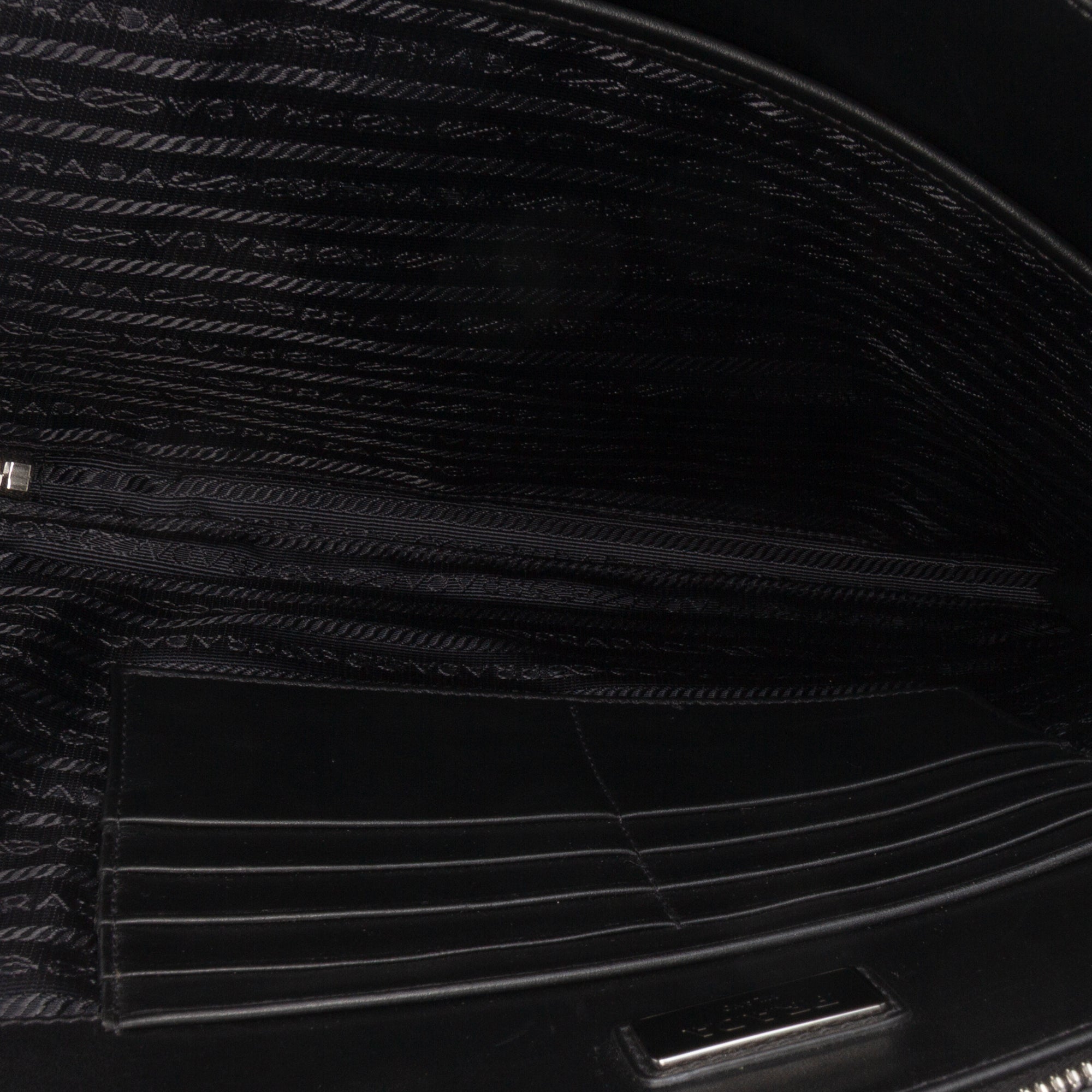 Product Details: Black Prada Saffiano Clutch. This clutch bag features a leather body, a top zip around closure, and interior slip pockets and card slots. 9.8" L x 13" W x 1.2" D.