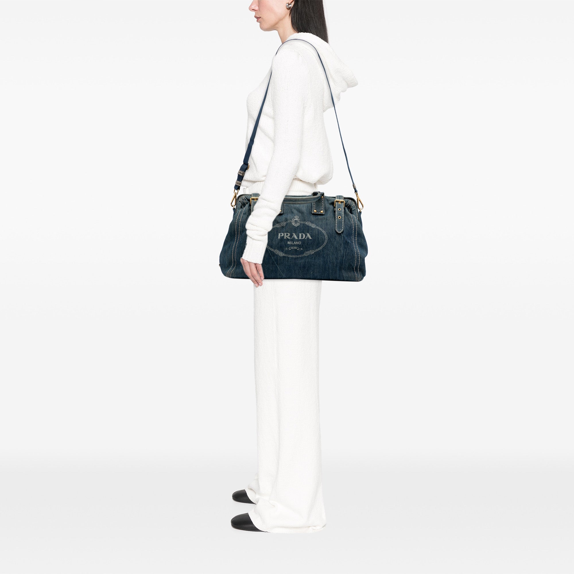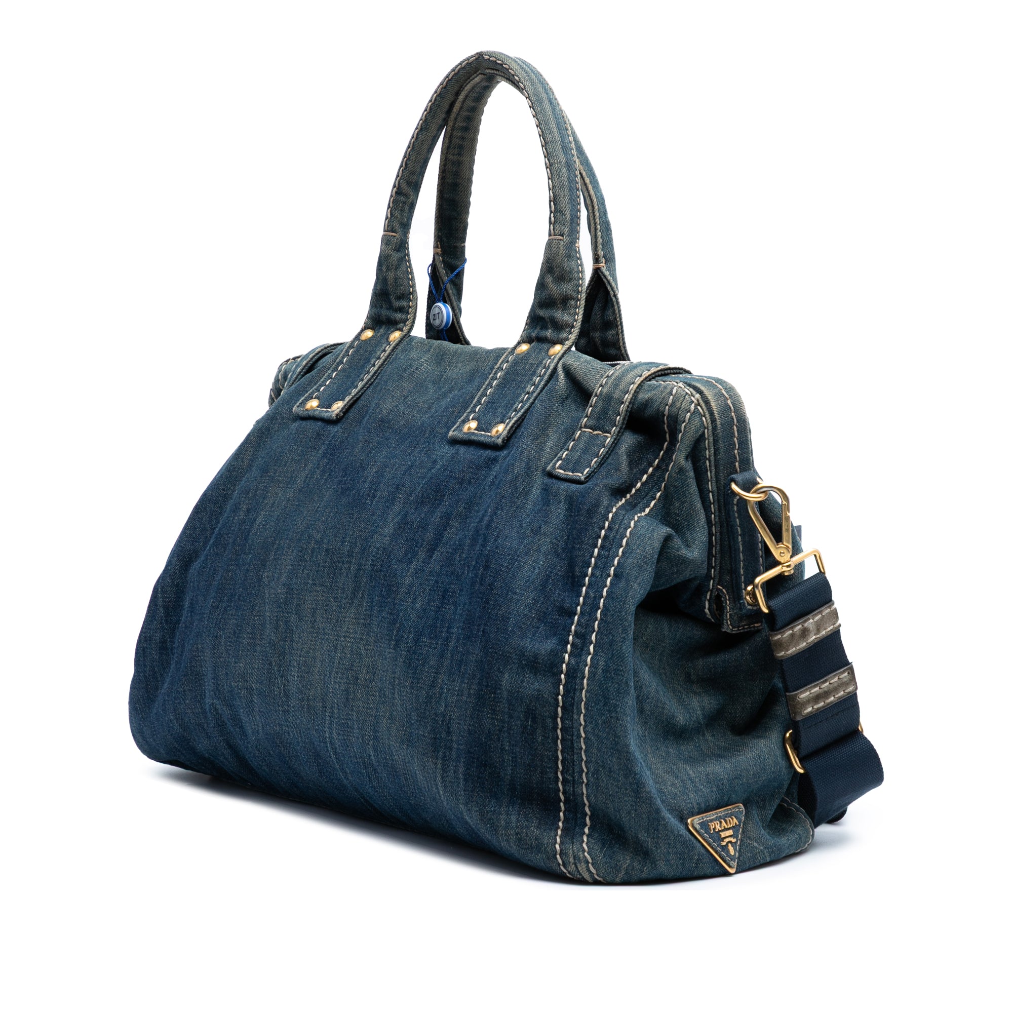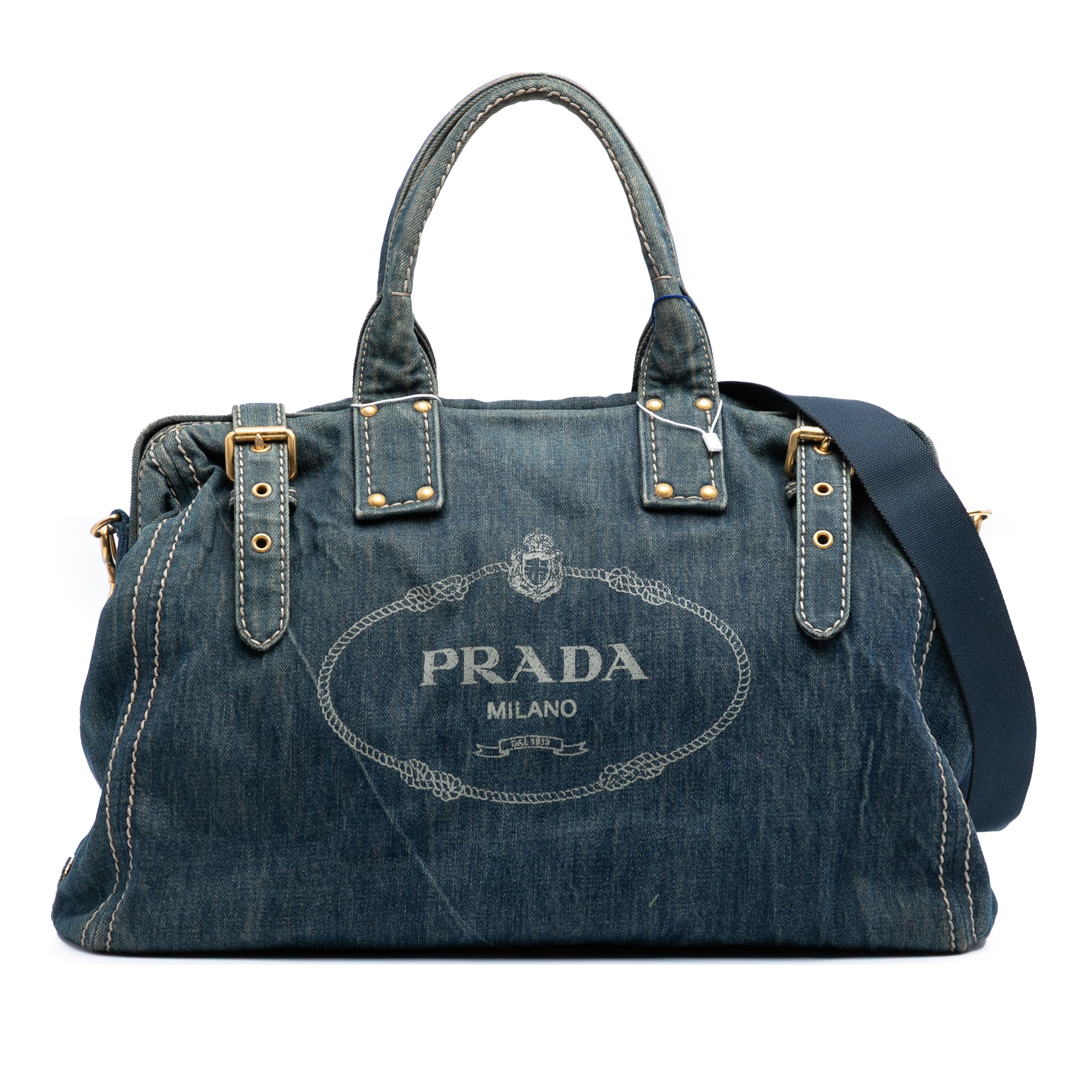 Product Details: Blue Prada Denim Canapa Logo Satchel. This satchel features a denim body, rolled handles, a detachable strap, an open top with buckle strap closures, and interior zip and slip pockets. 12.2" L x 16.3" W x 7.1" D, 5.9" drop.