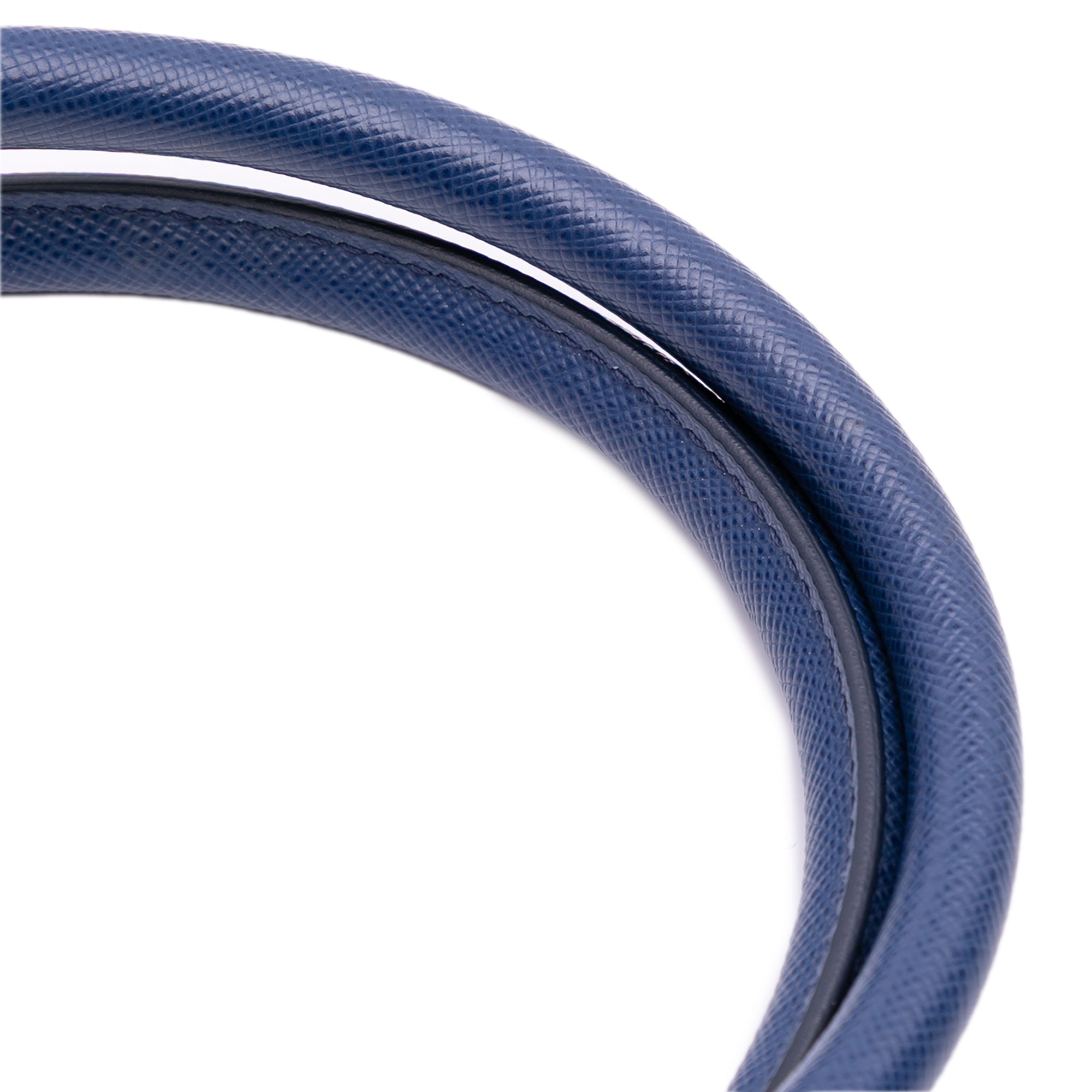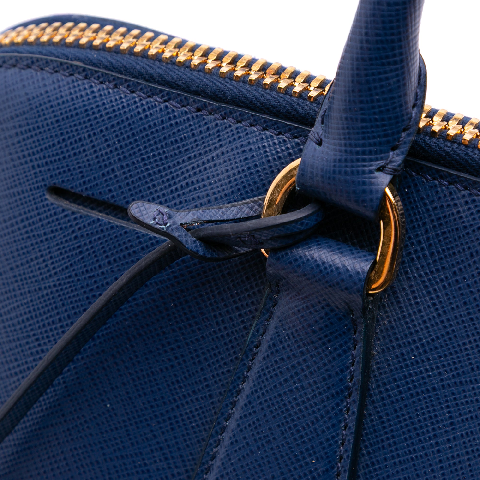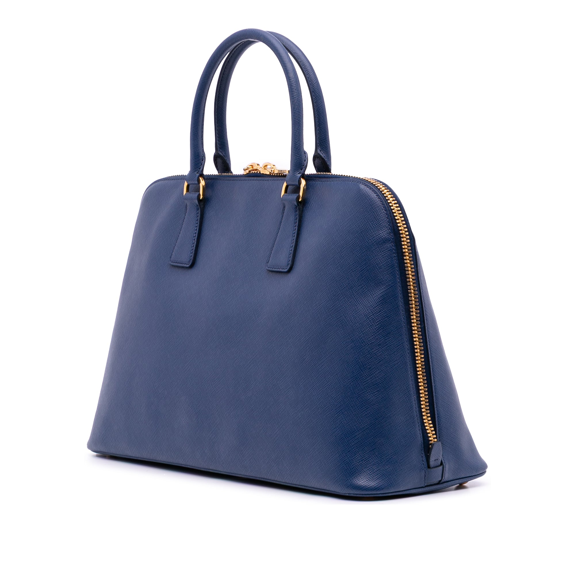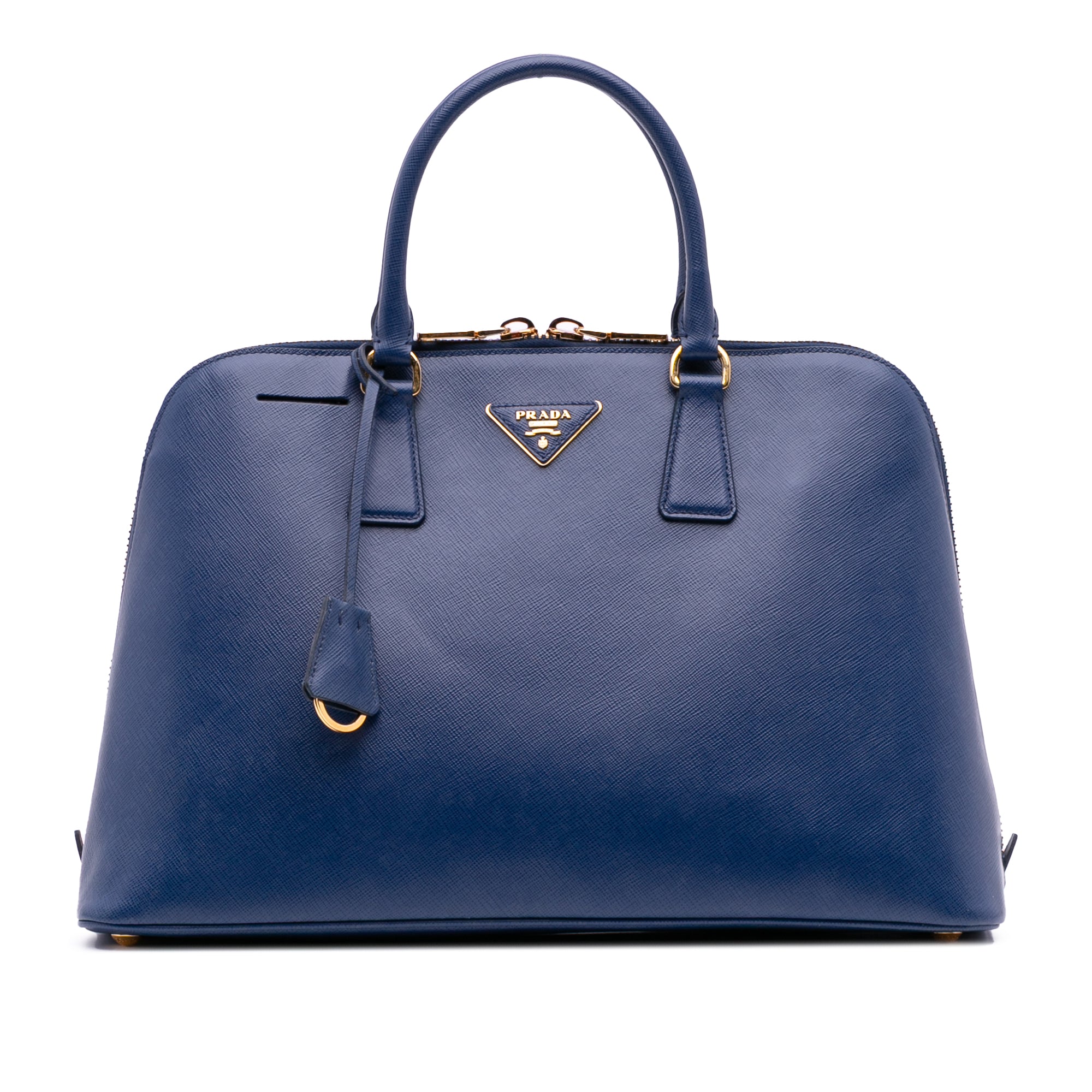 Product Details: Blue Prada Large Saffiano Lux Promenade Satchel. The Promenade features a saffiano leather body, rolled leather handles, a double zip around closure, an interior center zip compartment, and interior zip and slip pockets. 10" L x 15.2" W x 5.9" D, 4.5" drop.