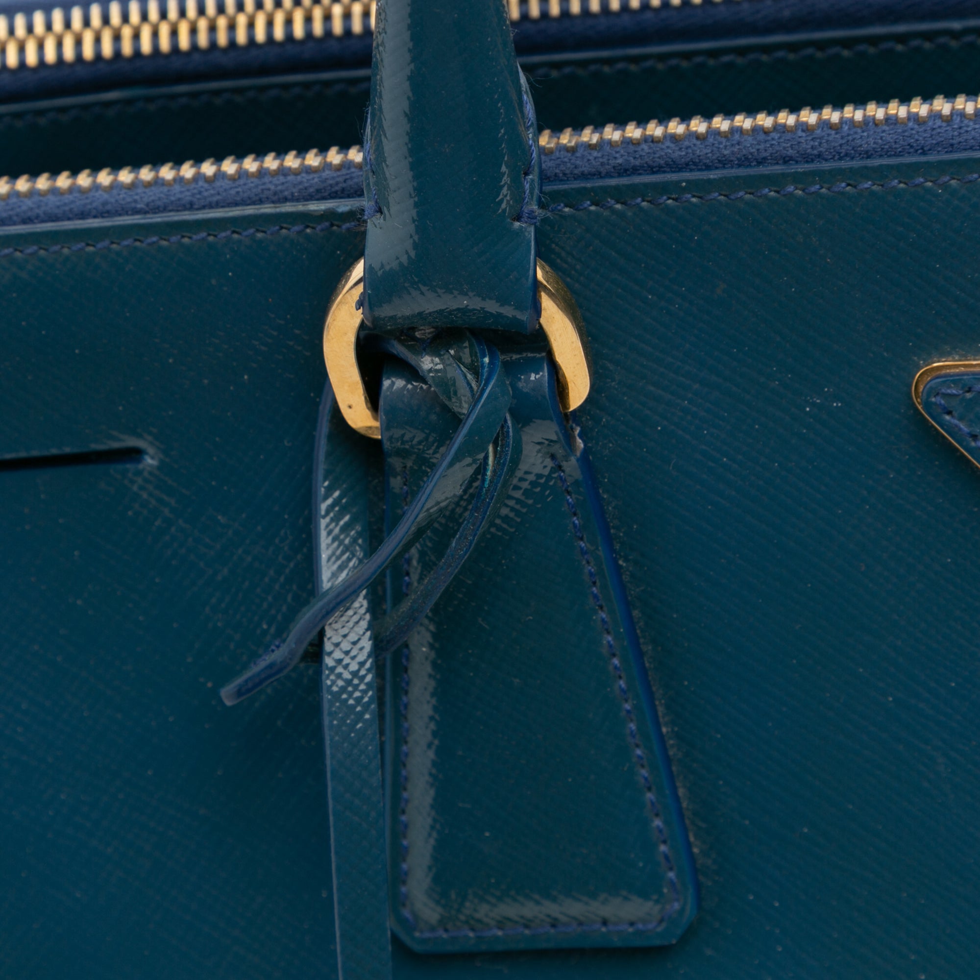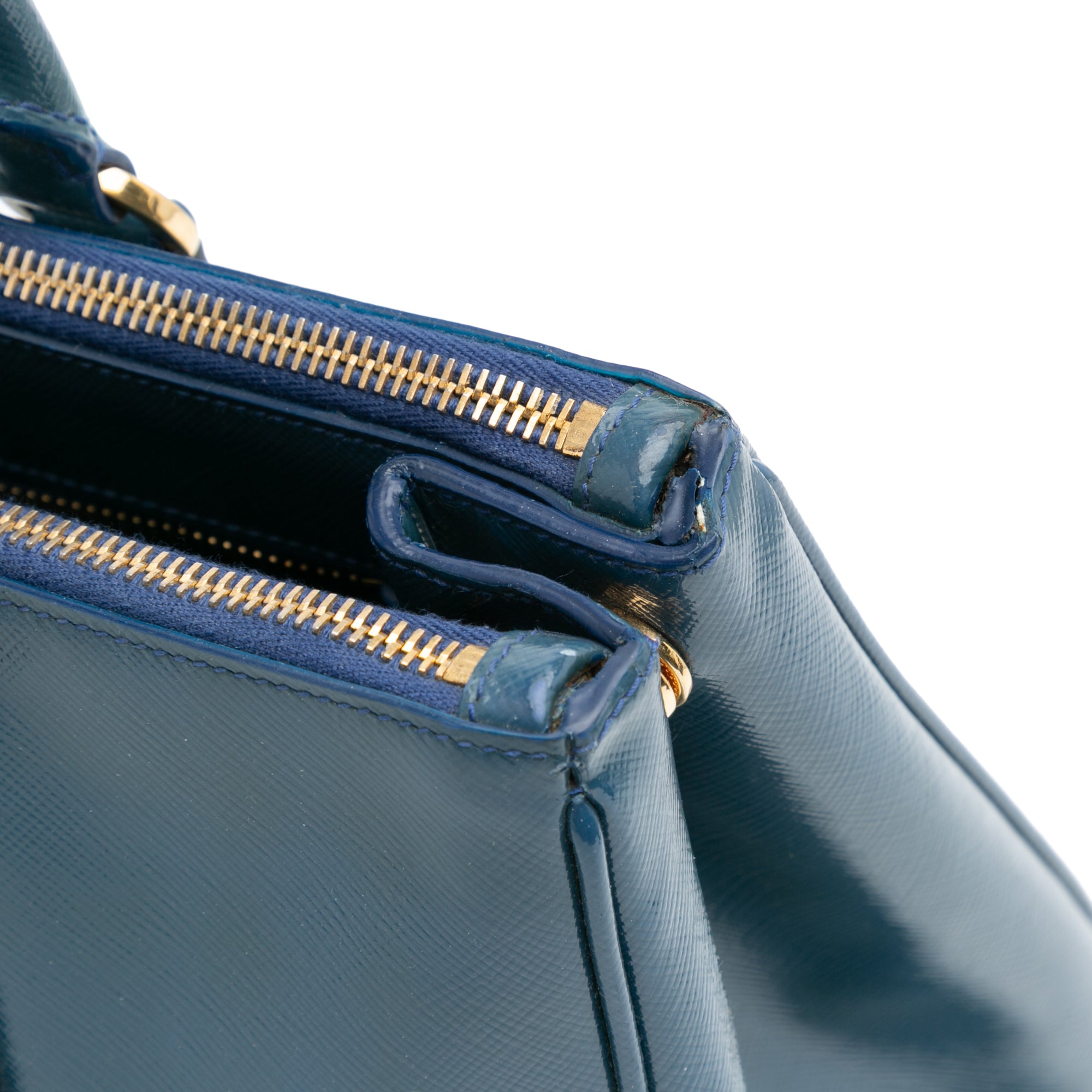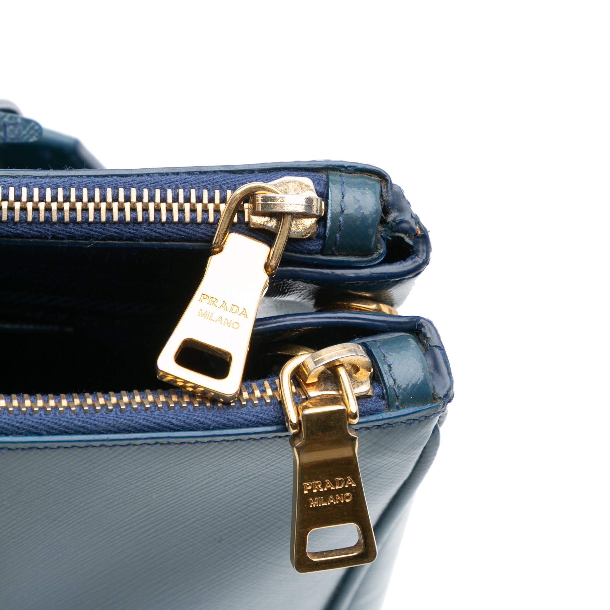 Product Details: Blue Prada Medium Saffiano Vernice Galleria Double Zip Satchel. The Medium Double Zip Galleria satchel features a saffiano vernice leather body, rolled handles, a detachable flat leather strap, an open top, dual zip compartments, and interior zip and slip pockets. 9.4" L x 13.8" W x 5.9" D, 4.7" drop.
