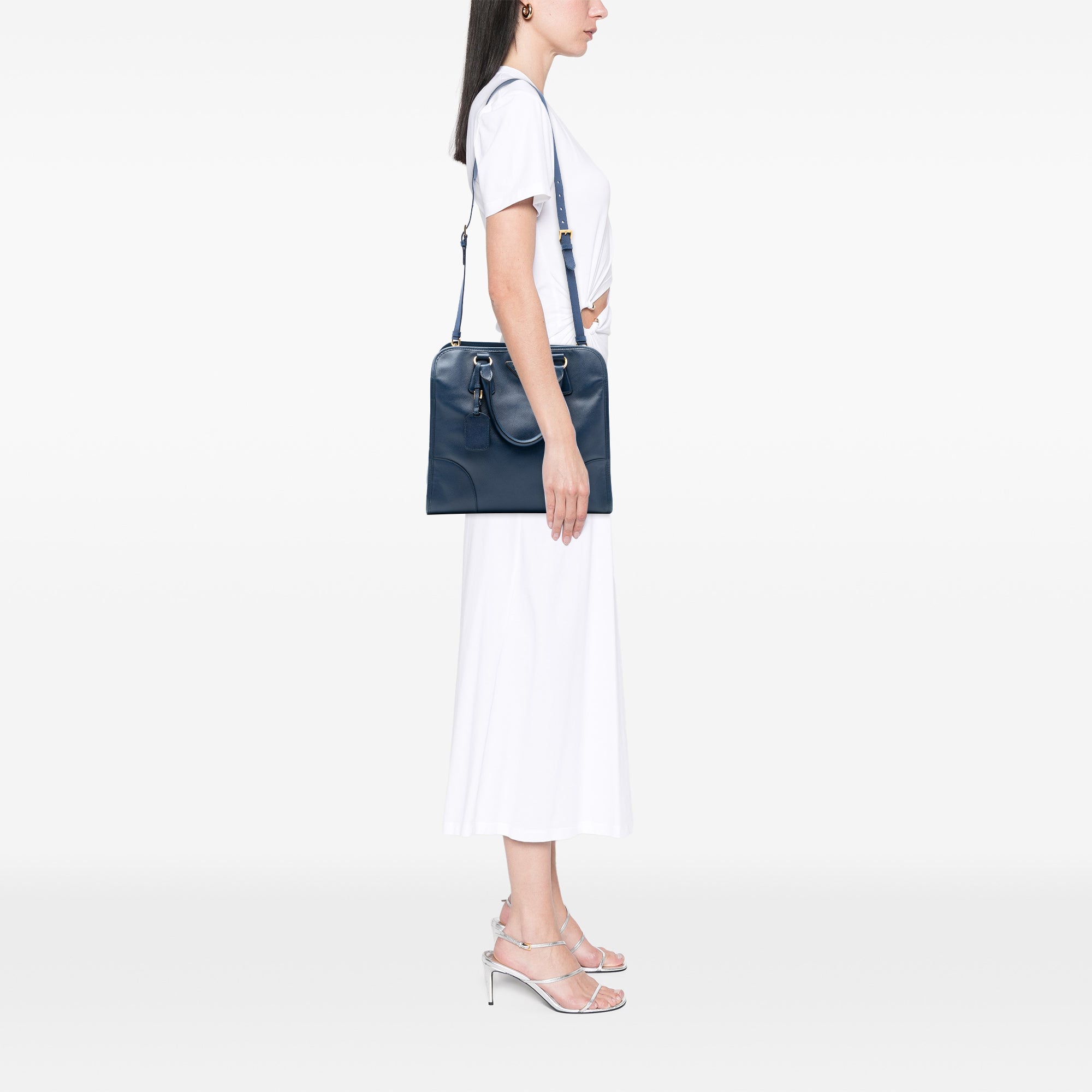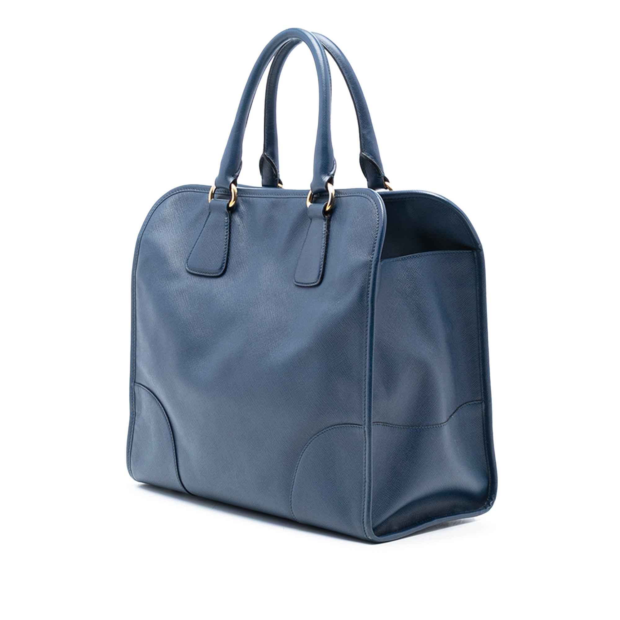 Product Details: Blue Prada Saffiano Lux Shopping Tote Satchel. This satchel features a saffiano leather body with leather trim, rolled leather handles, a detachable and adjustable shoulder strap, an open top with magnetic snap closure, and interior zip and slip pockets. Exterior bottom has been repainted. 11.4" L x 12.8" W x 6.3" D, 5.5" drop.