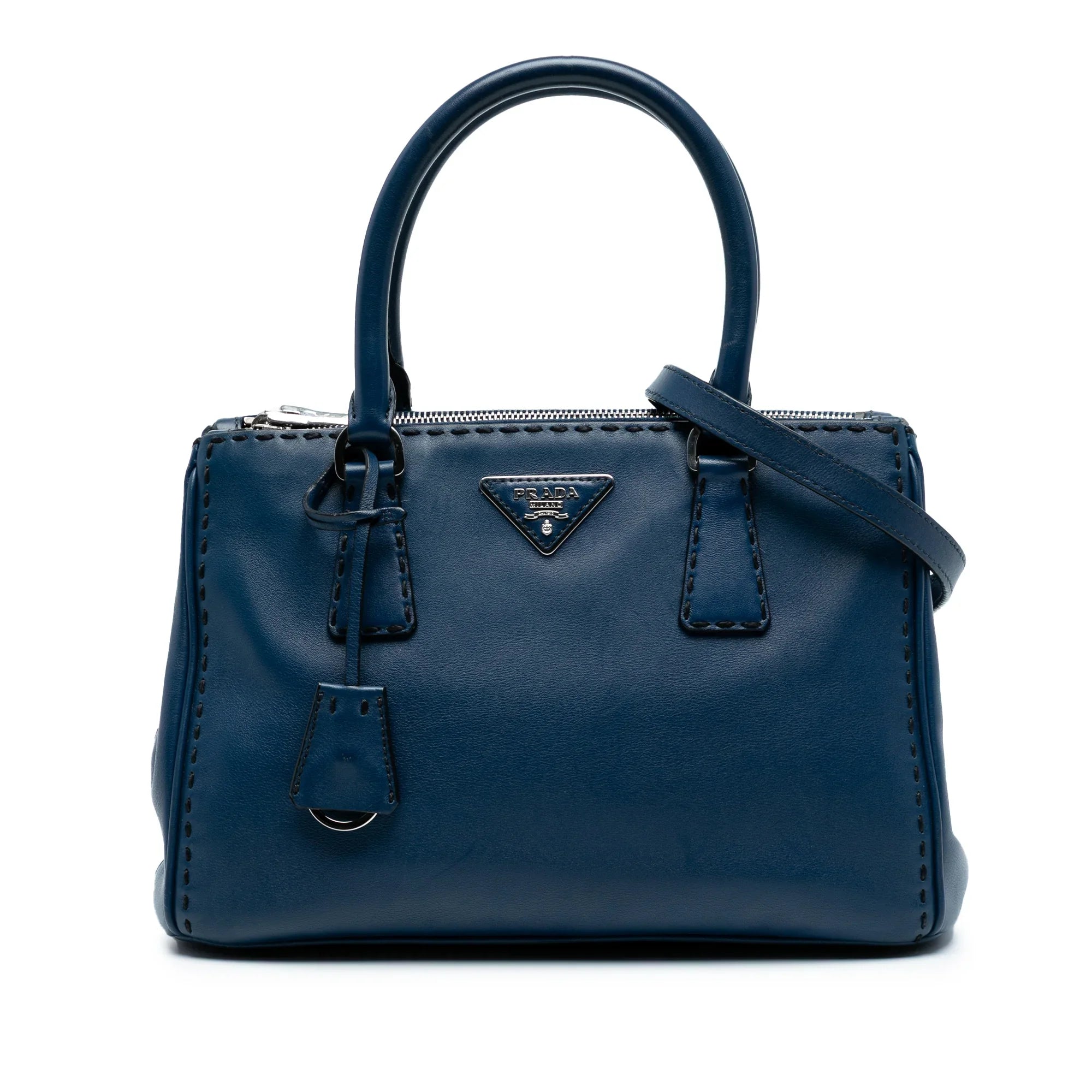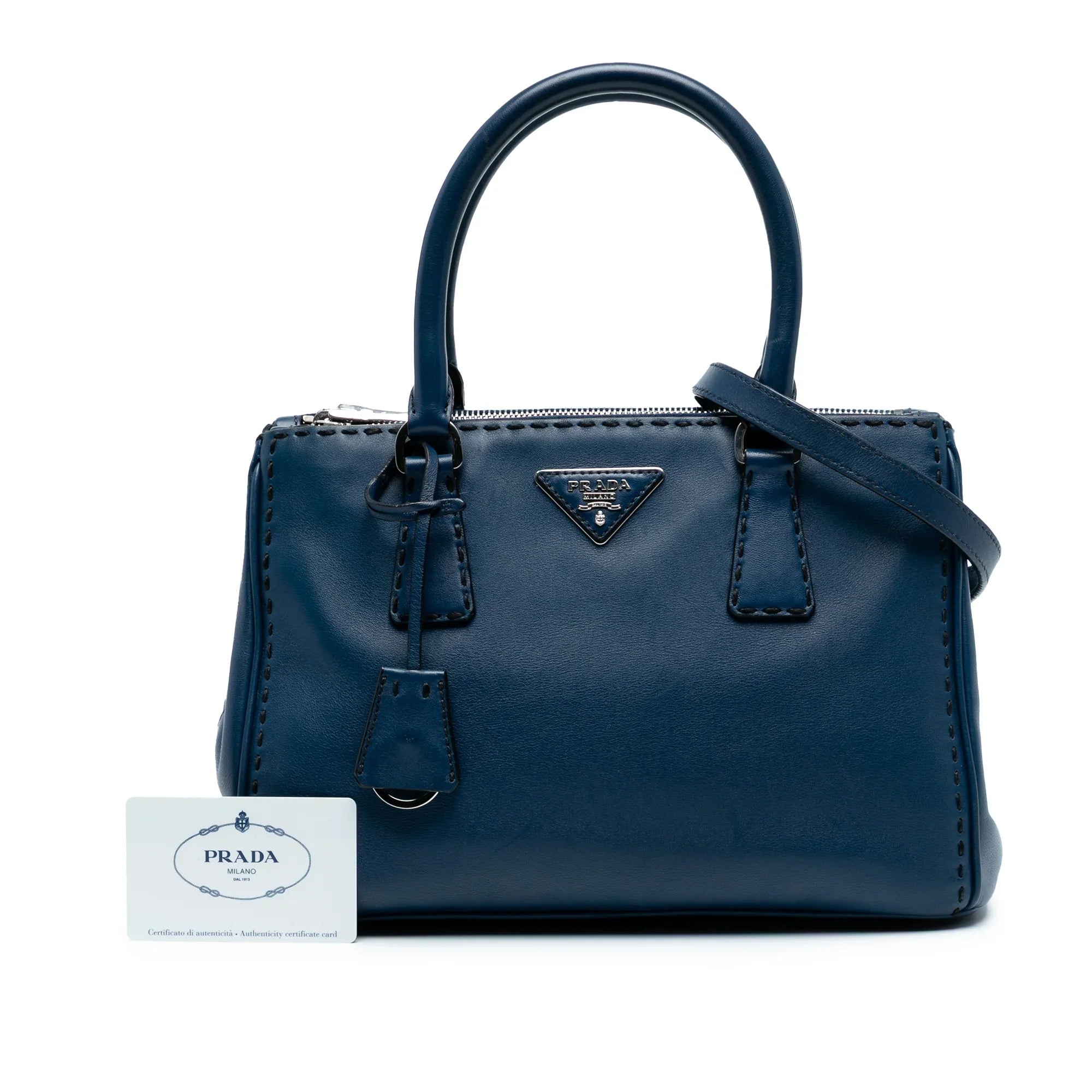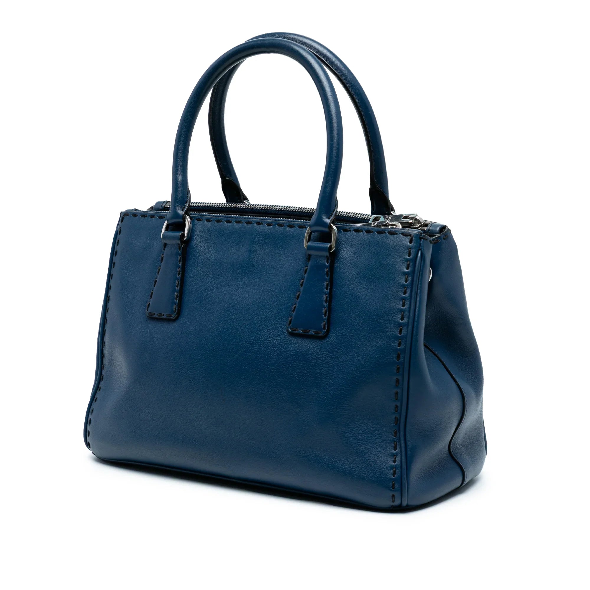 Blue Prada Small City Calf Hand Stitched Galleria Double Zip Satchel