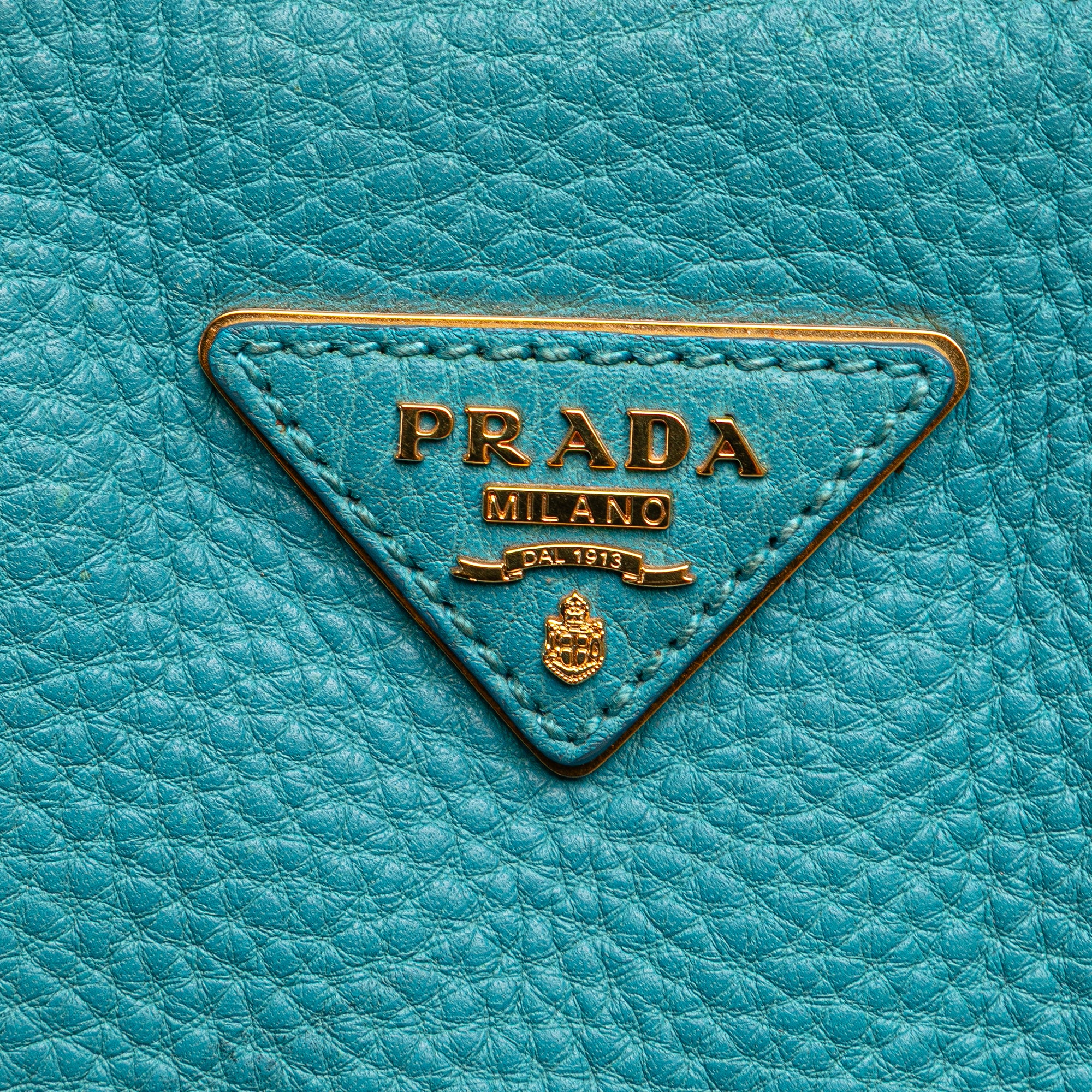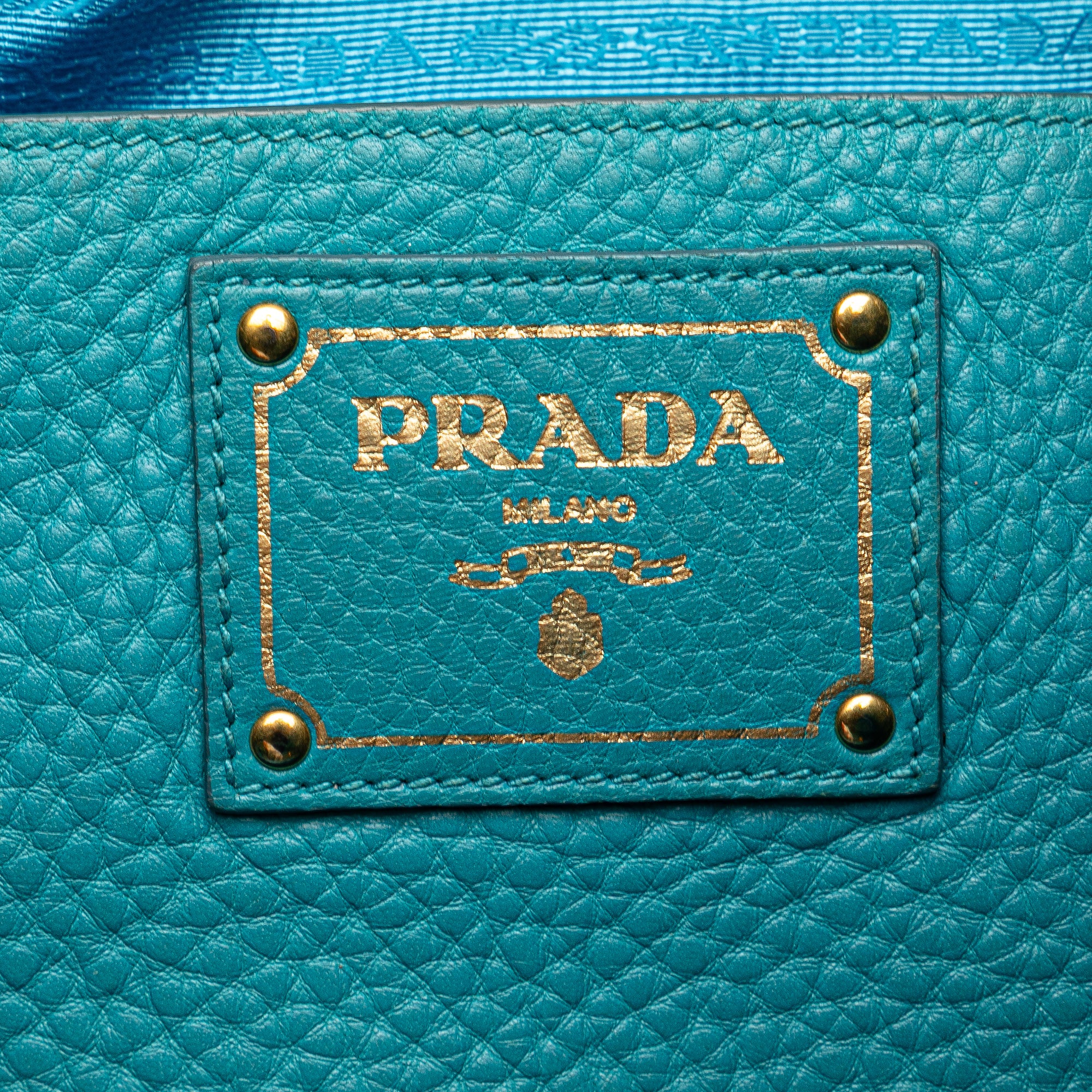 Product Details: Blue Prada Vitello Daino Side Zip Twin Pocket Open Convertible Tote Satchel. This satchel features a leather body with side zip details, rolled leather handles, a detachable flat leather shoulder strap, an open top with snap button closure, an exterior front flap pocket, and interior zip and slip pockets. 10.6" L x 13.4" W x 7.5" D, 5.1" drop.