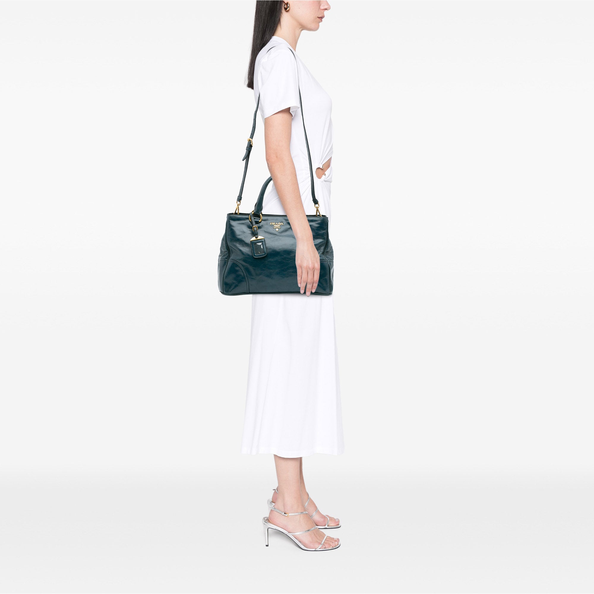 Product Details: Blue Prada Vitello Shine Satchel. This satchel features a leather body, rolled leather handles, a detachable and adjustable flat leather shoulder strap, an open top with snap closure, an interior zip compartment and interior zip and slip pockets. 9.8" L x 13.8" W x 6.1" D, 4.9" drop.