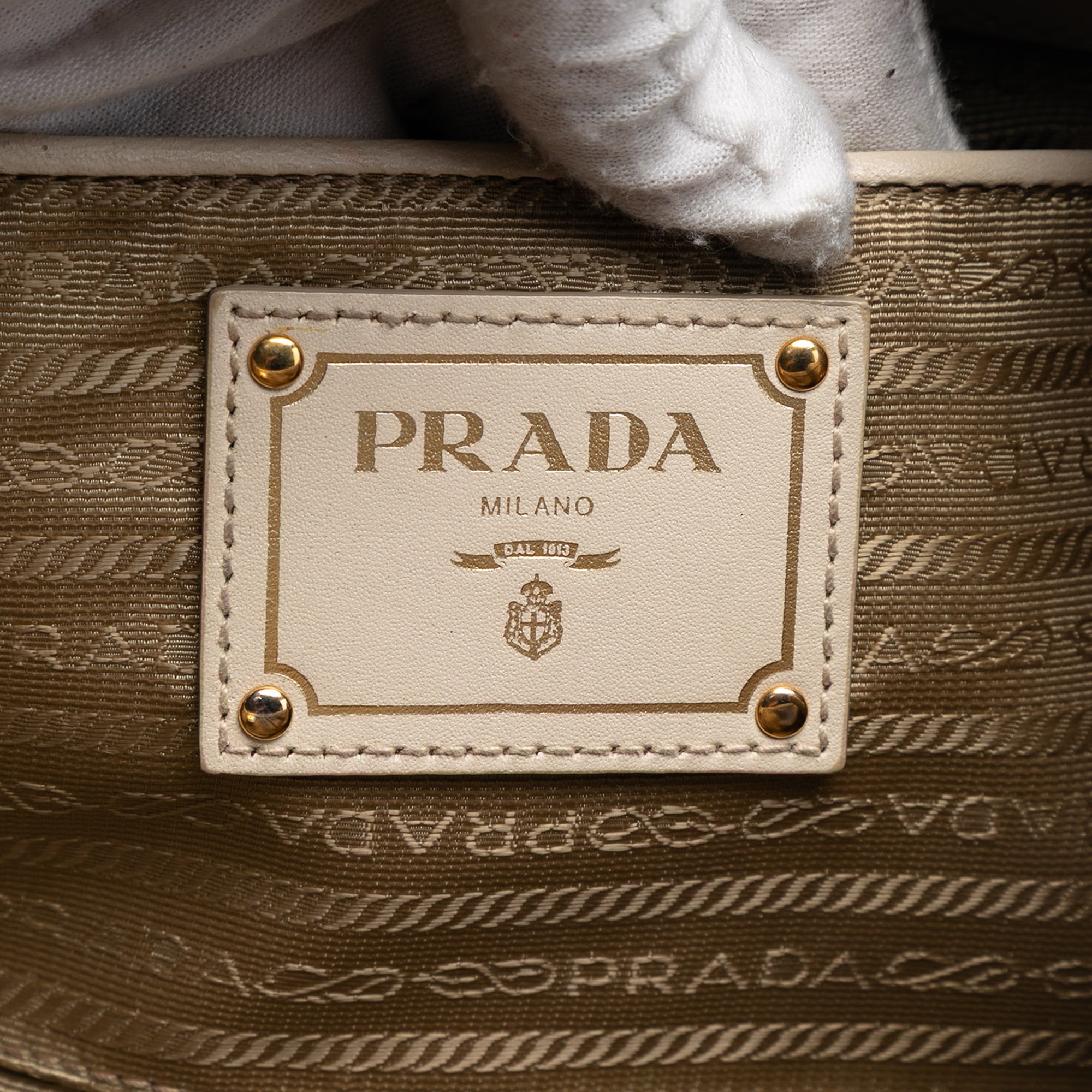 Product Details: Tan Prada Canvas Canapa Logo Bow Satchel. This satchel features a canvas body with leather trim, rolled leather handles, a detachable strap, an open top with snap closure, and interior zip and slip pockets. 8.9" L x 11" W x 6.7" D, 3.5" drop.