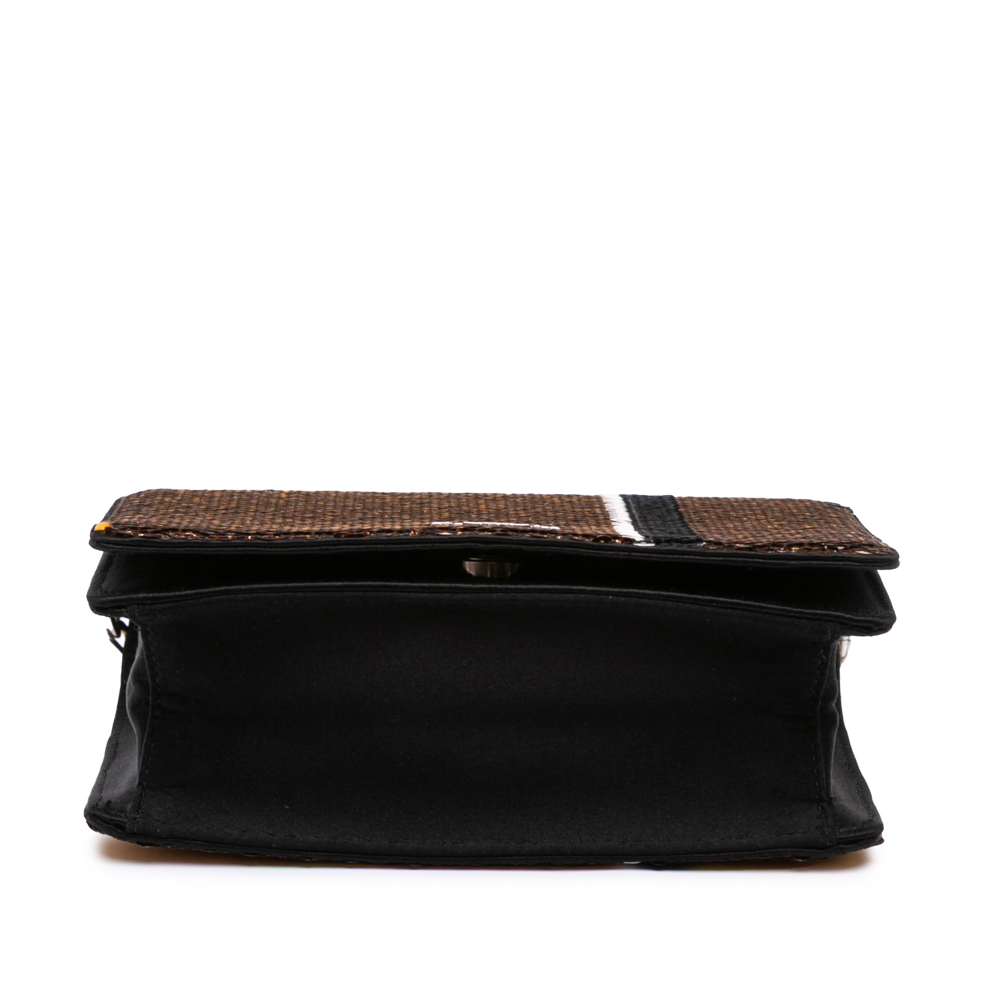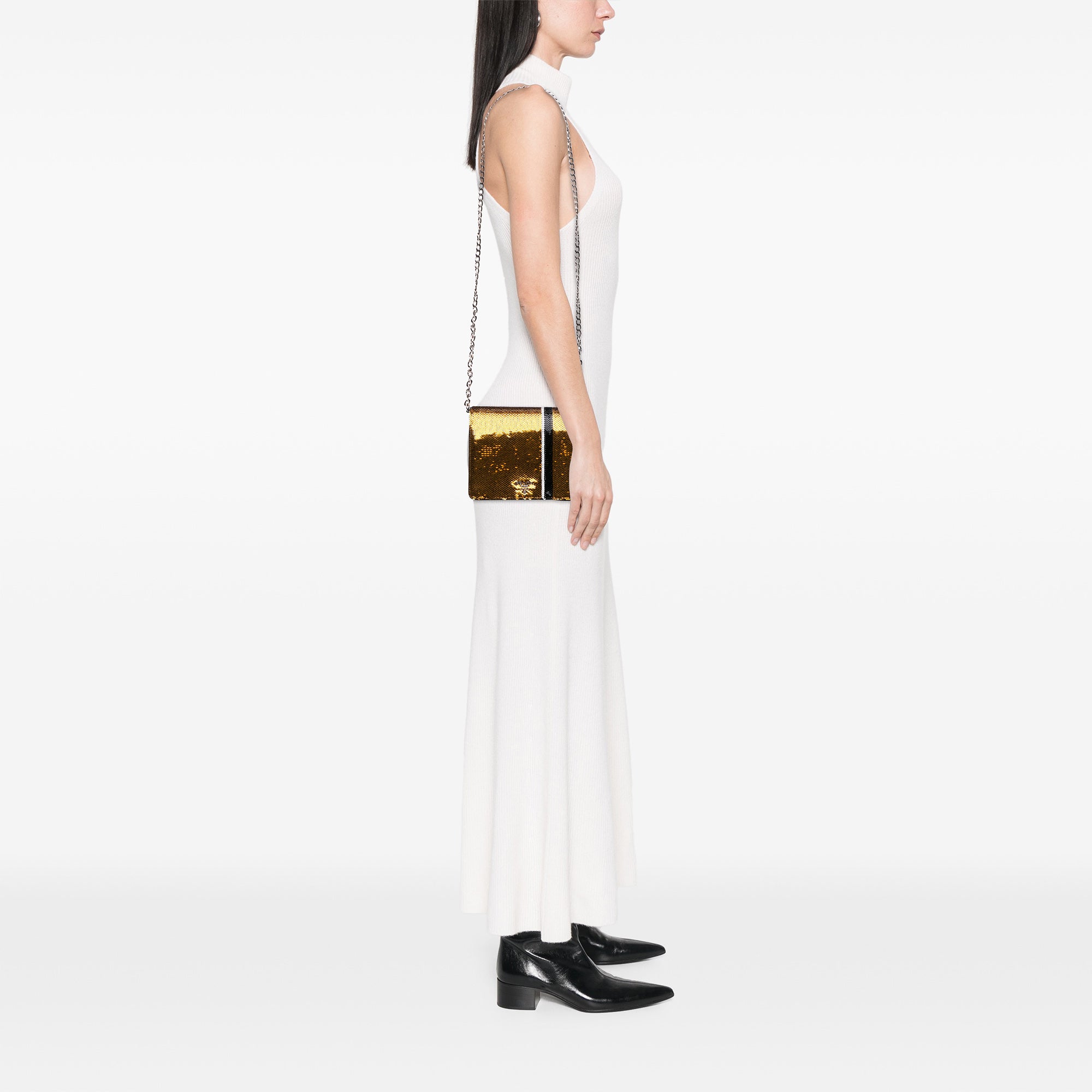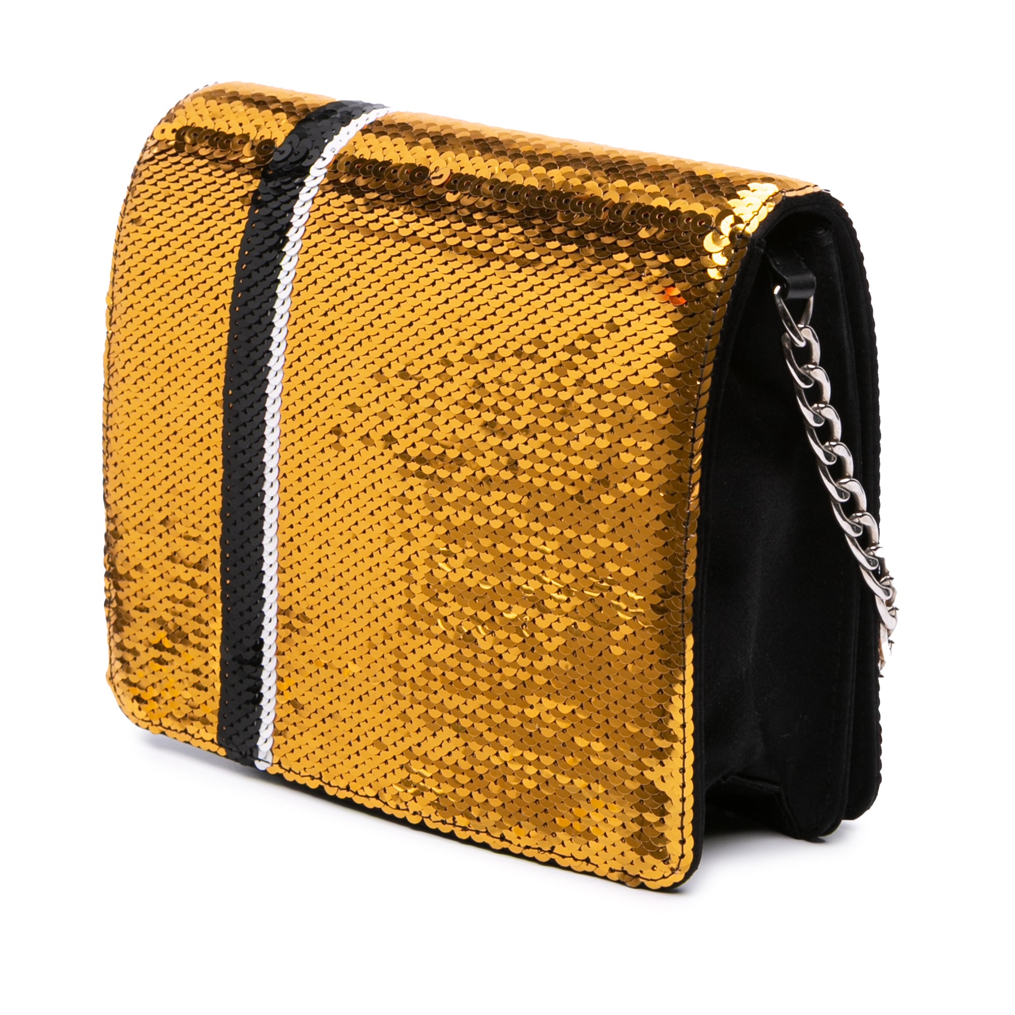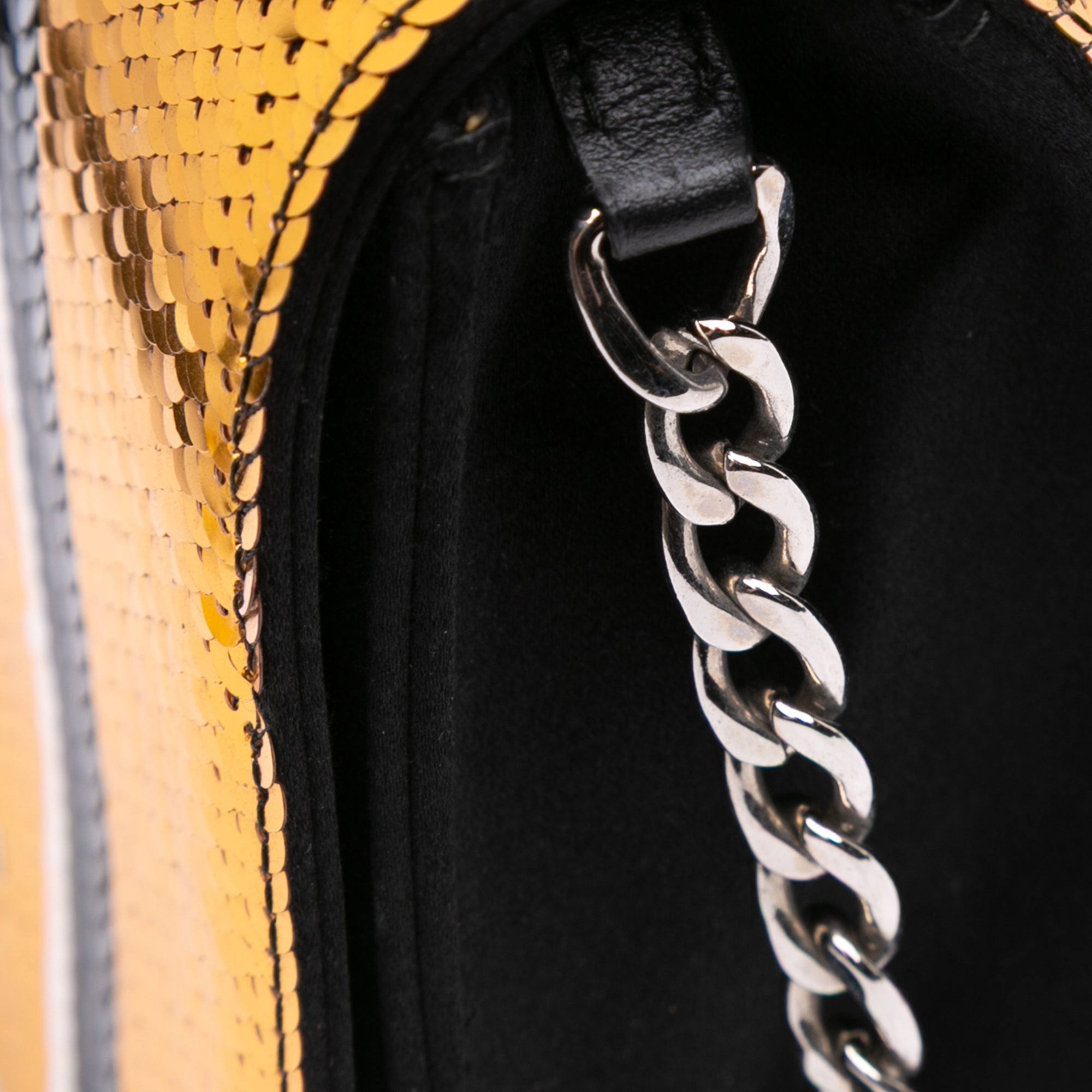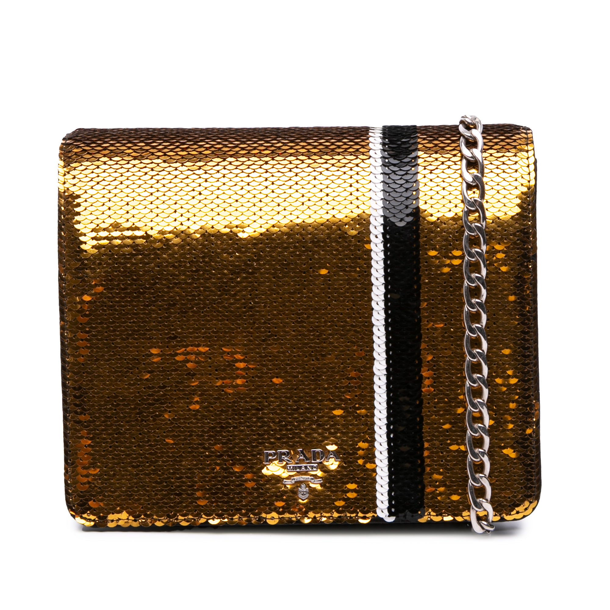 Product Details: Gold Prada Paillettes Baiadera Crossbody. This crossbody bag features a sequin embellished body, a chain link strap, a front flap with snap closure, and an interior slip pocket. 6.3" L x 7.1" W x 2" D.