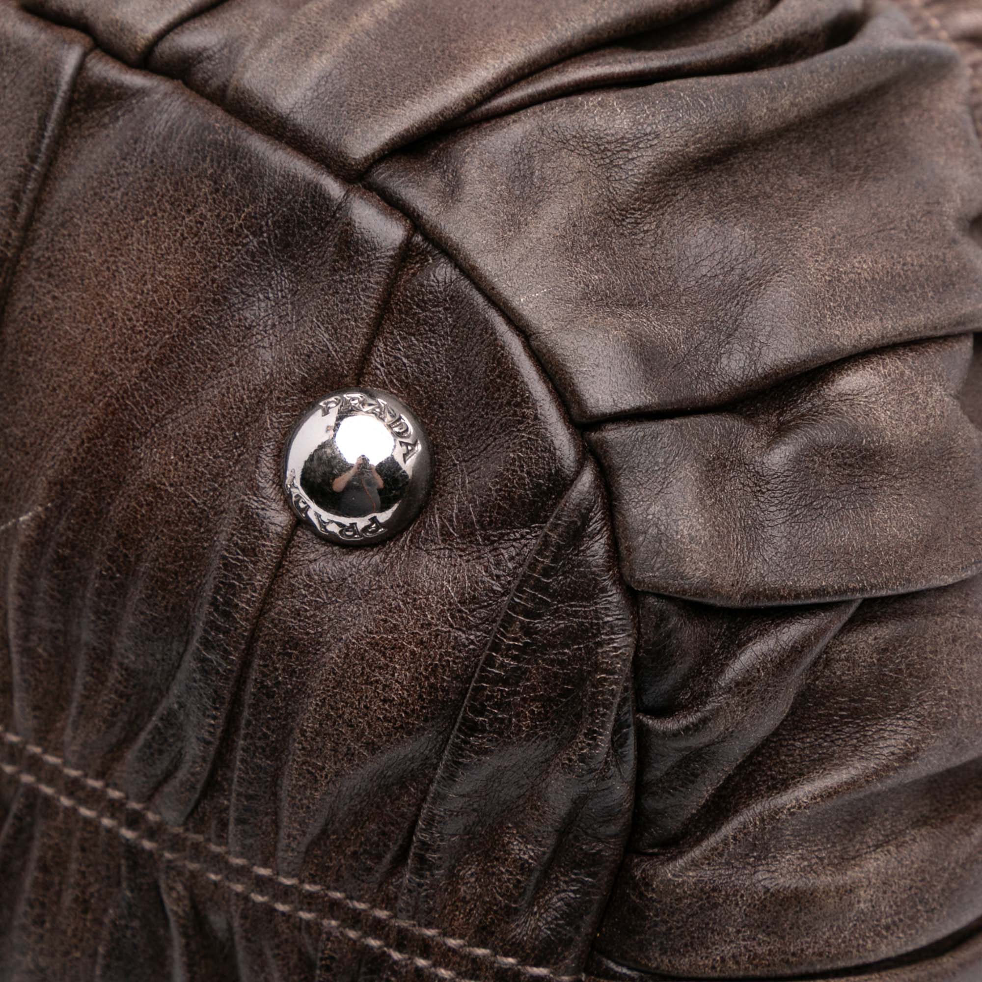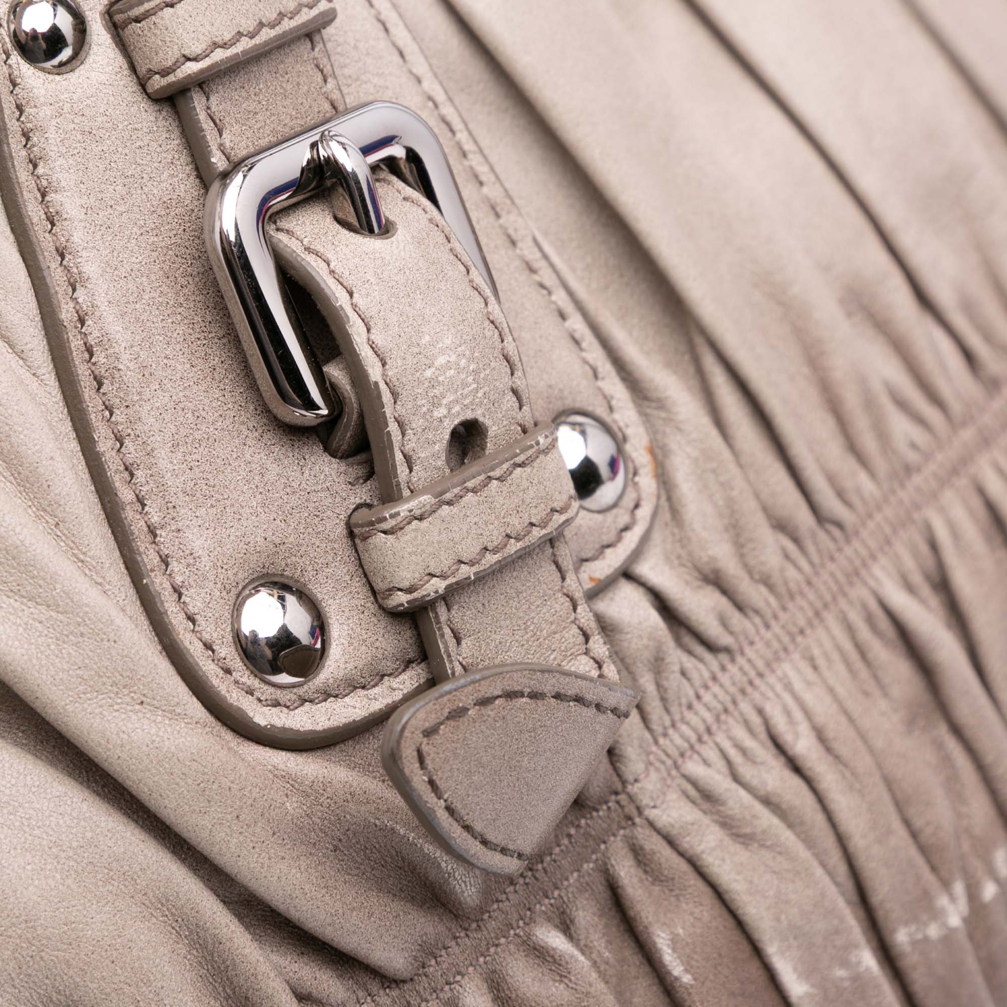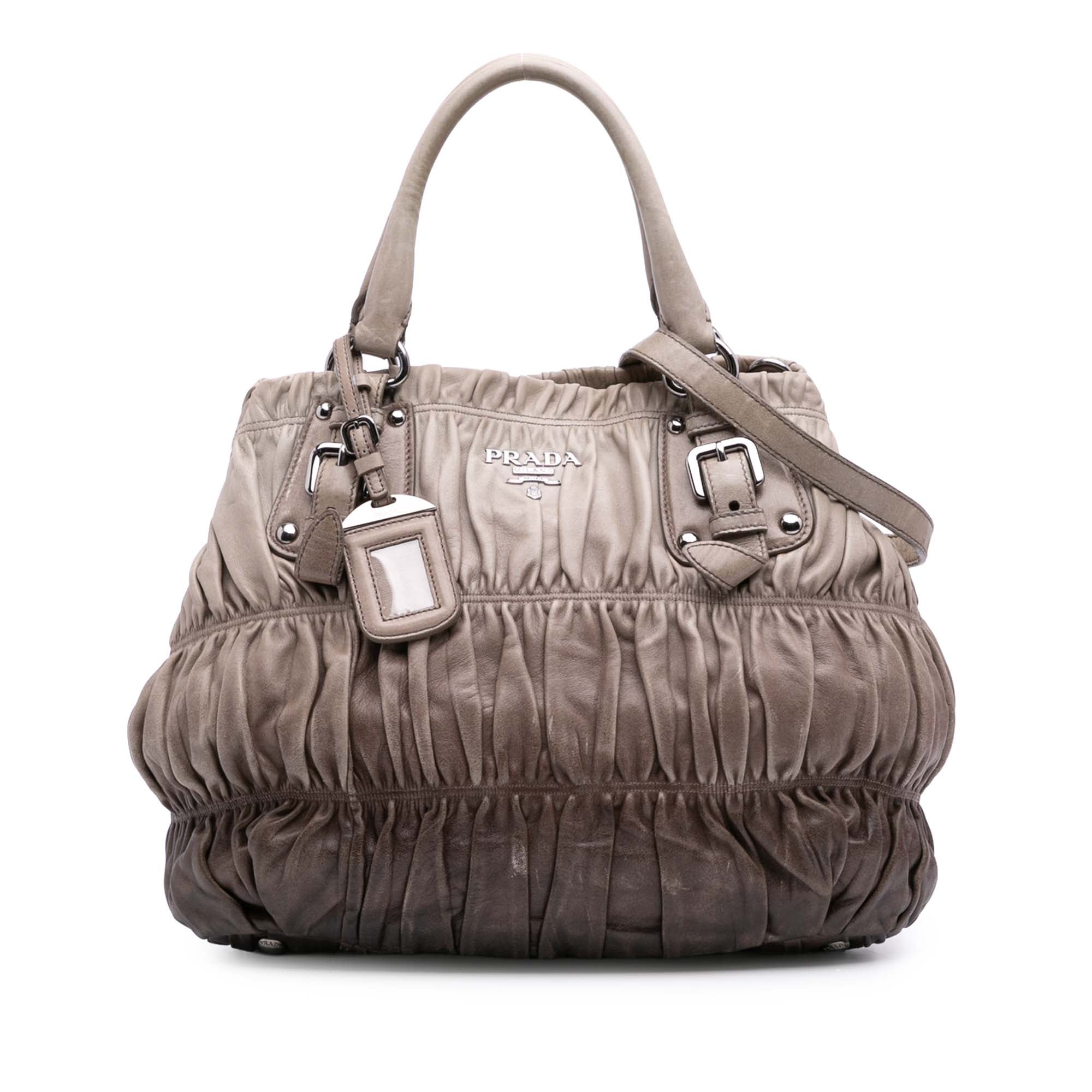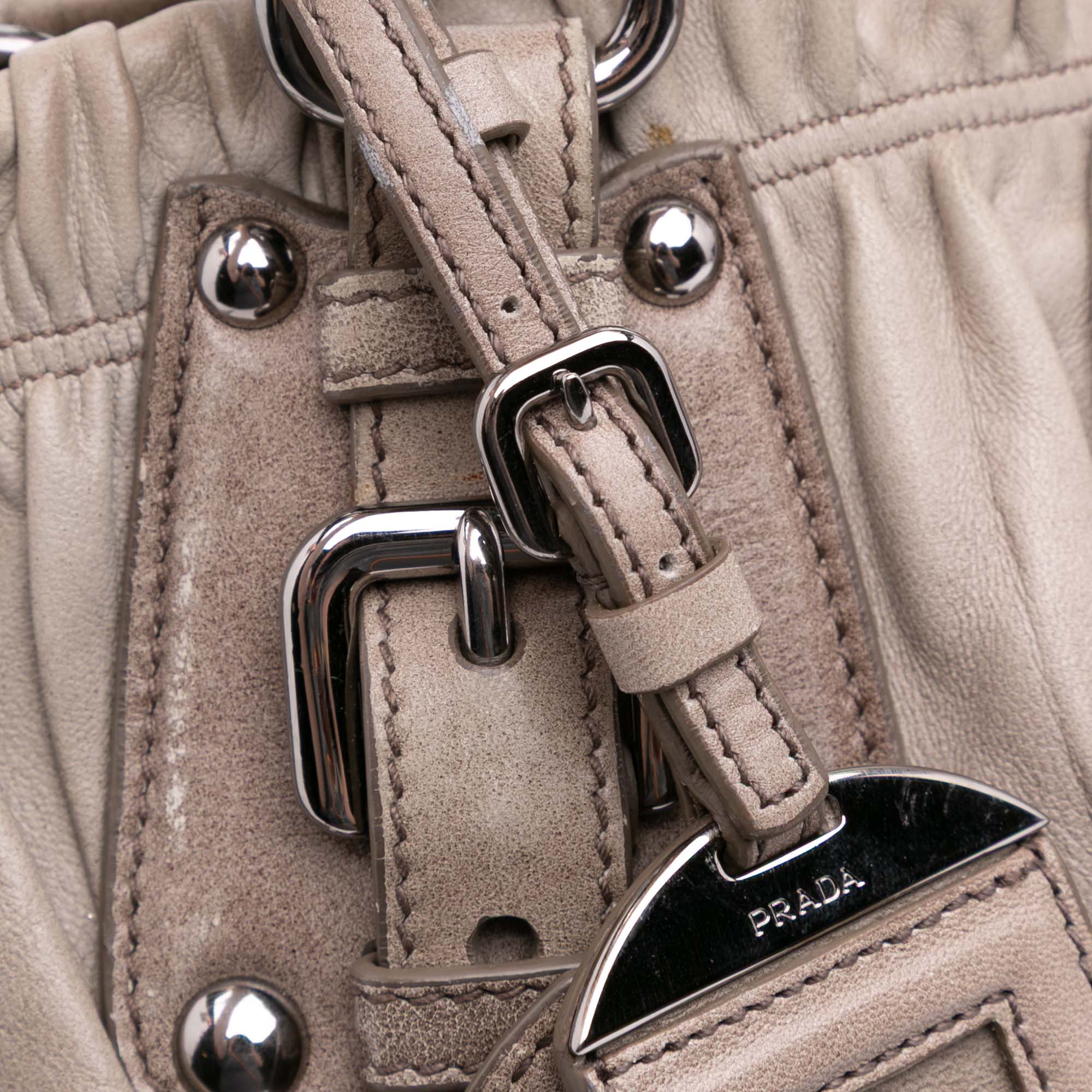Product Details: Gray Prada Nappa Gaufre Ombre Satchel. This satchel features a gathered leather body, rolled leather handles, a detachable strap, an open top with snap button closure, and interior zip and slip pockets. 11.4" L x 12.2" W x 5.5" D, 5.1" drop.