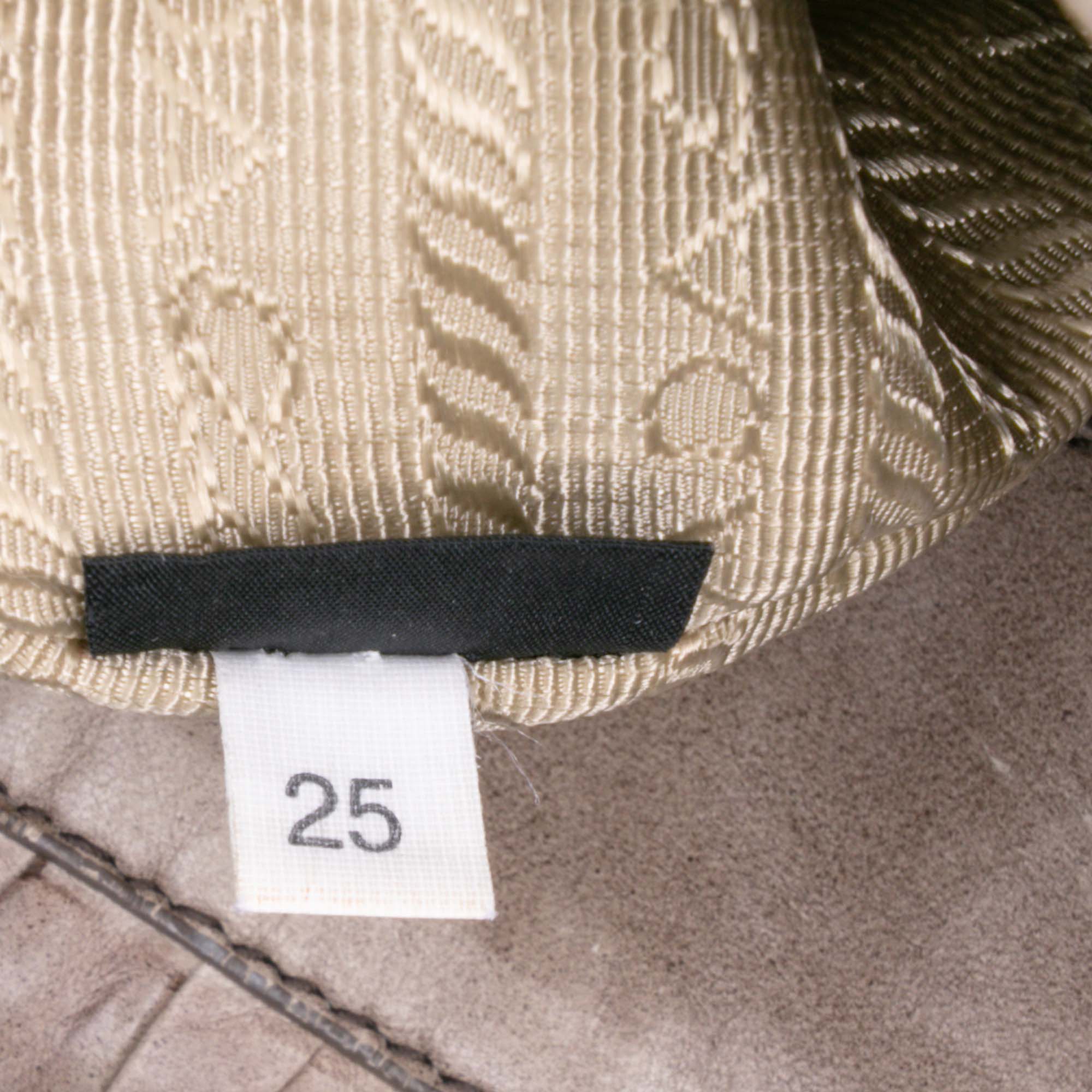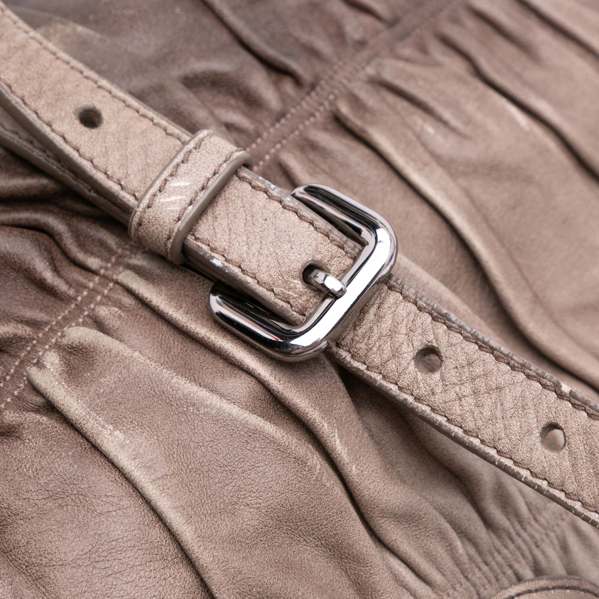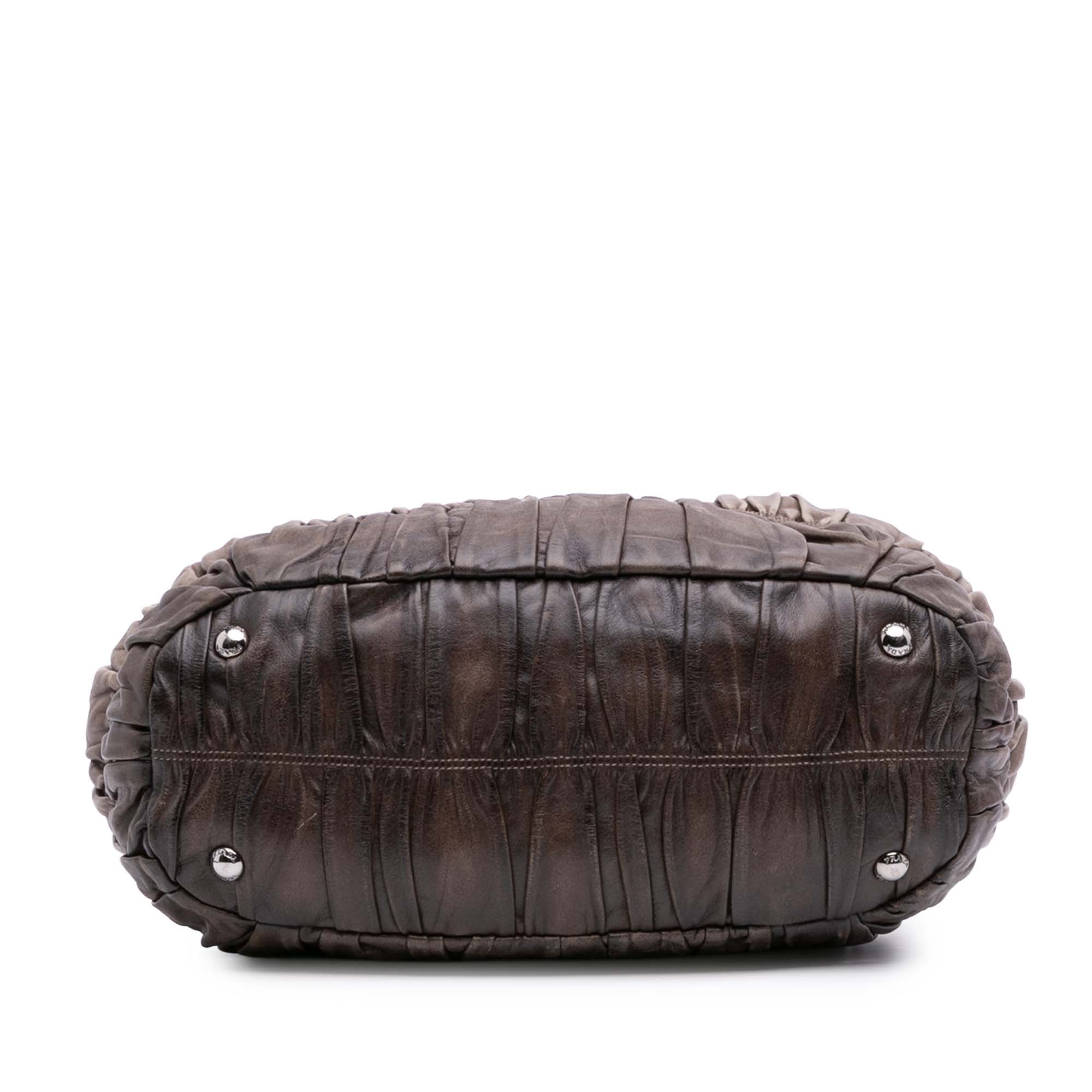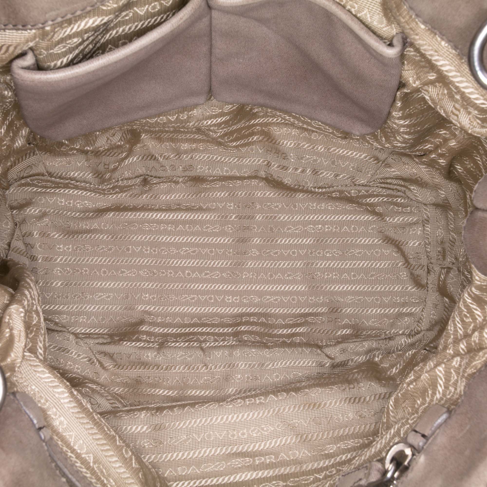 Product Details: Gray Prada Nappa Gaufre Ombre Satchel. This satchel features a gathered leather body, rolled leather handles, a detachable strap, an open top with snap button closure, and interior zip and slip pockets. 11.4" L x 12.2" W x 5.5" D, 5.1" drop.