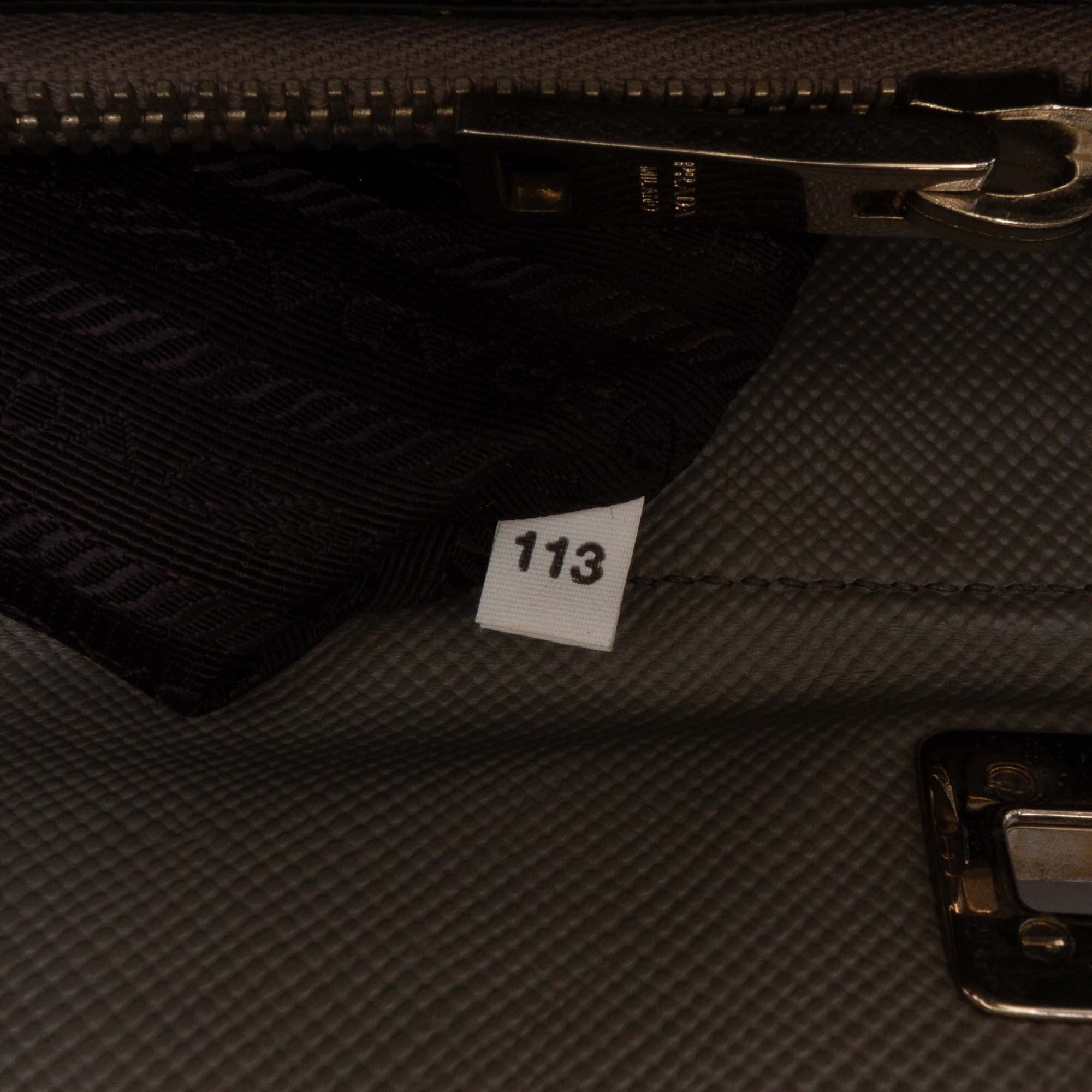 Product Details: Gray Prada Saffiano Cuir Turnlock Twin Satchel. This satchel features a saffiano leather body, rolled leather handles, turn lock closures at the top, and interior zip and slip pockets. 10.2" L x 15.2" W x 7.1" D, 6.3" drop.
