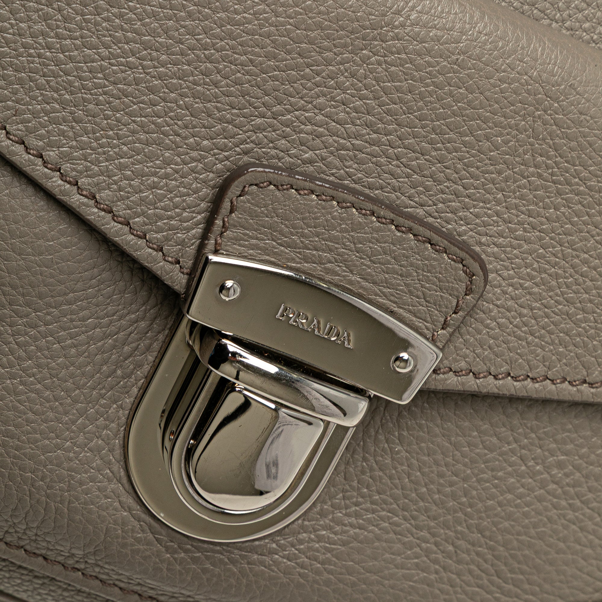 Product Details: Gray Prada Vitello Daino Zip Top Satchel. This satchel features a leather body, rolled handles, a detachable flat leather strap, a top zip closure, an exterior flap pocket with push lock closure, and an interior zip pocket. 6.5" L x 10.4" W x 4.3" D, 5.1" drop.