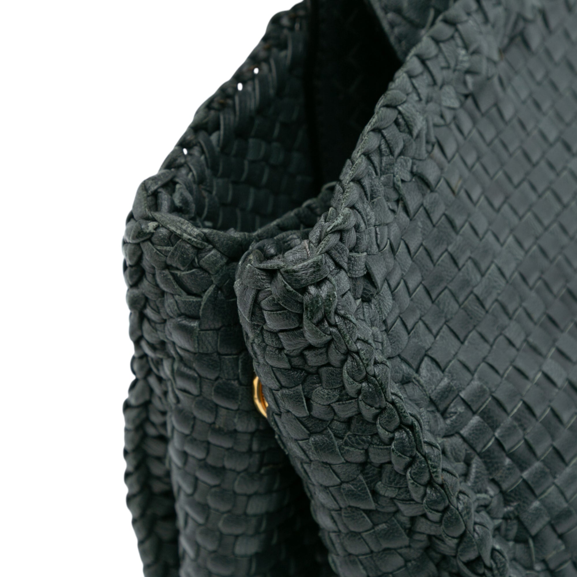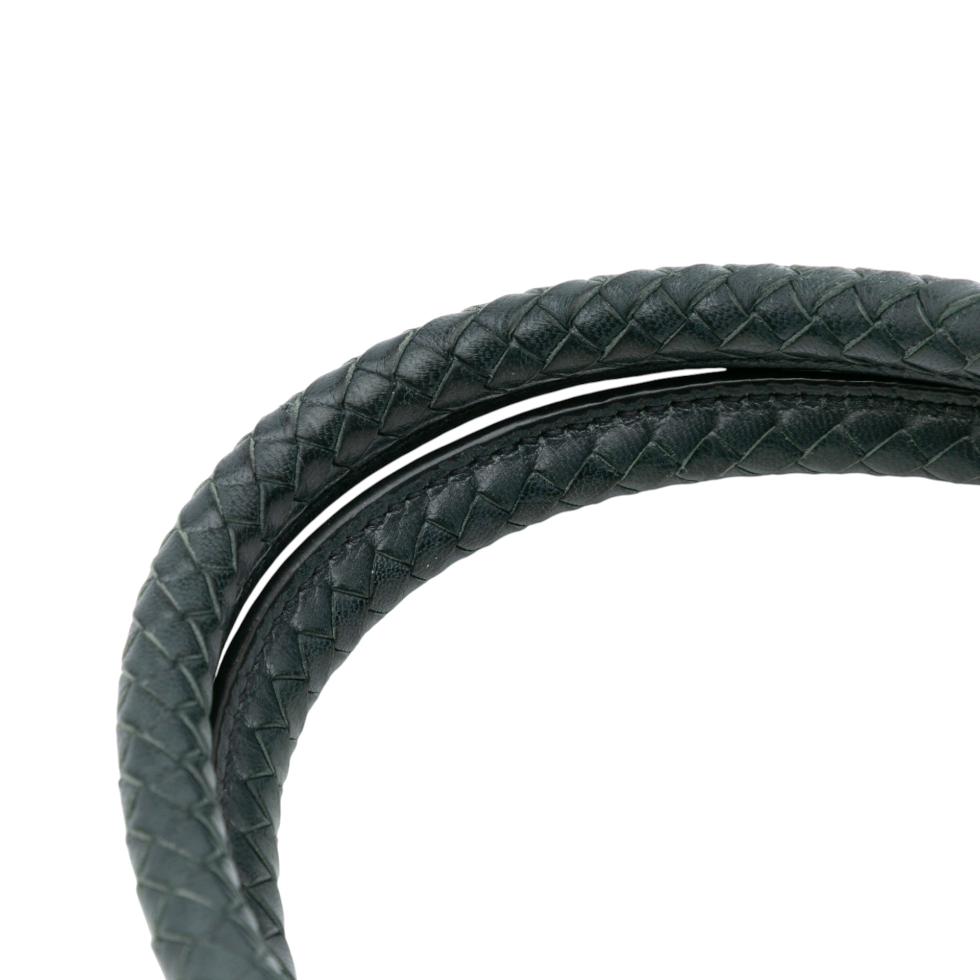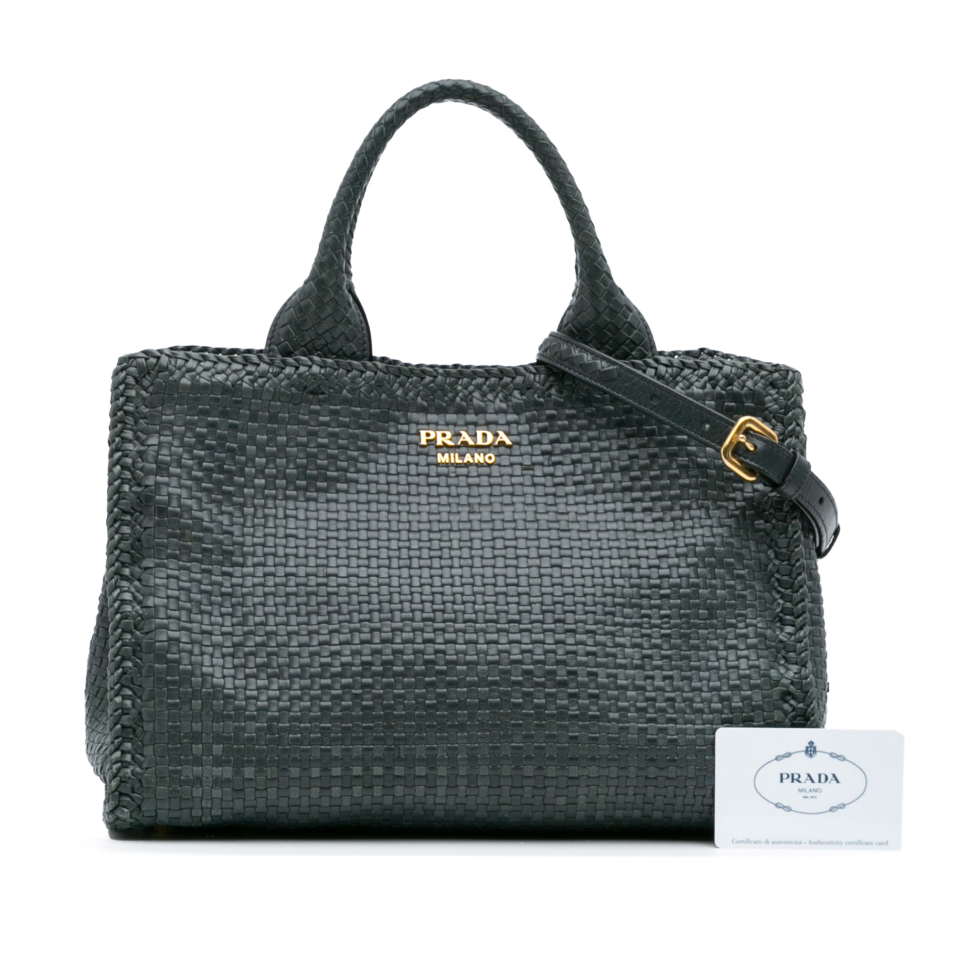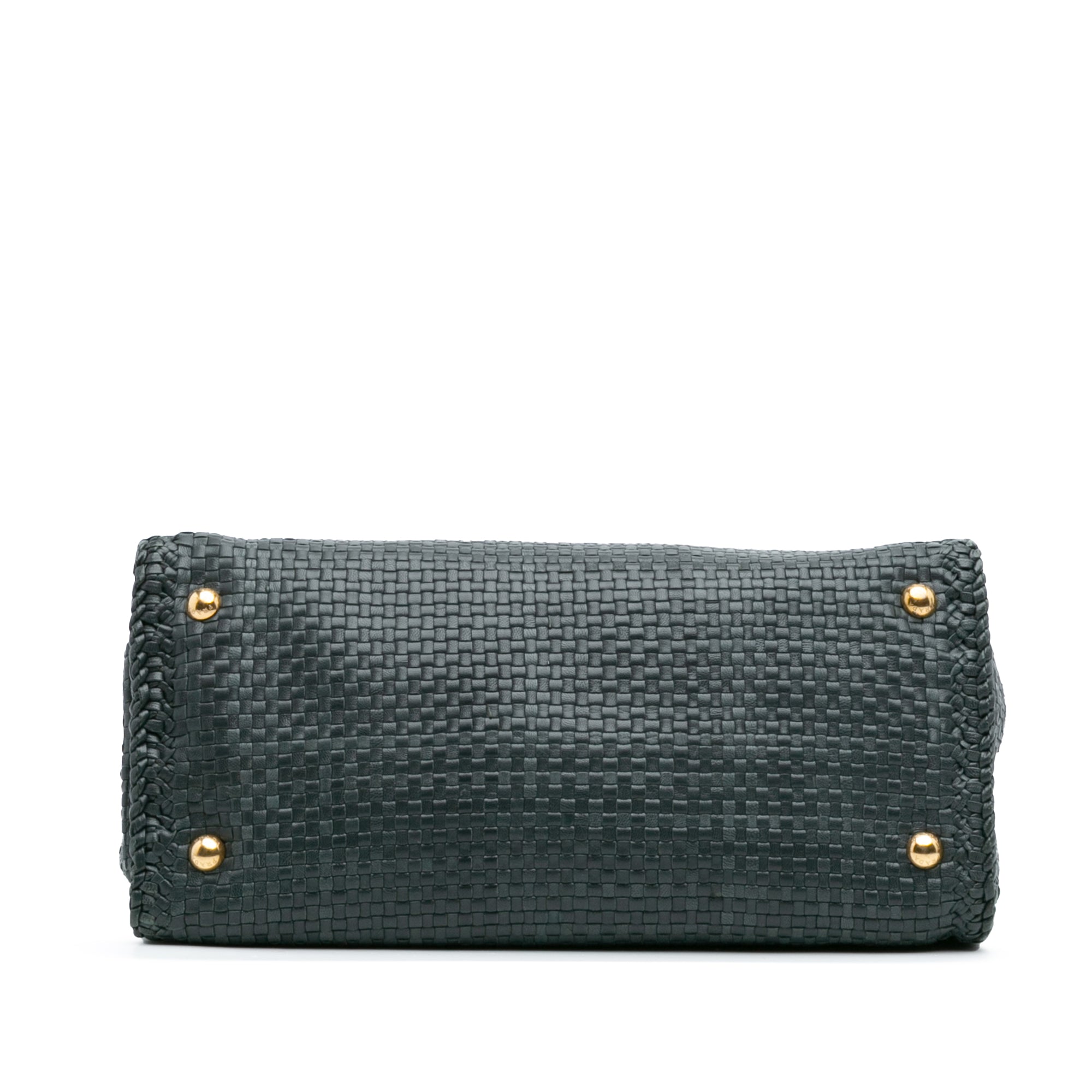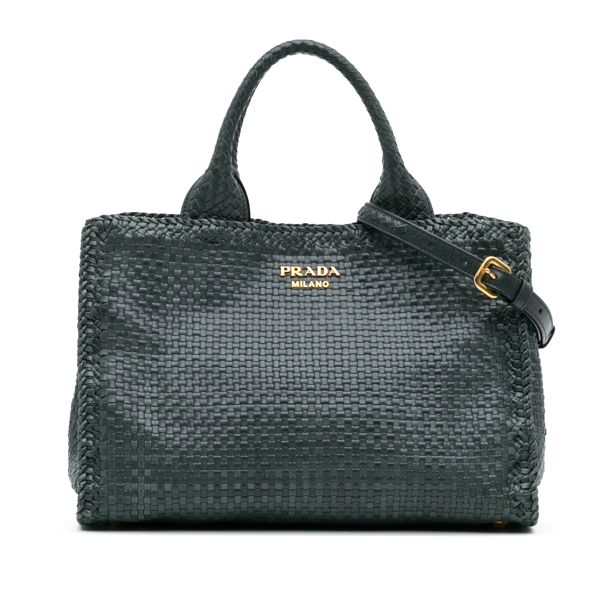 Product Details: Green Prada Goatskin Woven Madras Satchel. This satchel features a woven leather body, rolled leather handles, an adjustable and detachable flat leather strap, an open top with magnetic snap button closure, and interior zip and slip pockets. 9" L x 13" W x 6" D, 4.7" drop.