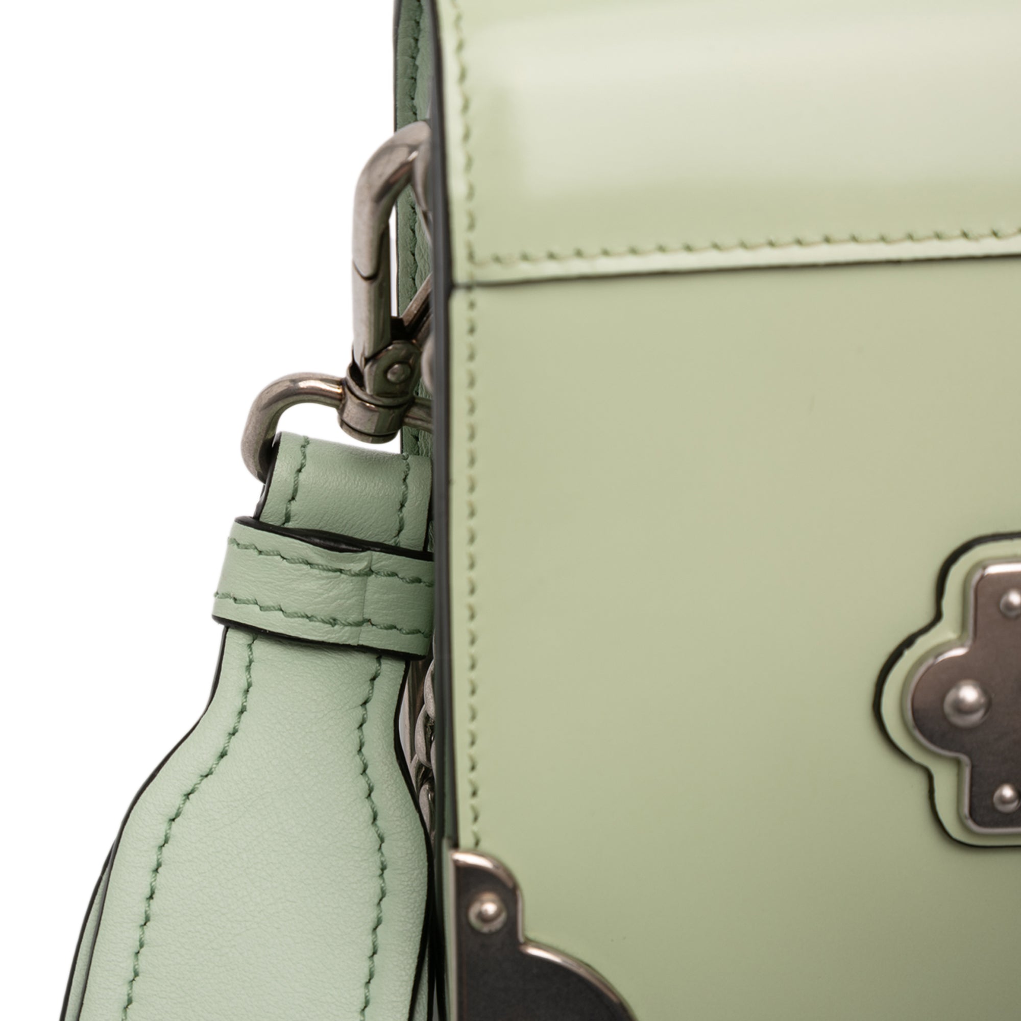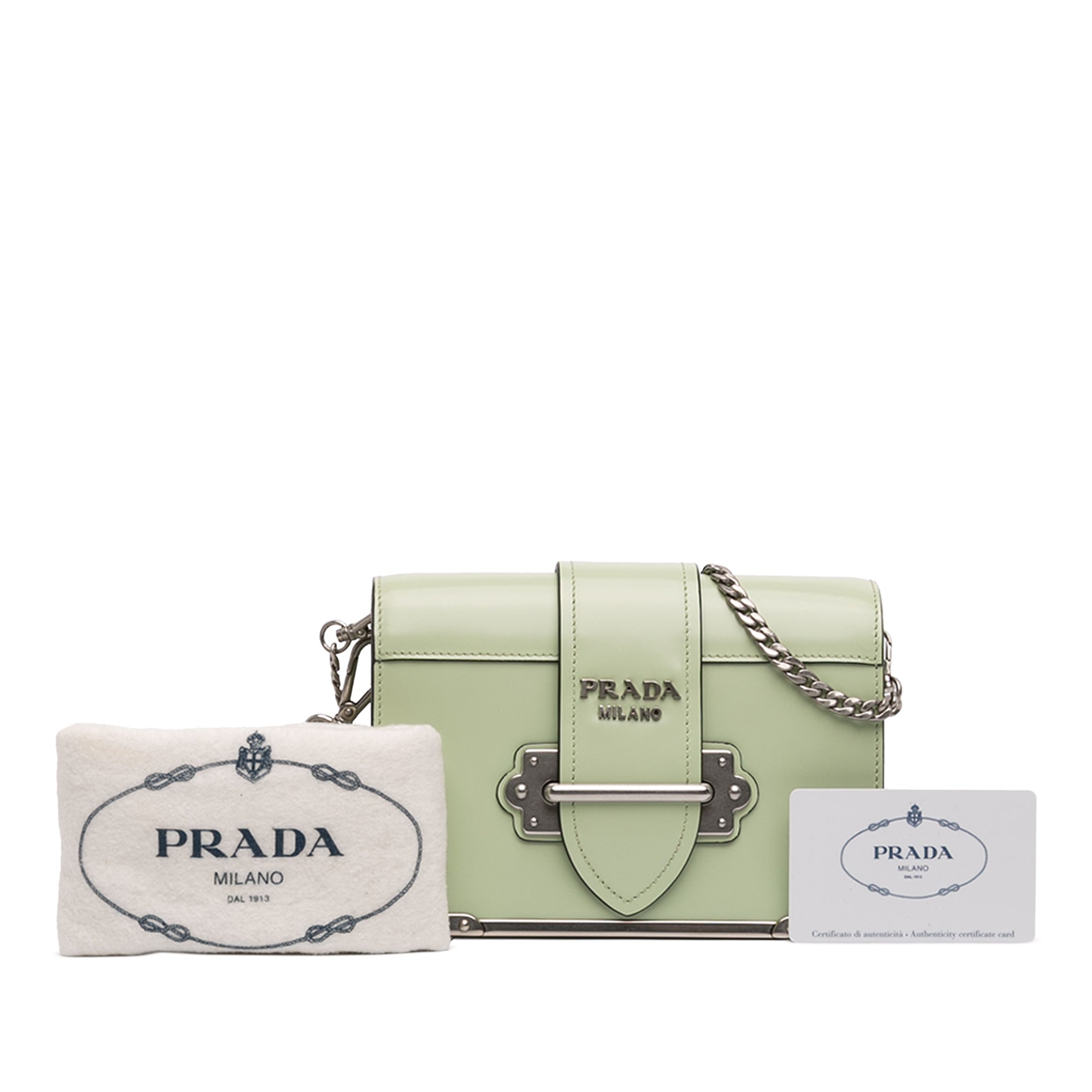 Product Details: Green Prada Spazzolato Soft Calfskin Cahier Crossbody. The Cahier crossbody bag features a patent leather body, a detachable chain-link shoulder strap, and a front flap with pull-through closure. 4.7" L x 7.1" W x 2" D, 4.7" drop.