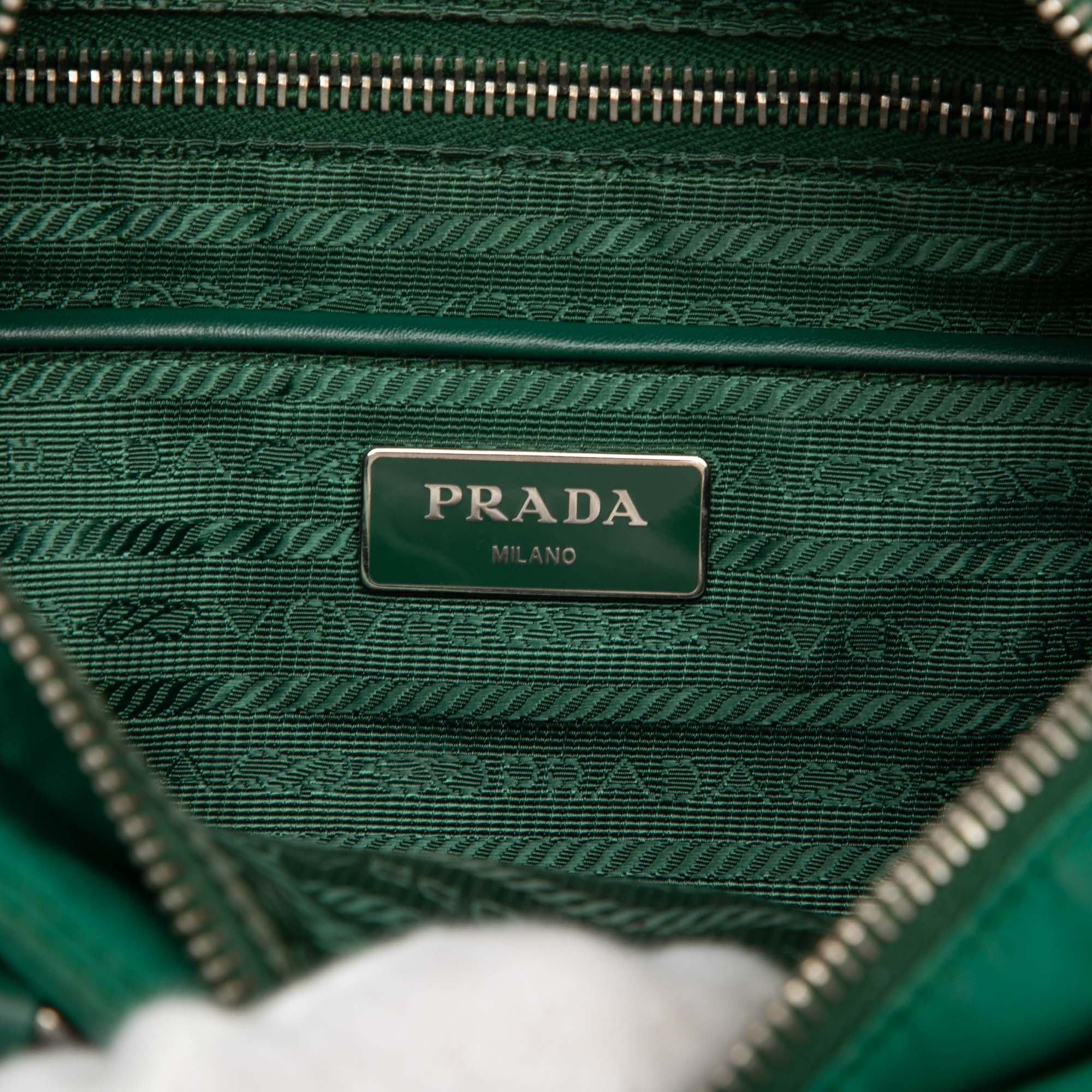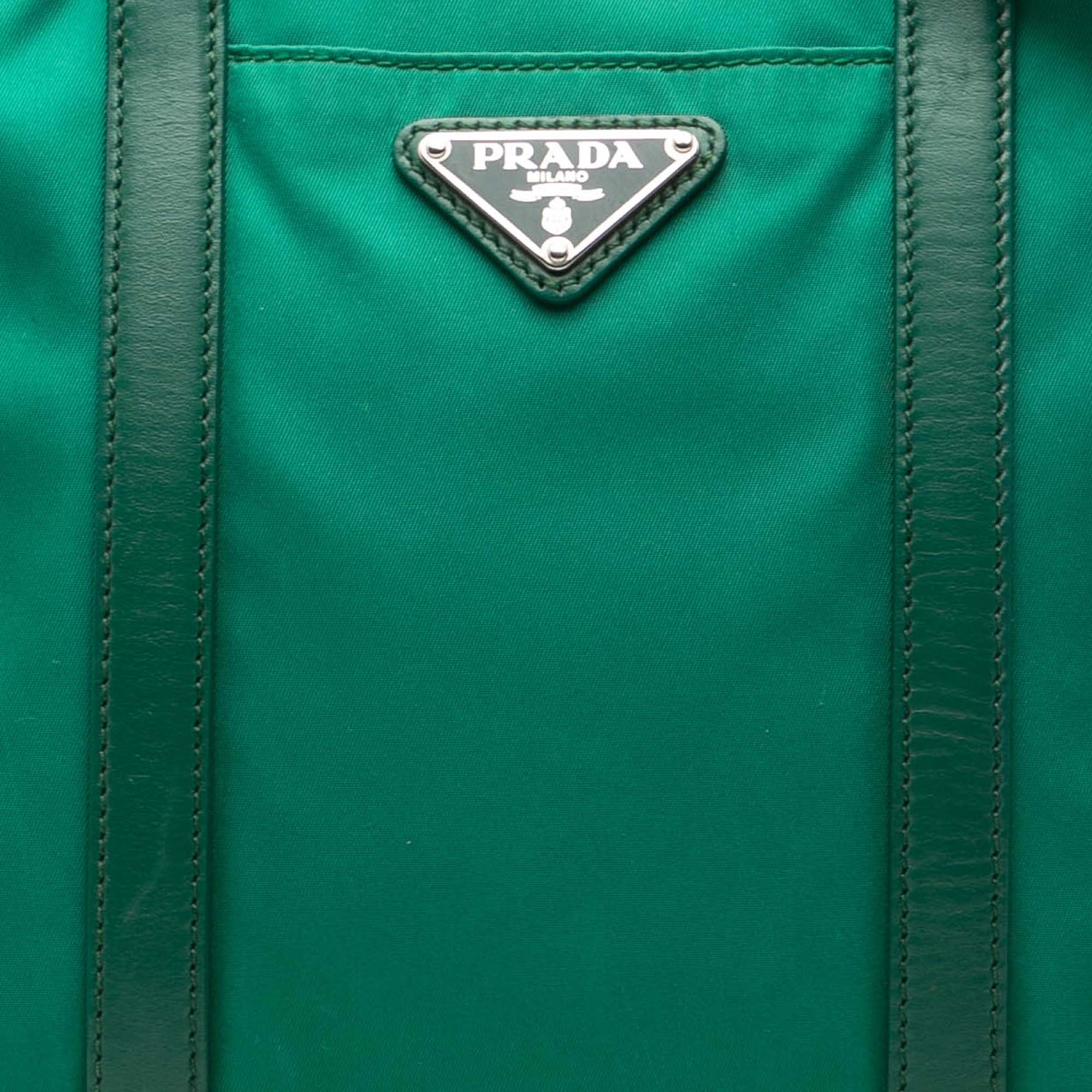 Product Details: Green Prada Tessuto Convertible Tote Satchel. This satchel features a nylon body with leather trim, flat leather handles, a detachable and adjustable flat strap, a top zip closure, exterior front and back slip pockets, and interior zip and slip pockets. 8.9" L x 10.6" W x 4.3" D, 3" drop.