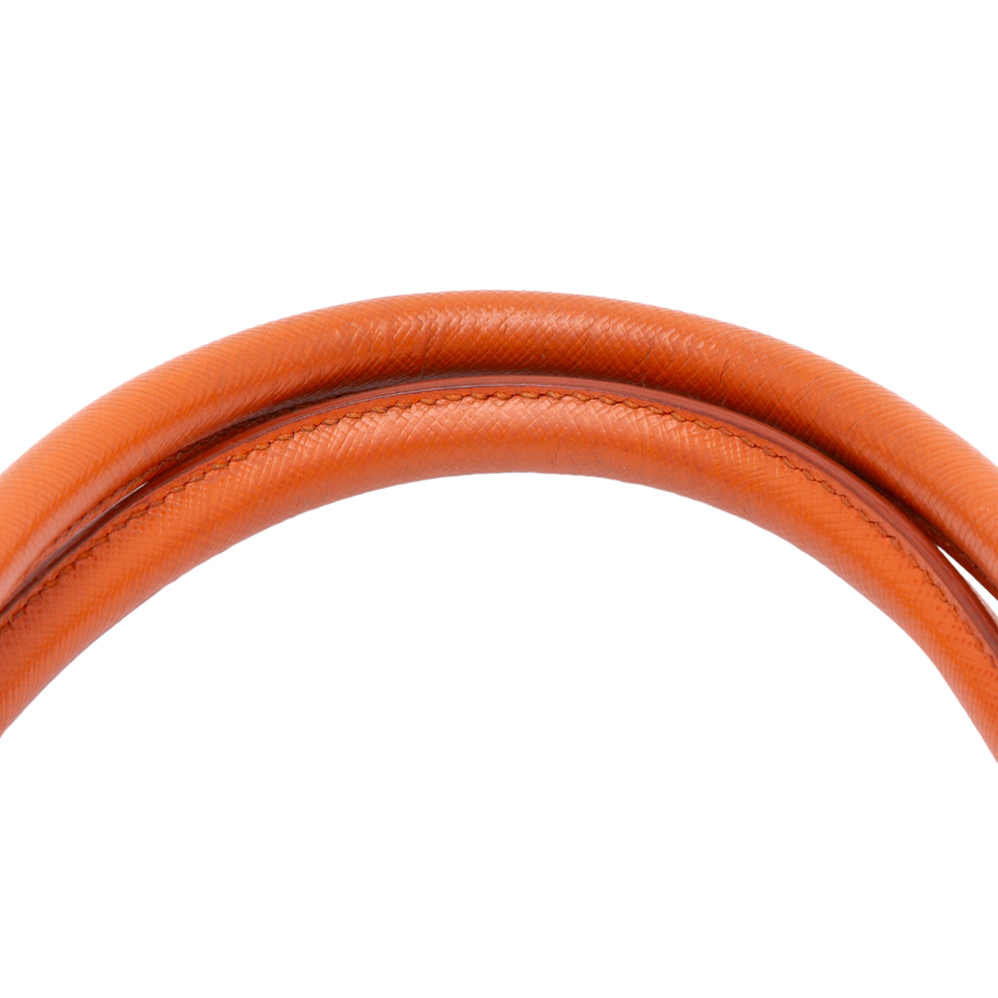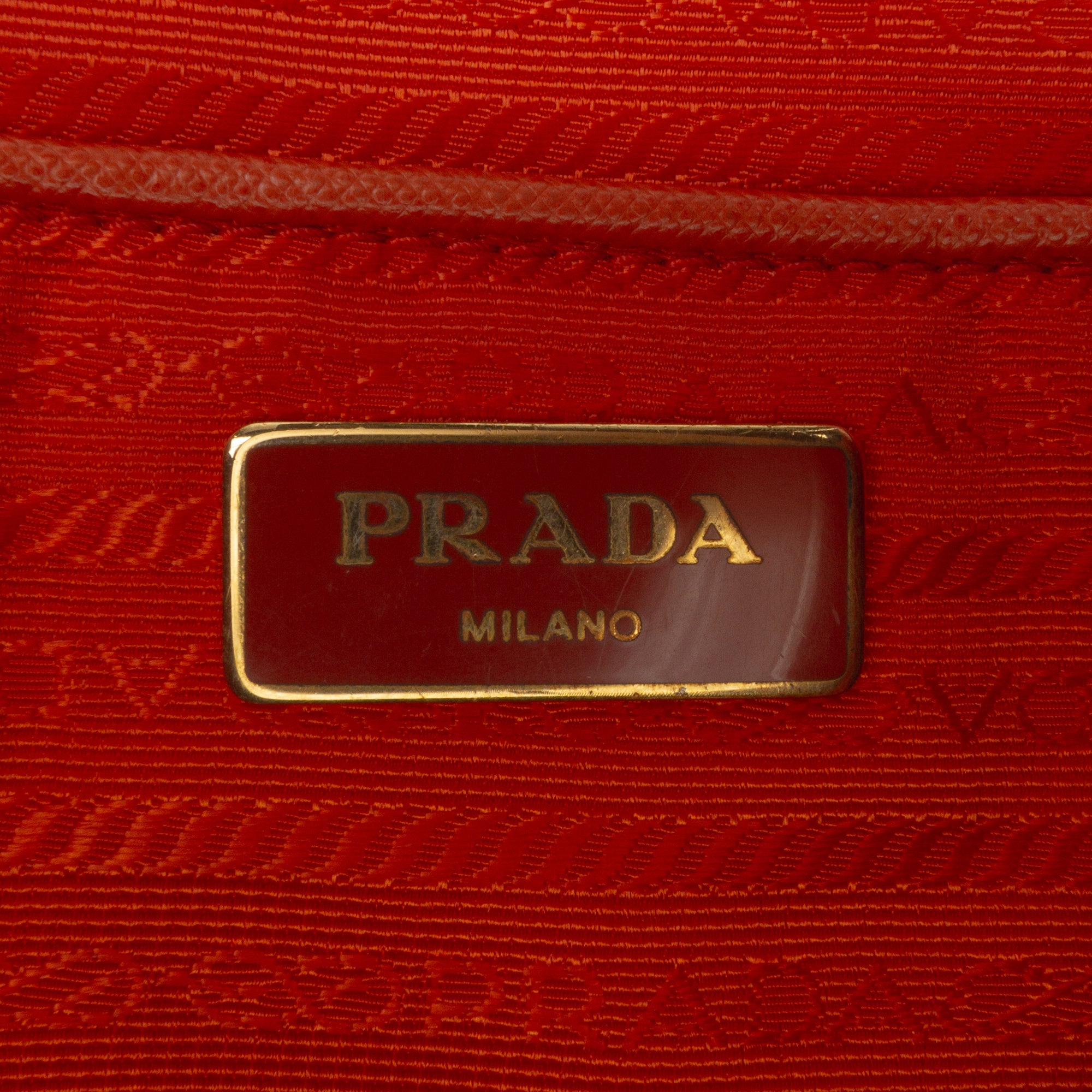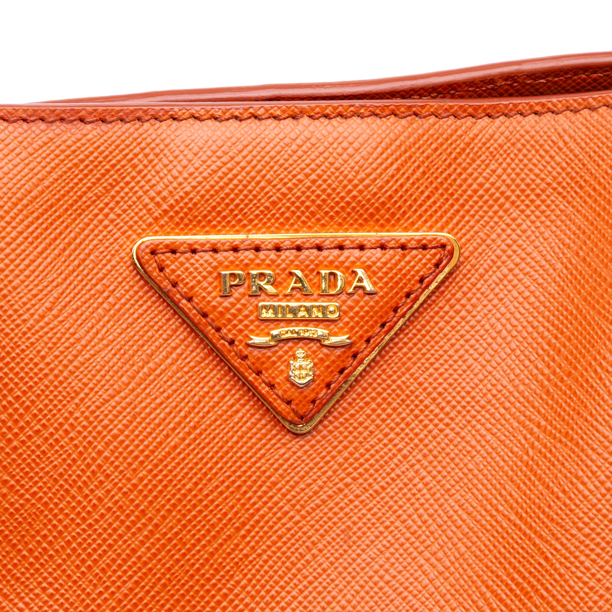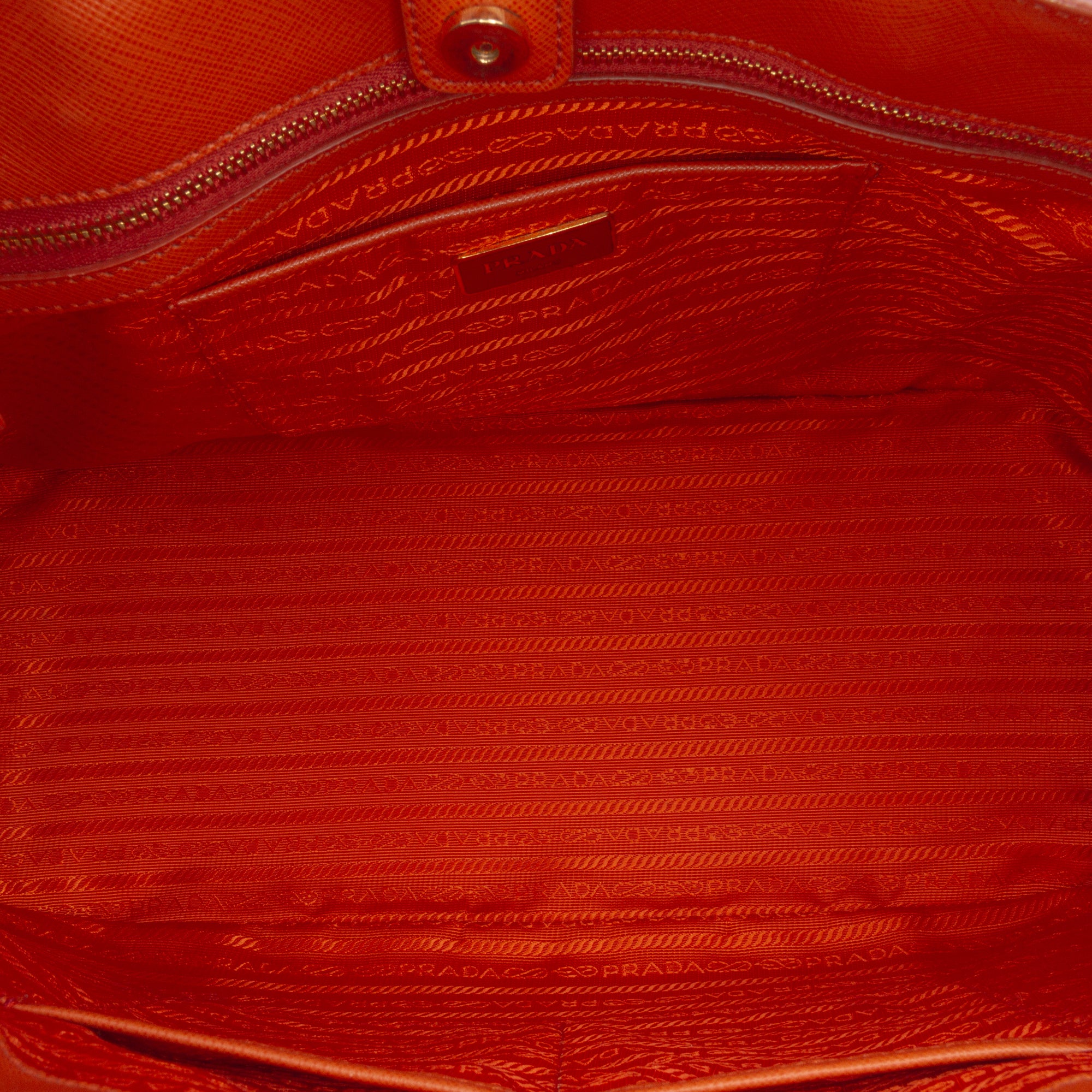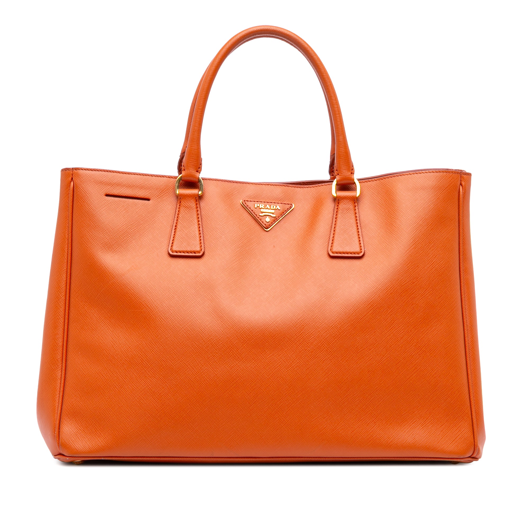 Product Details: Orange Prada Large Saffiano Lux Galleria Tote. The Galleria bag features a saffiano leather body, rolled handles, an open top with magnetic snap closure, and interior zip and slip pockets. Handles has been repainted. 10.2" L x 14.8" W x 7.1" D, 5.3" drop.