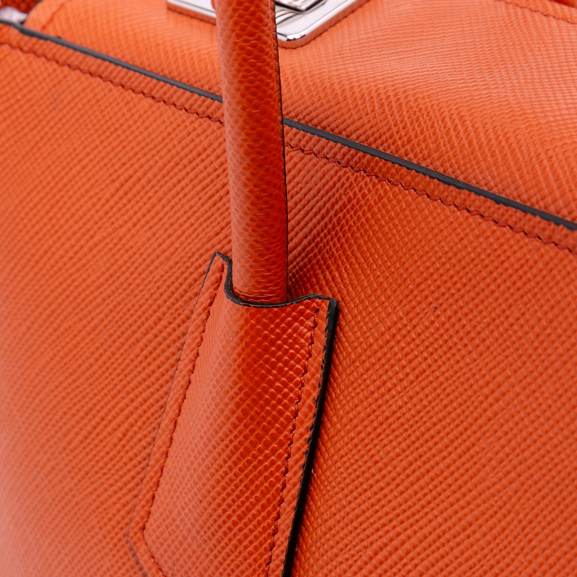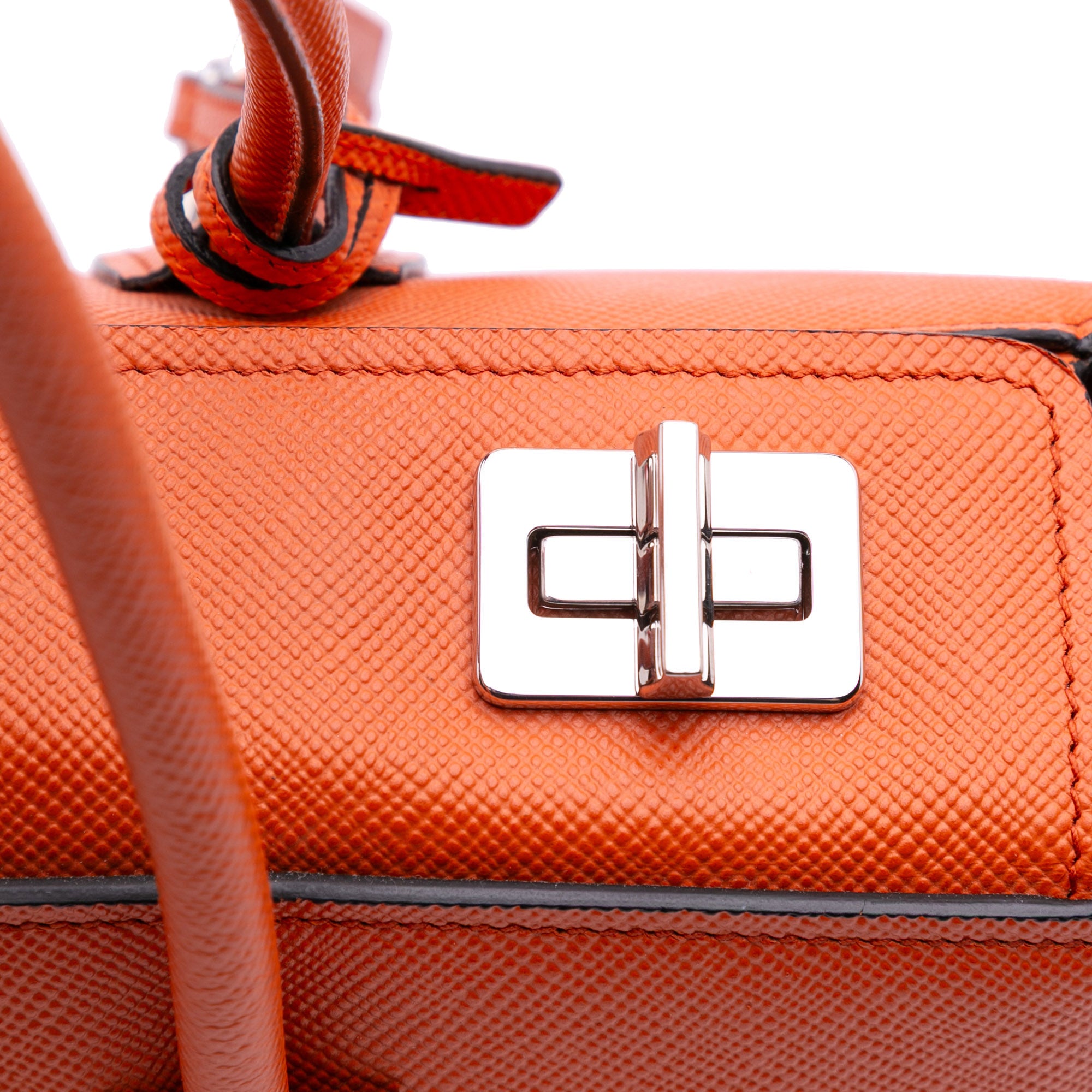 Product Details: Orange Prada Saffiano Cuir Turnlock Twin Satchel. This satchel features a saffiano leather body, rolled leather handles, top turn lock closures, and interior zip and slip pockets. 10.2" L x 15" W x 7.5" D, 6.7" drop.