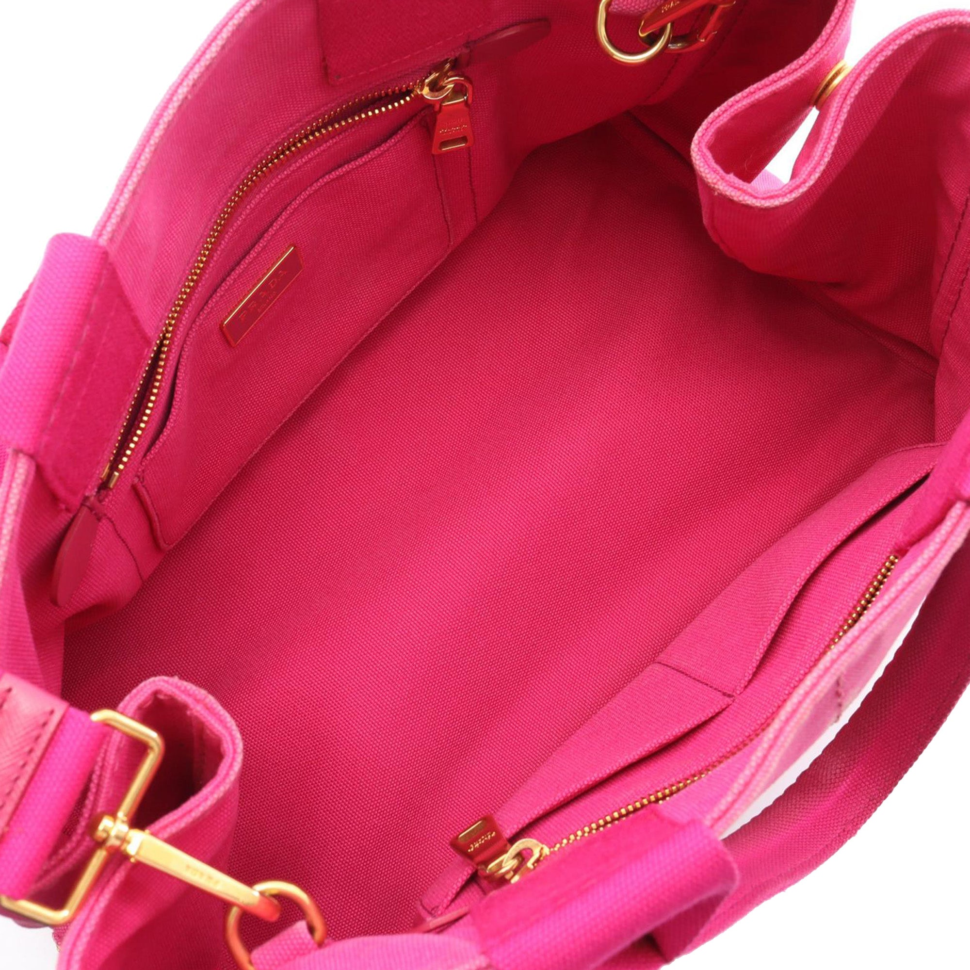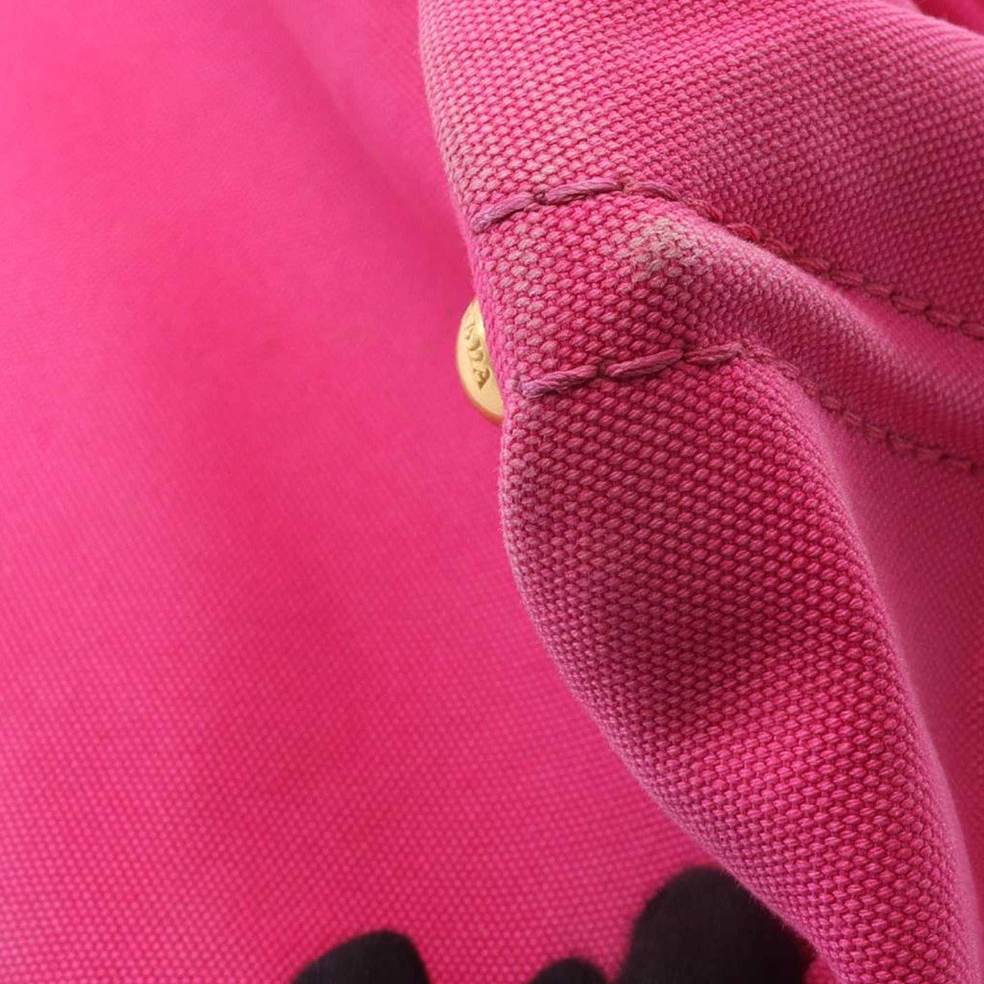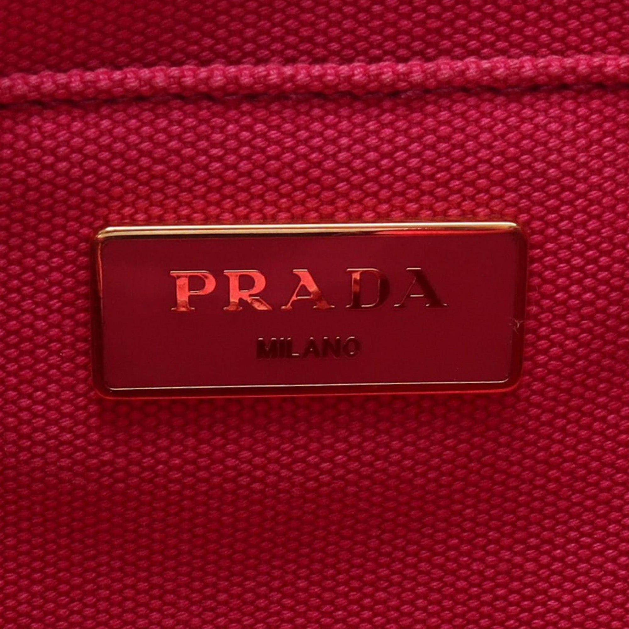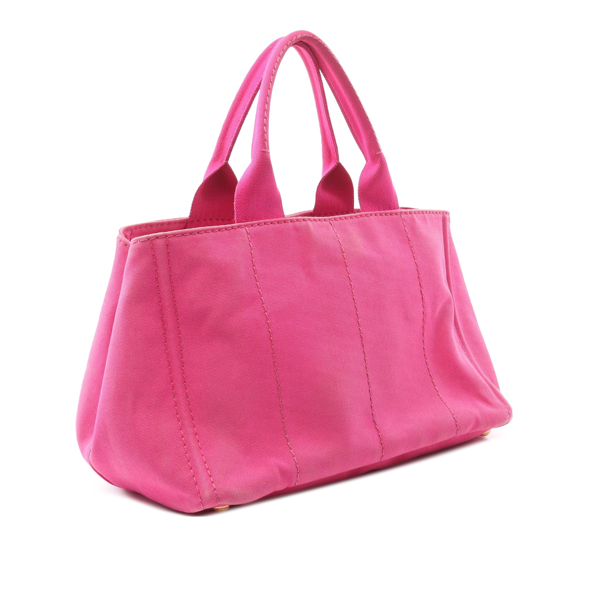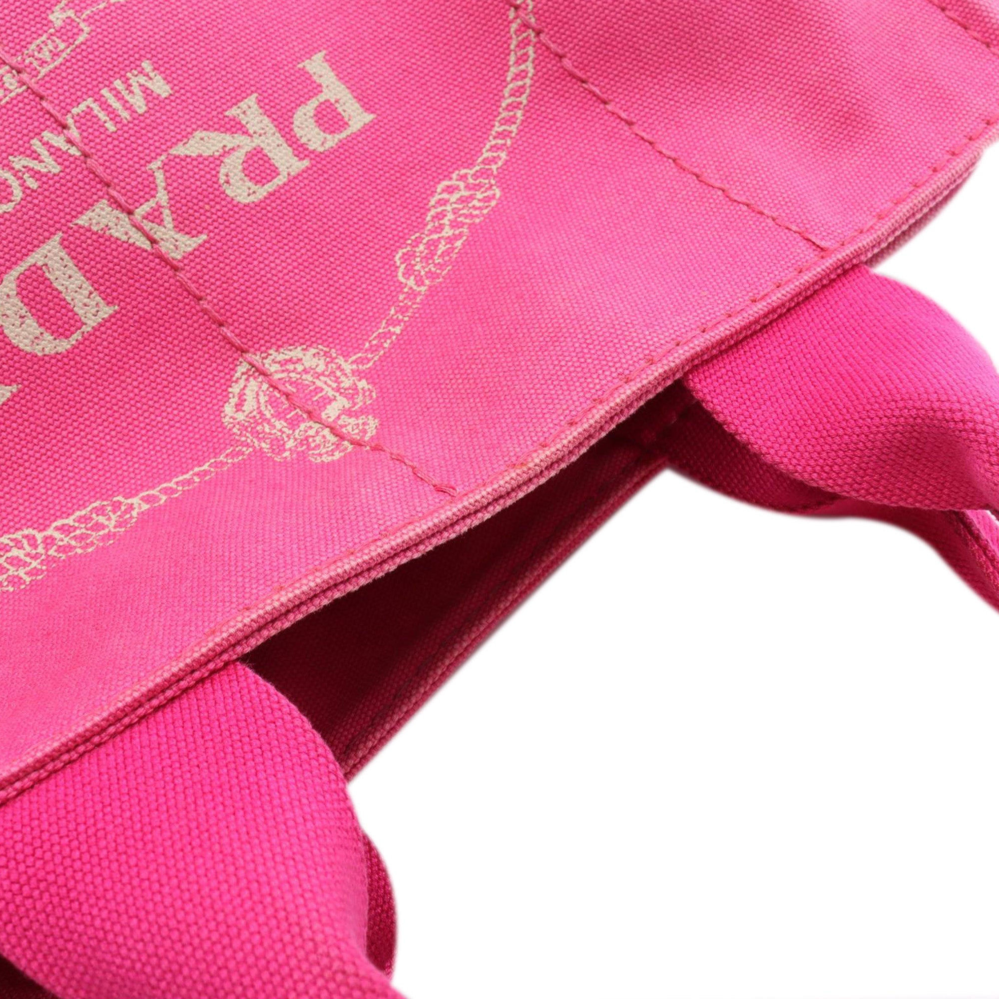 Product Details: Pink Prada Canvas Canapa Logo Satchel. This satchel features a canvas body, rolled handles, detachable flat strap, an open top, and interior zip and slip pockets. 9.1" L x 13.8" W x 8.7" D, 6.7" drop.