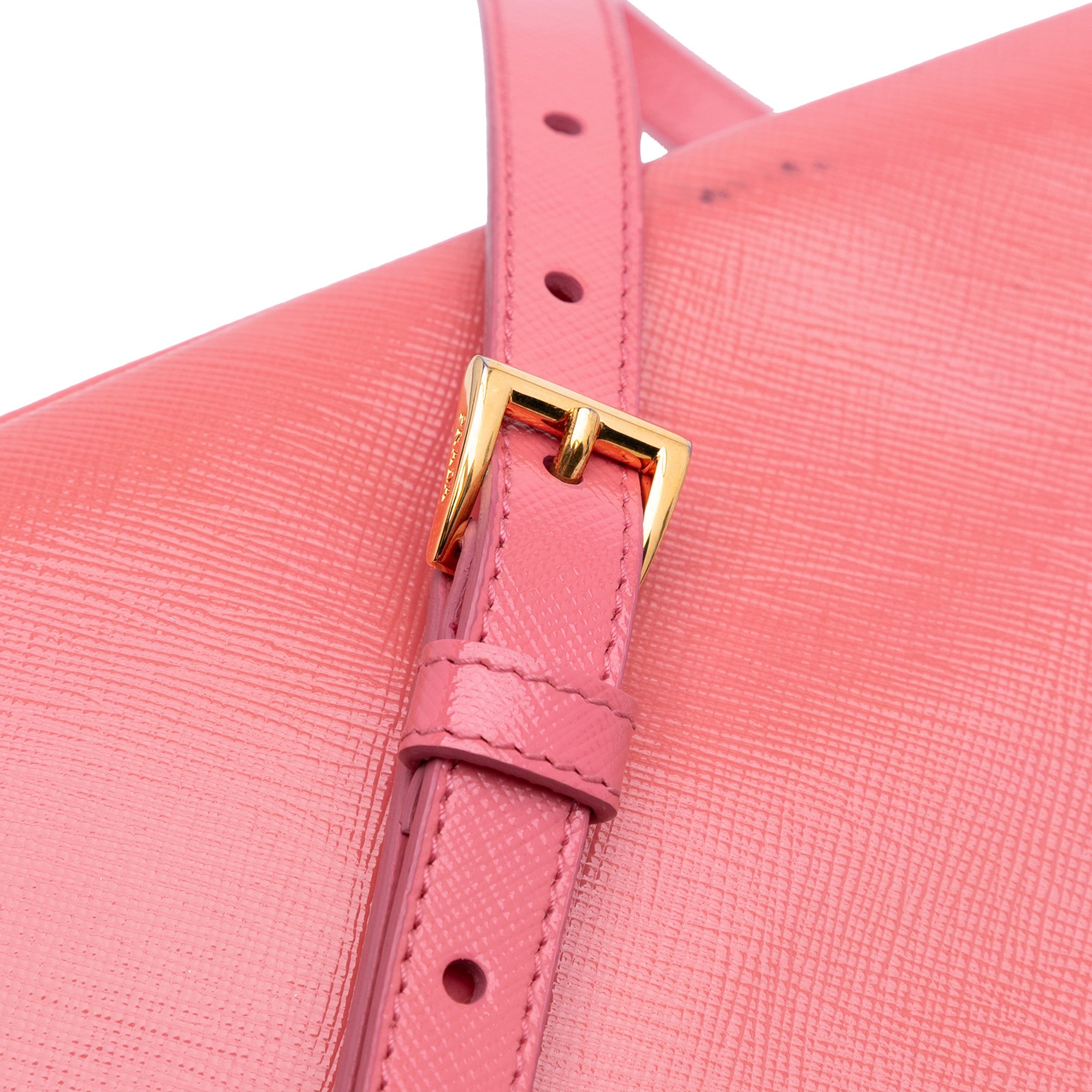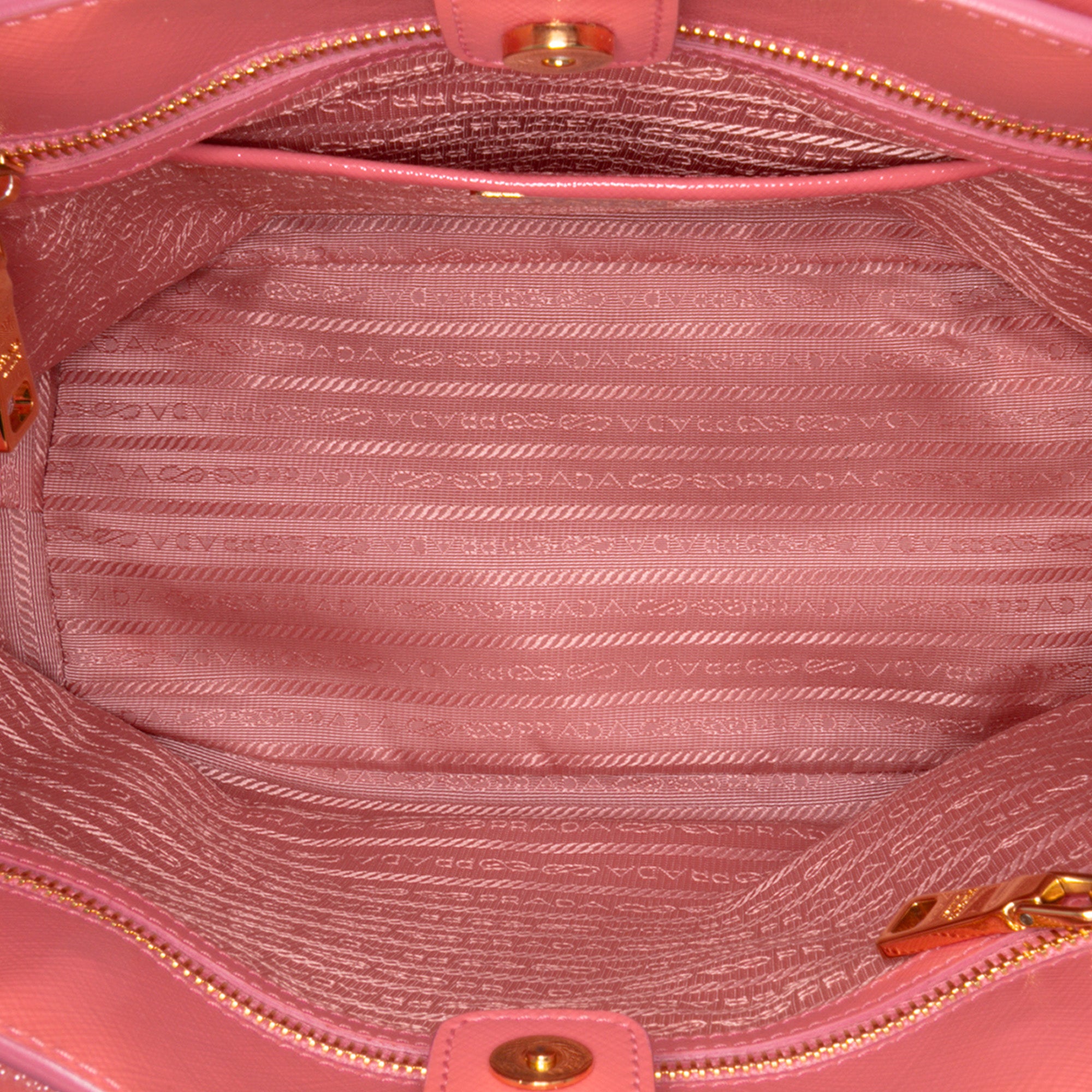 Product Details: Pink Prada Saffiano Vernice Satchel. This satchel features a leather body, rolled leather handles, a detachable flat leather strap, an open top with a magnetic snap button closure, and interior zip and slip pockets. 9.4" L x 11" W x 5.5" D, 4.3" drop.
