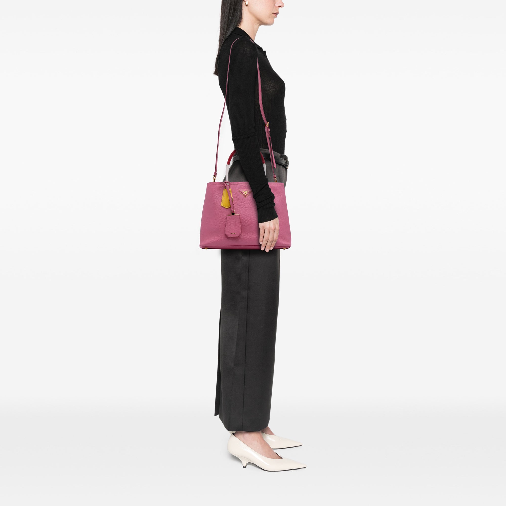 Product Details: Pink Prada Small Bicolor Saffiano Cuir Double Satchel. This satchel features a saffiano leather body, rolled leather handles, a detachable flat leather shoulder strap, an open top, and an interior flap pocket. 9.1" L x 12.6" W x 5.7" D, 5.5" drop.