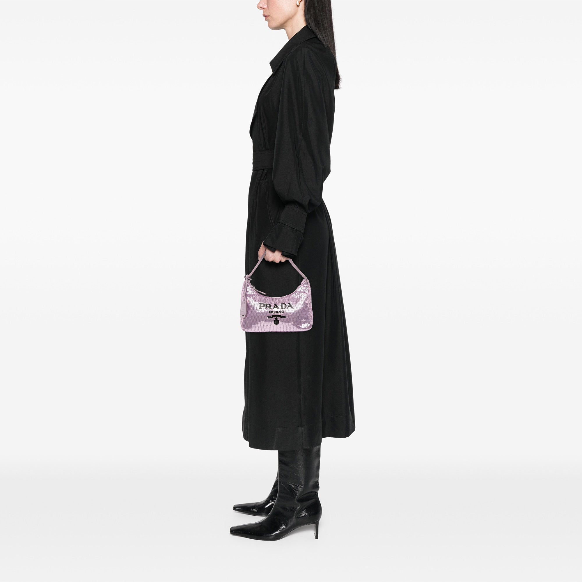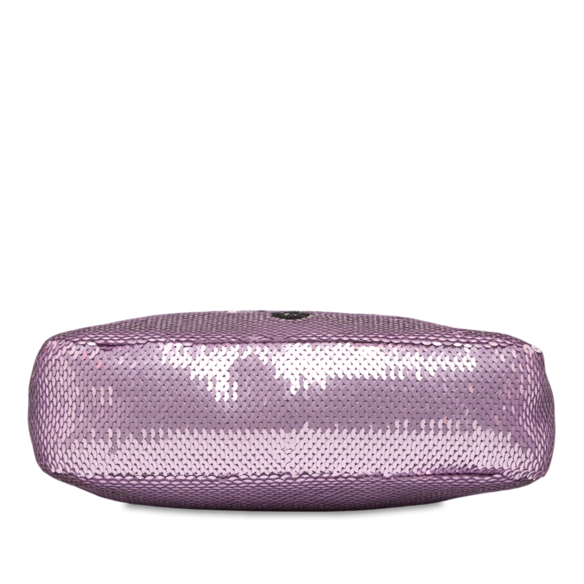 Product Details: Purple Prada Mini Re Nylon Paillettes Sequin Re Edition 2000 Shoulder Bag. This shoulder bag features a sequined nylon body, a flat nylon strap, and a top zip closure. 4.5" L x 8.7" W x 2.4" D, 6.1" drop.