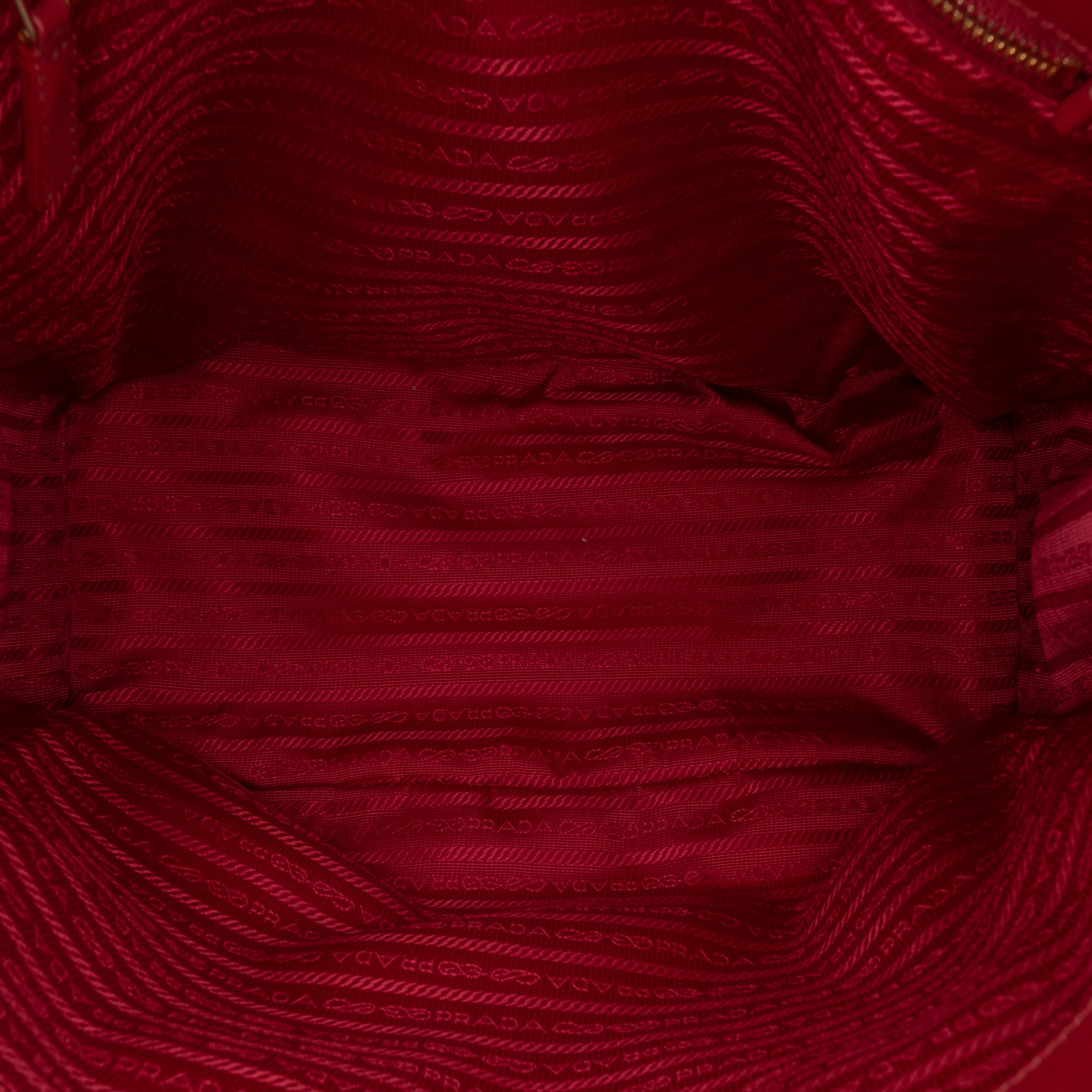 Product Details: Red Prada Large Saffiano Lux Galleria Double Zip Satchel. The Galleria features a saffiano leather body, rolled leather handles, an open top, dual zip compartments, and interior zip and slip pockets. Exterior top has been repainted. 10.2" L x 14" W x 5.9" D, 4.3" drop.
